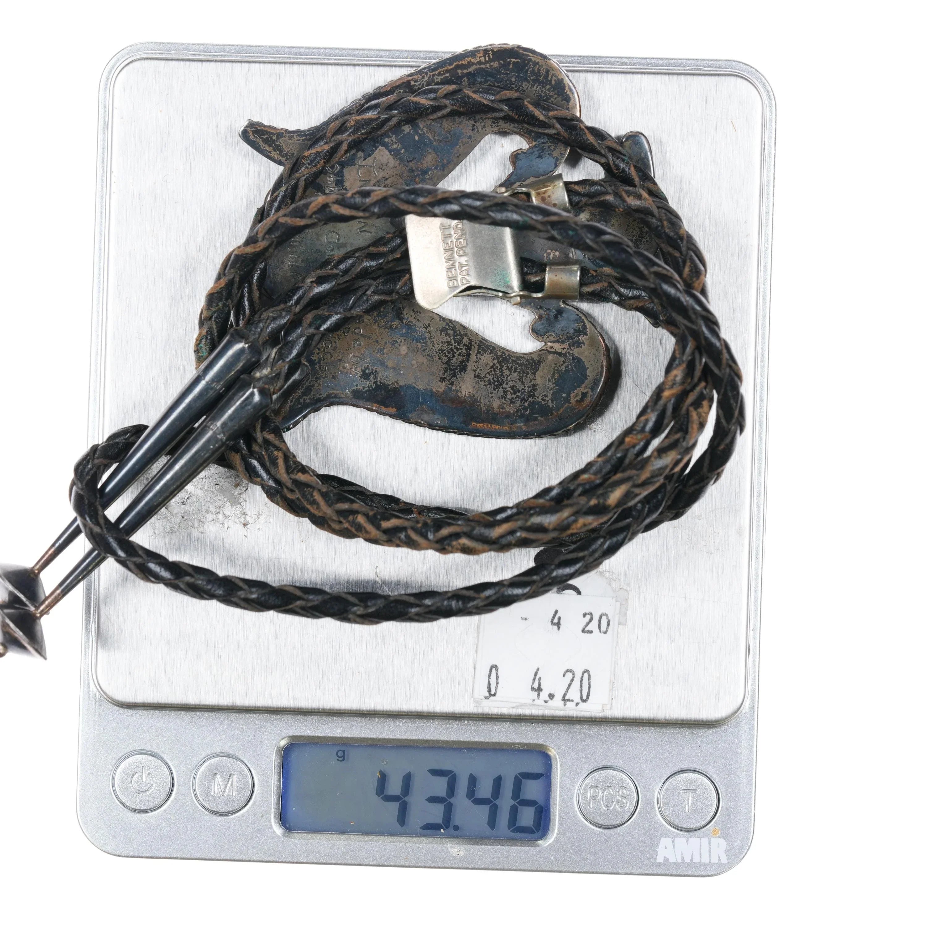 c1970 Large Zuni Bobby and Corraine Shack sterling silver thunderbird bolo tie . Solid sterling silver slide and tips. Weight and measurements in pics. 38" long. Expected wear with no apparent damage. Weight shown is just the entire bolo, if there is a tray pictured it will be tared out of course.