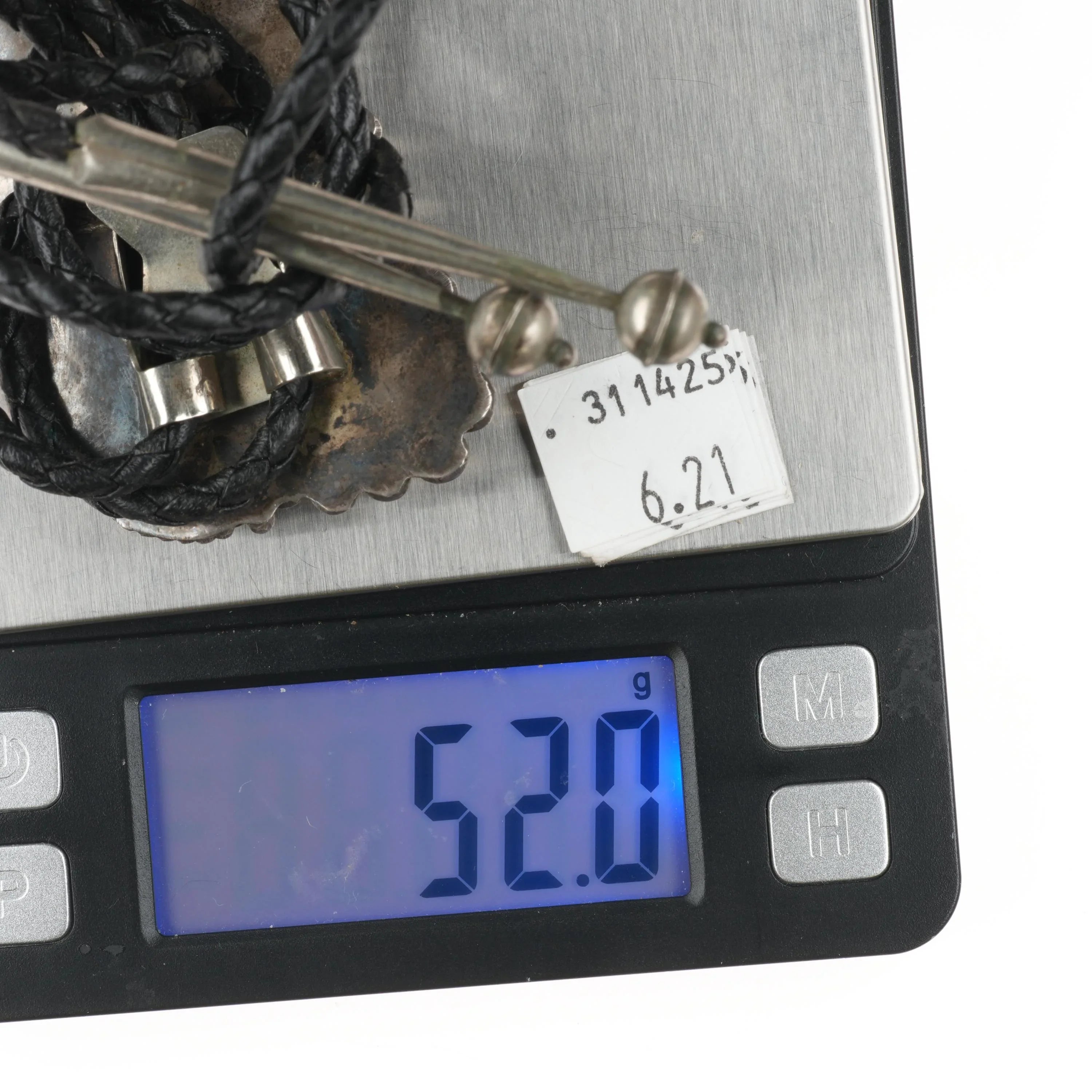 c1980 AK Navajo Large sterling silver, turquoise/coral bolo tie. Tested and guaranteed solid sterling silver slide and tips. Weight and measurements in pictures. Great bolo, 36" long with no issues. Tray is tared out, so weight shown is just the bolo of course.