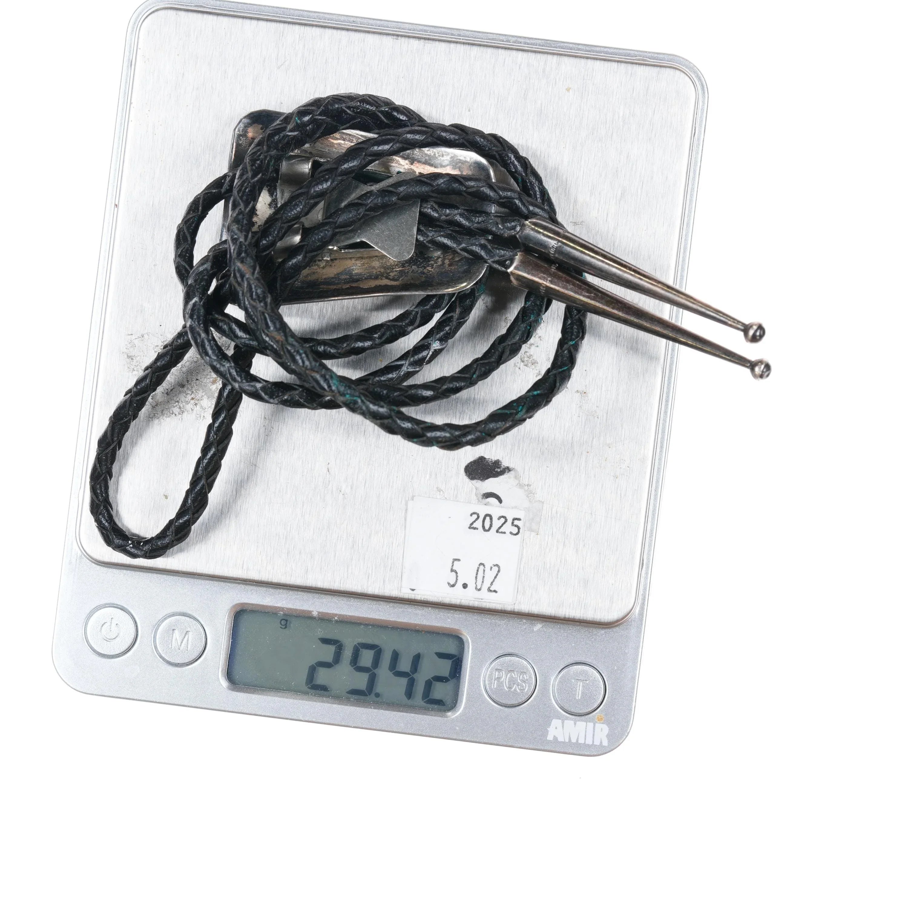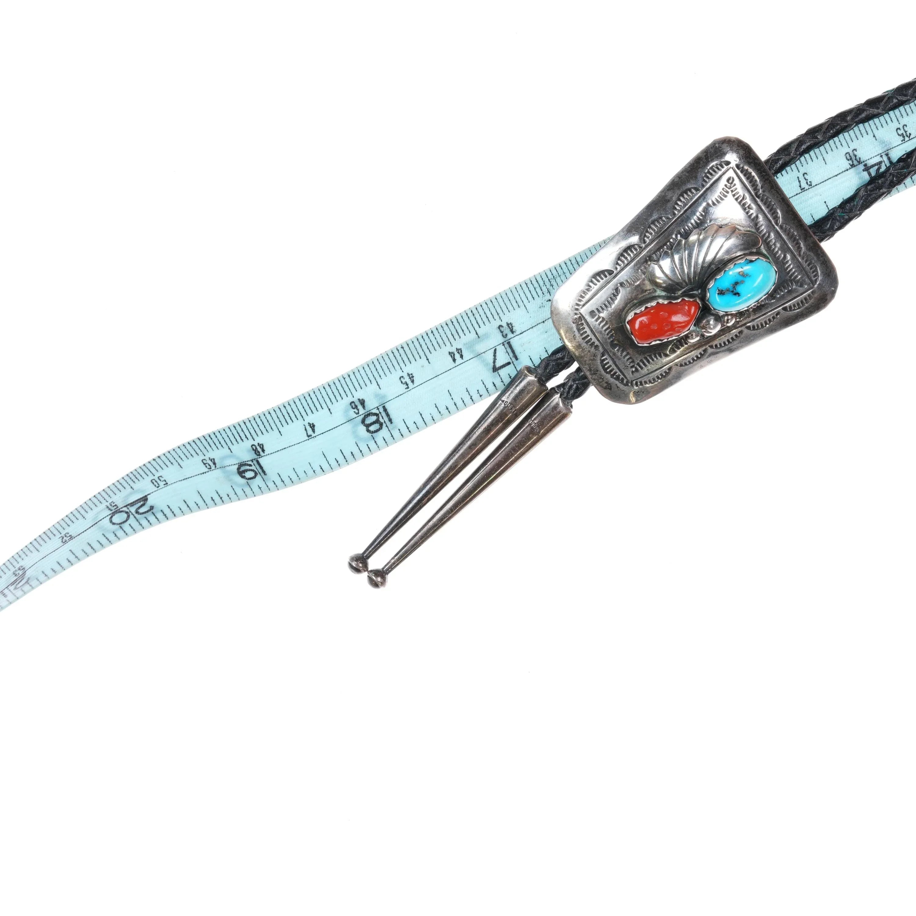 c1980 Navajo sterling silver turquoise, and coral bolo tie with leaf design. Weight and measurements in pics. 38" long. No damage or significant wear, solid sterling silver slide and tips sterling mark.