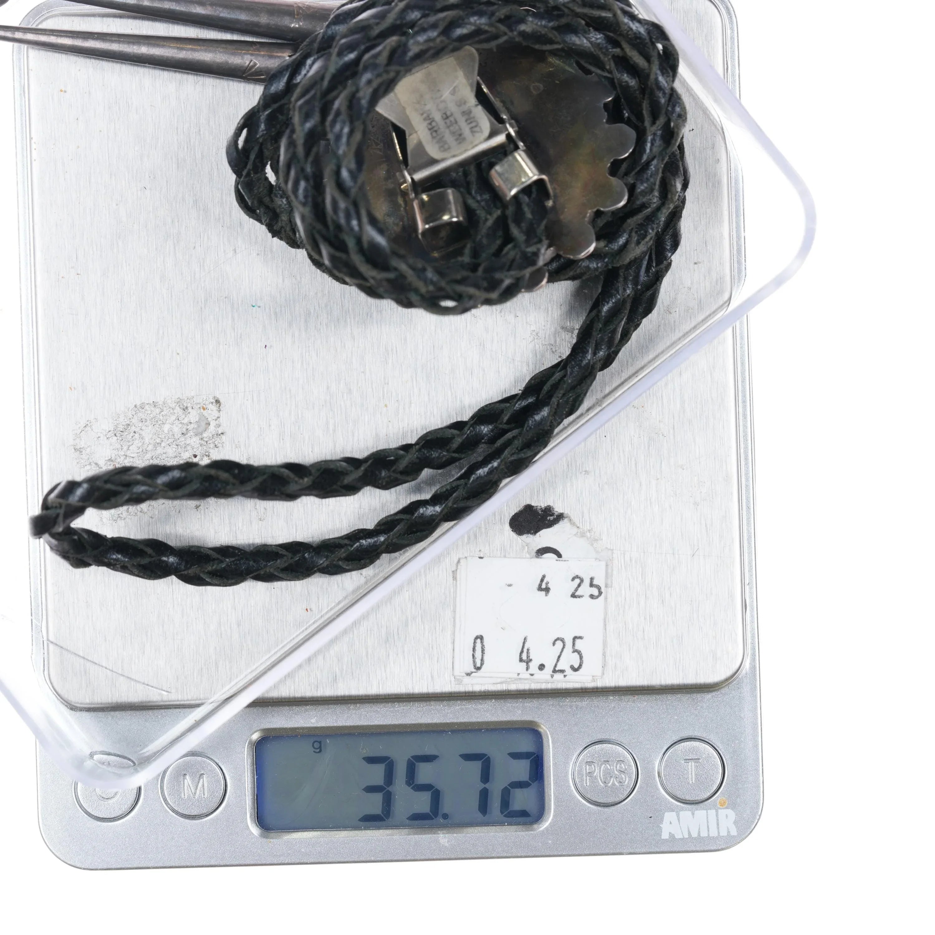 c1980‘s Barbara Dewa Zuni carved sunface bolo tie sterling silver. Solid sterling silver slide and tips. Weight and measurements in pics. 38" long. Expected wear with no apparent damage. Weight shown is just the entire bolo, if there is a tray pictured it will be tared out of course. Nice bolo from the last quarter of the 20th century.