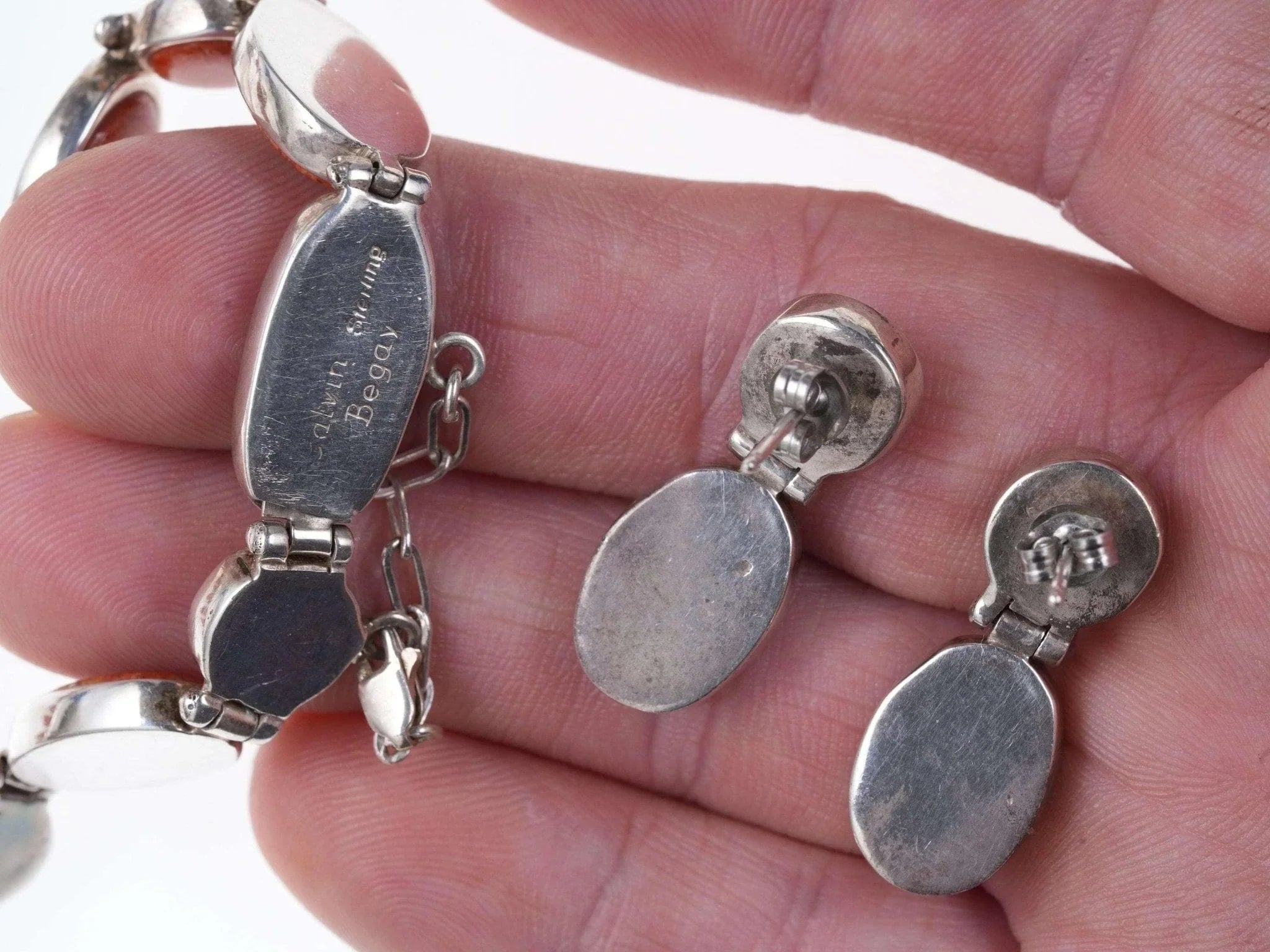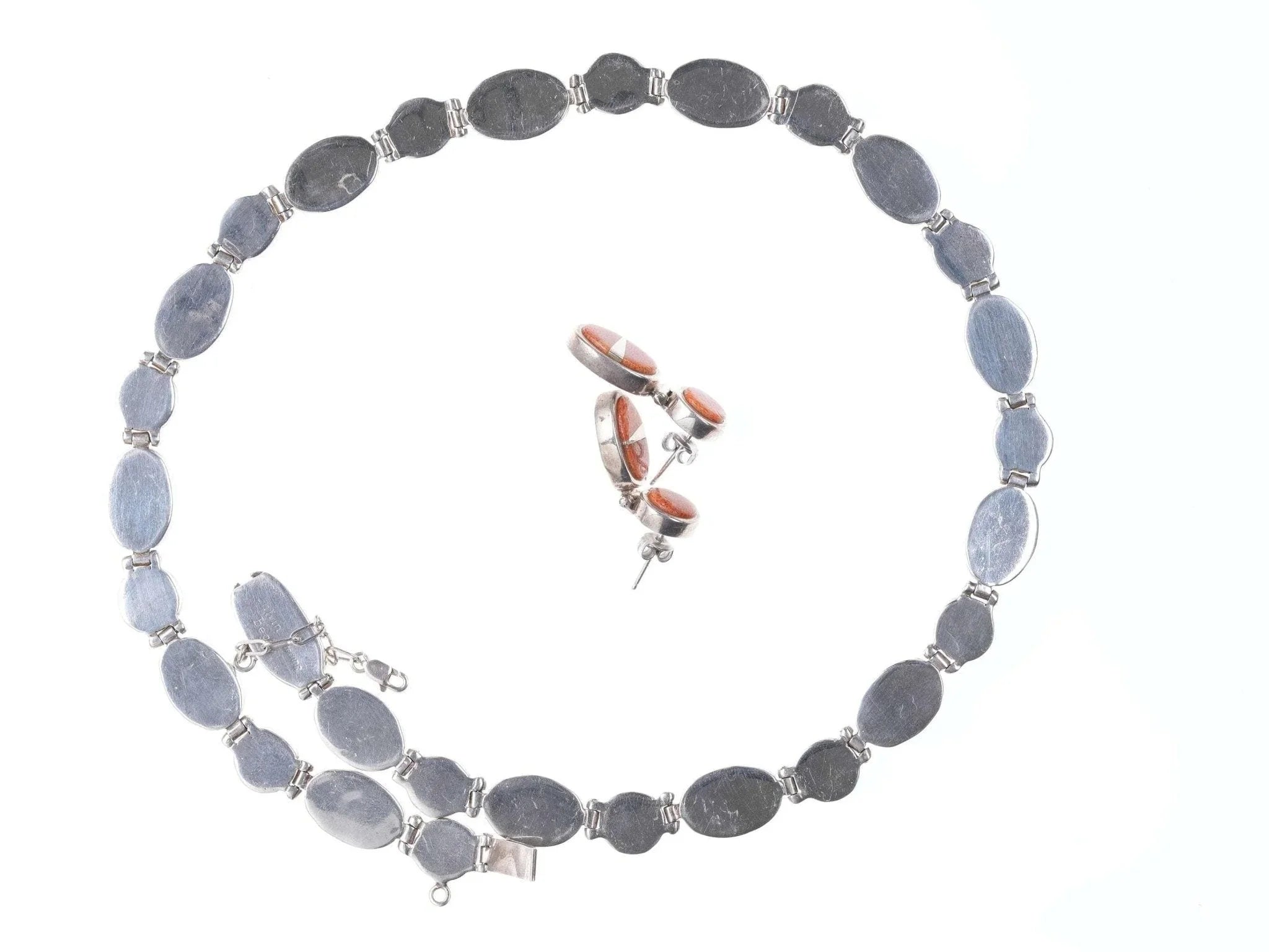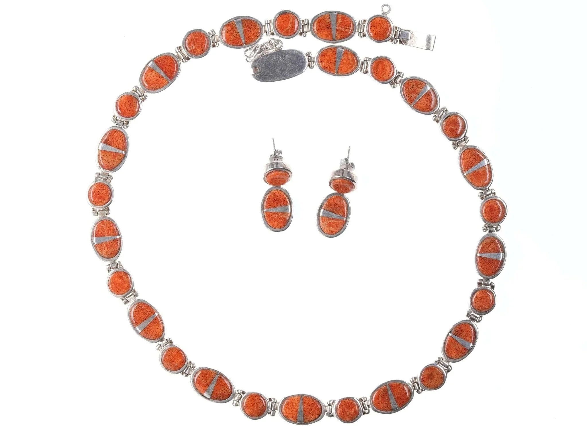 Calvin Begay Navajo Sponge Coral Sterling Channel Inlay Halskette und Ohrringe. Sehr ungewöhnliches Set ohne Beschädigungen oder Probleme. 18,5 Zoll lange Halskette und 1 1/8 Zoll lange Ohrringe. Insgesamt 88 Gramm.