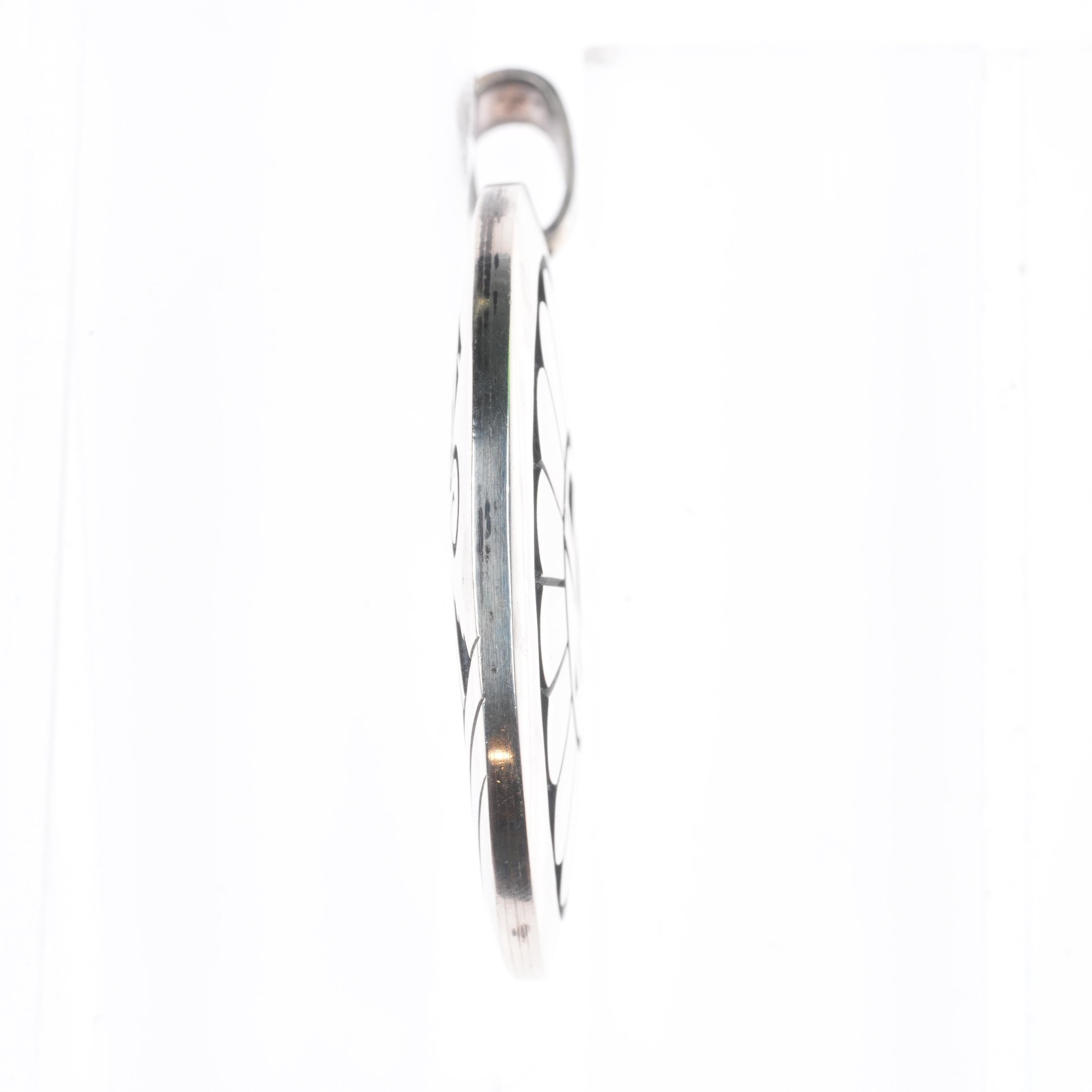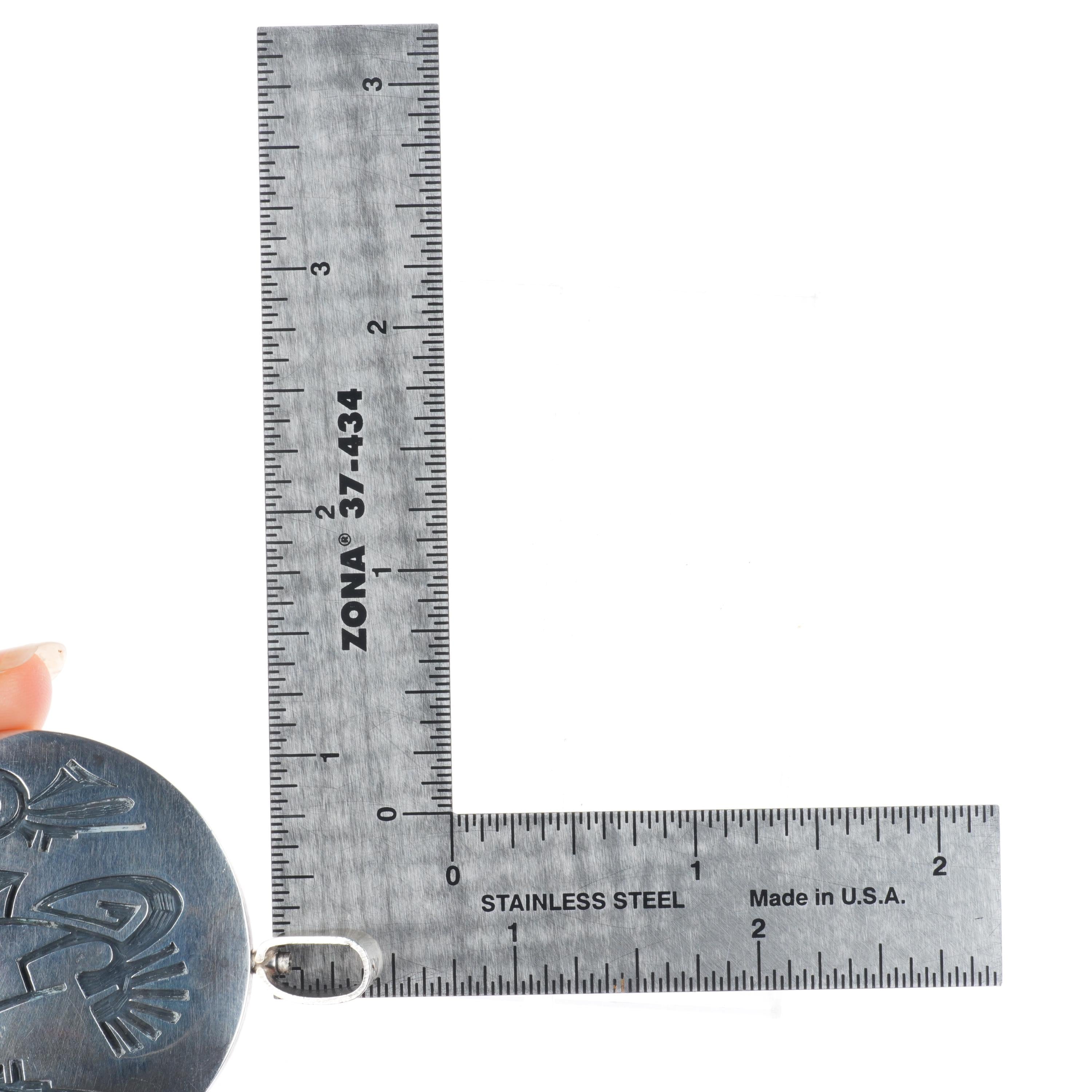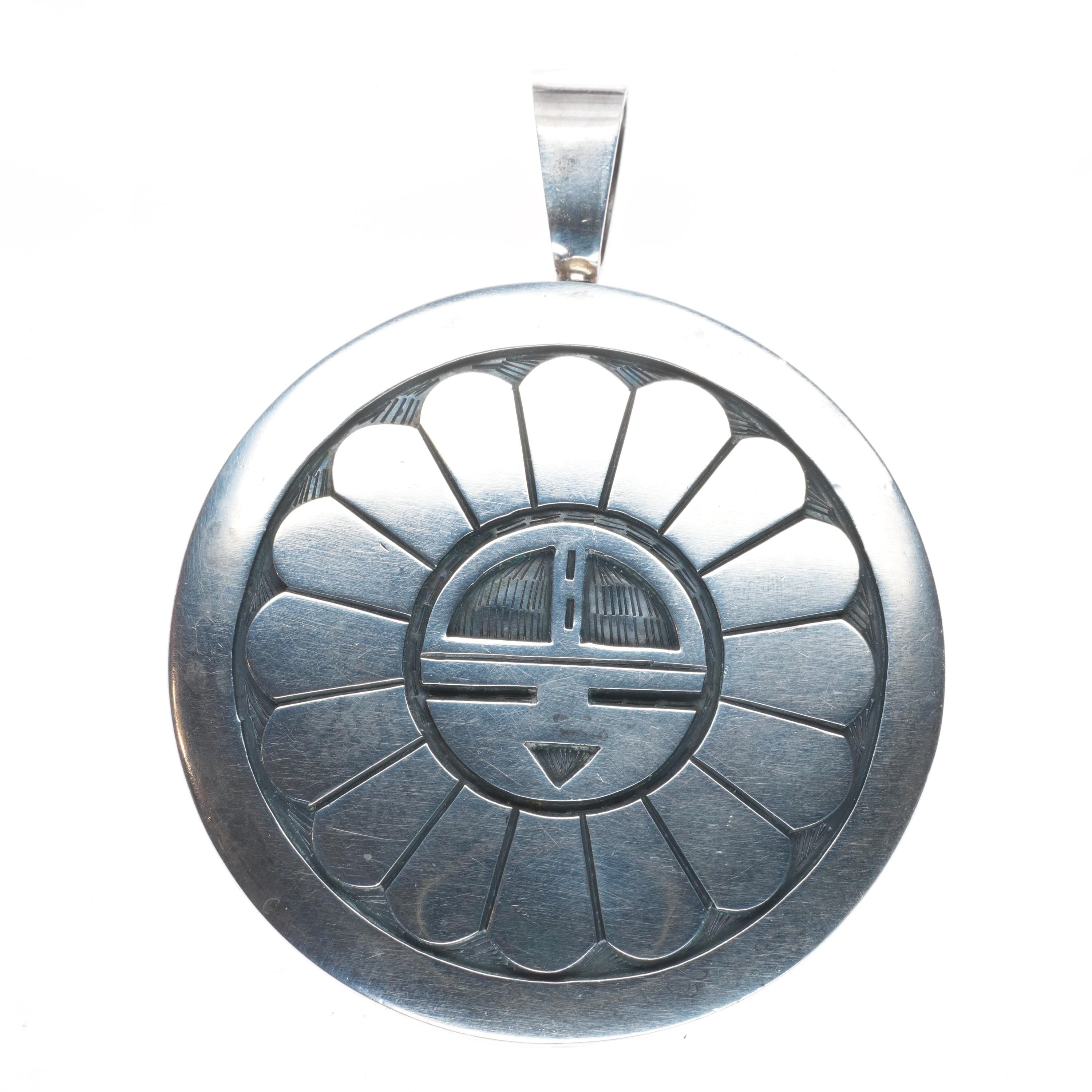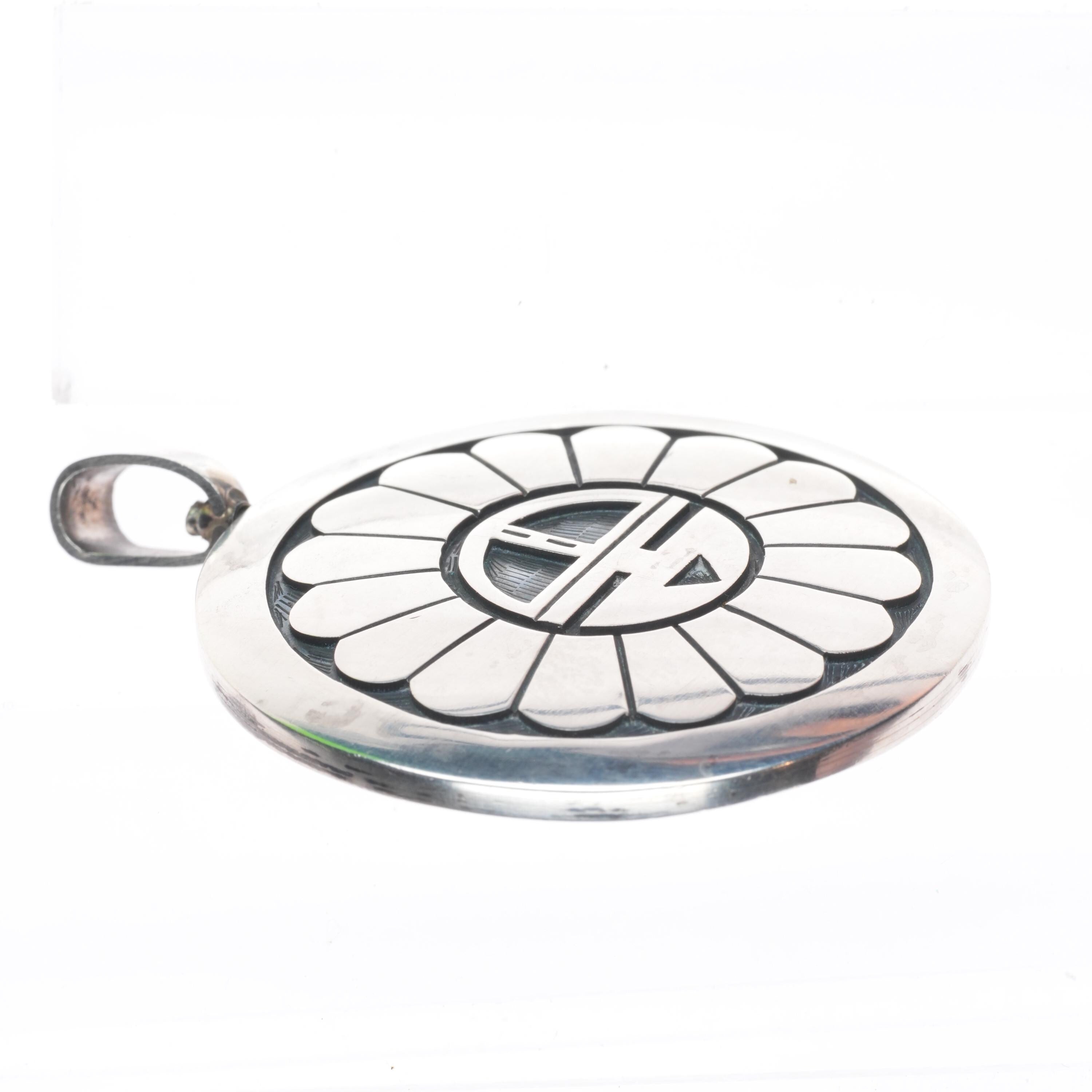 Cheryl Wadsworth Hopi overlay spinner kokopelli/sunface pendant sterling silver. Solid sterling silver tested and guaranteed with weight and measurements in the pictures. No issues, circa last quarter of the 20th century.