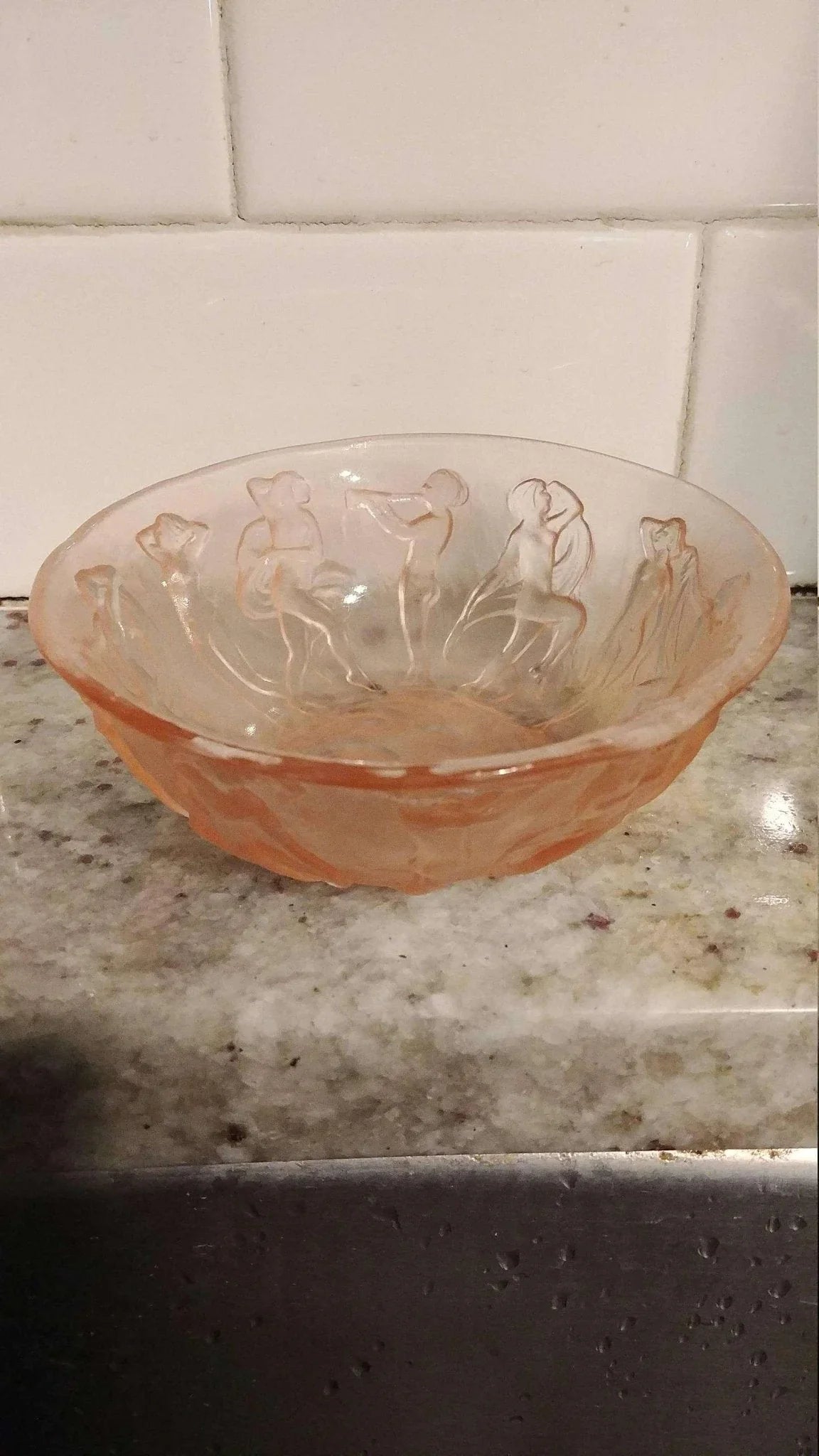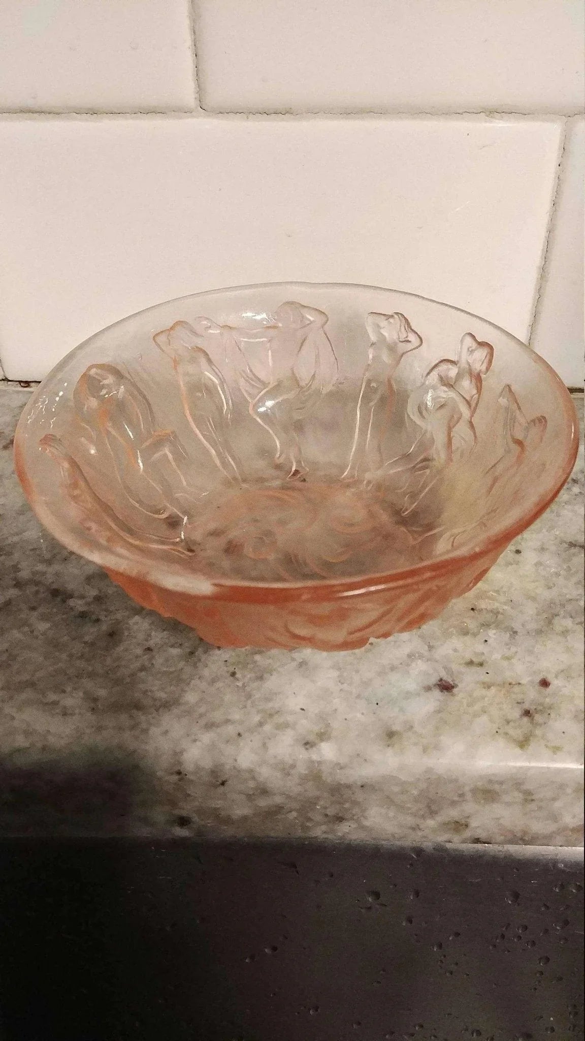 Consolidated Dancing Nymphs Pink Satin Berry Bowl Nackte Frauen Periode Art Deco Depression Glas 1930er Jahre 4 5/8" breit (mehrere verfügbar)