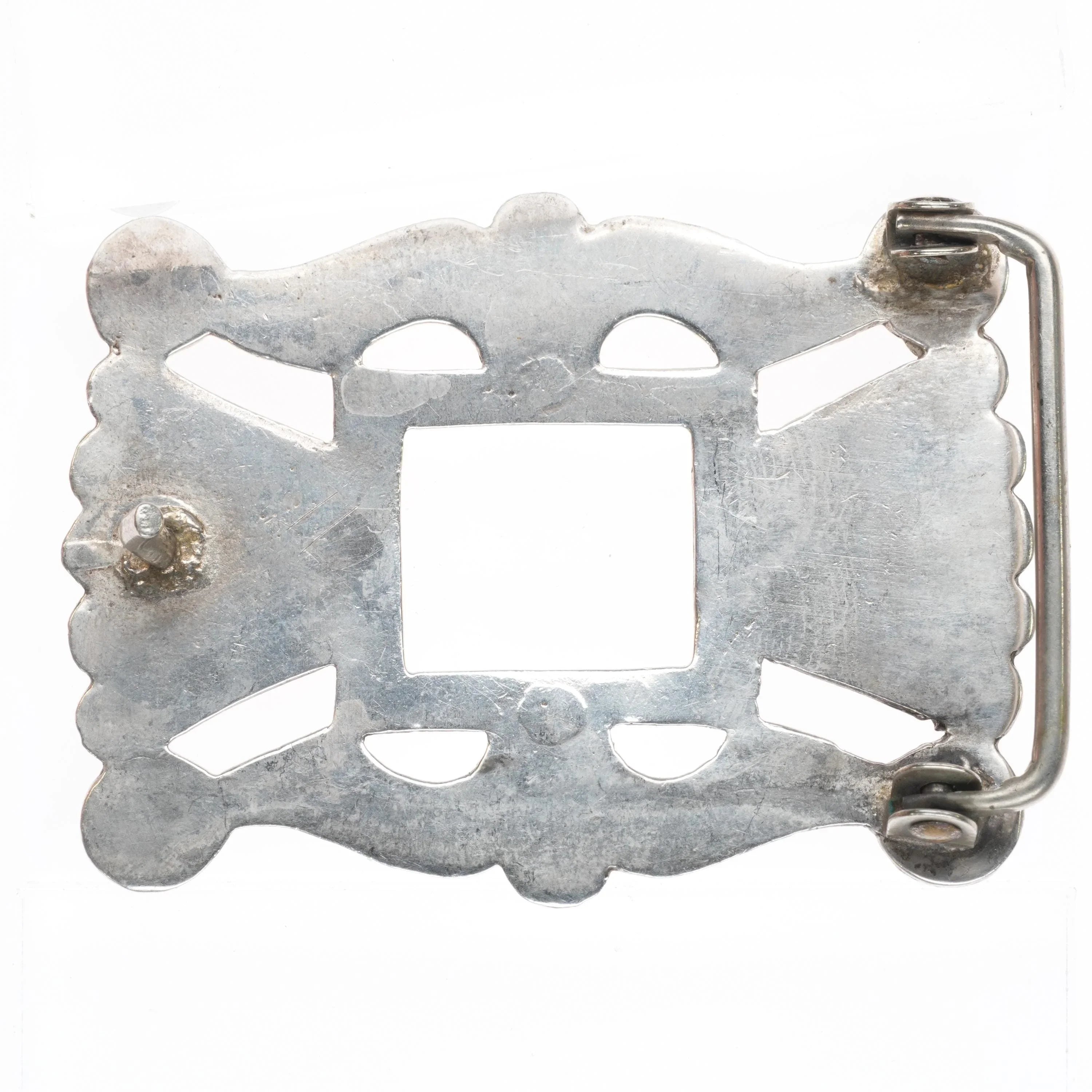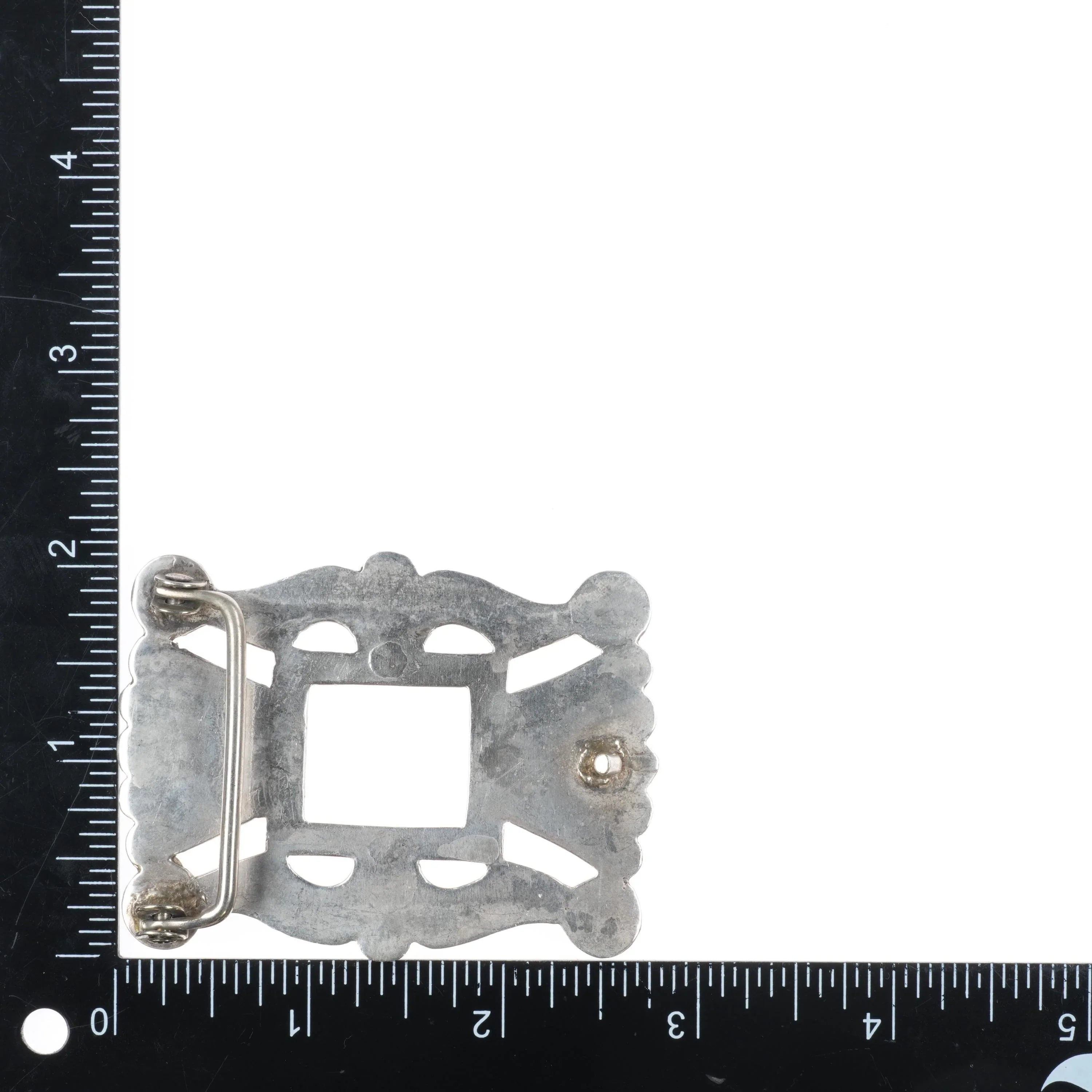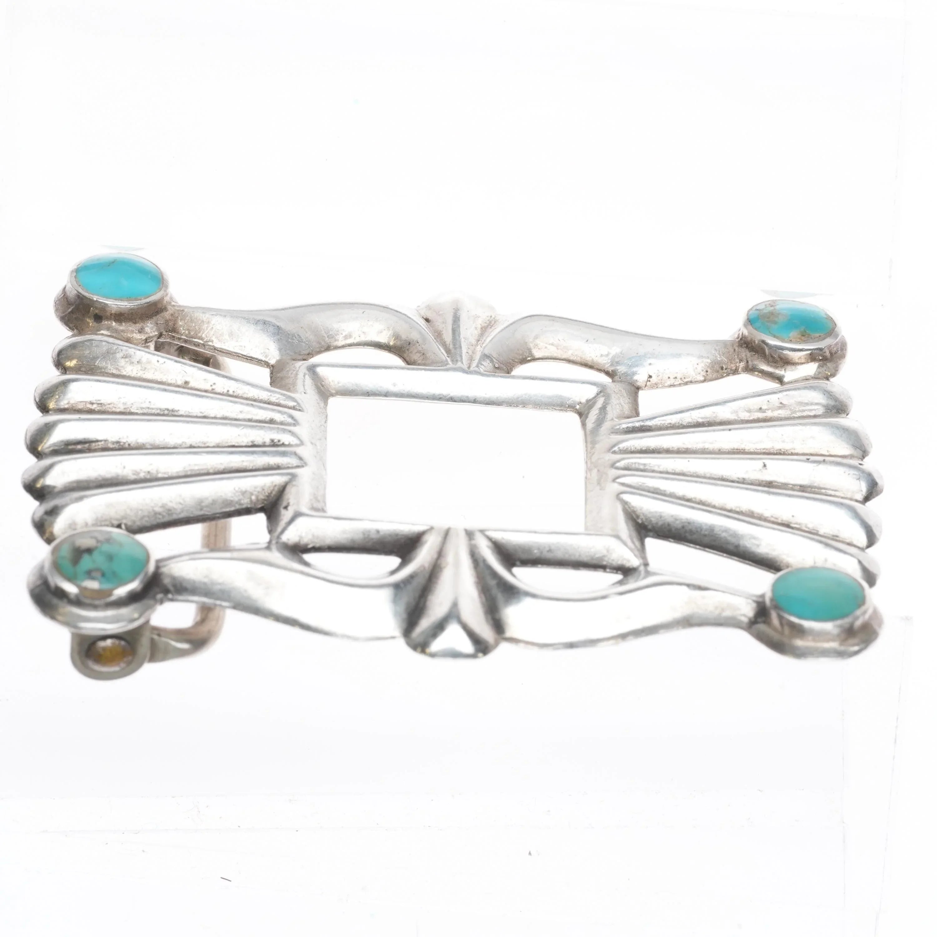Early Navajo or Zuni cast sterling silver Ketoh style belt buckle with turquoise. This buckle originally had thin leather going through the center, possibly on a concho belt, converted to standard belt buckle likely in the 1970‘s. Tested and guaranteed solid sterling silver. Fits up to a 1.5" wide belt. Some expected wear. Circa second quarter of the 20th century to mid 20th century. Weight and measurements in pictures.