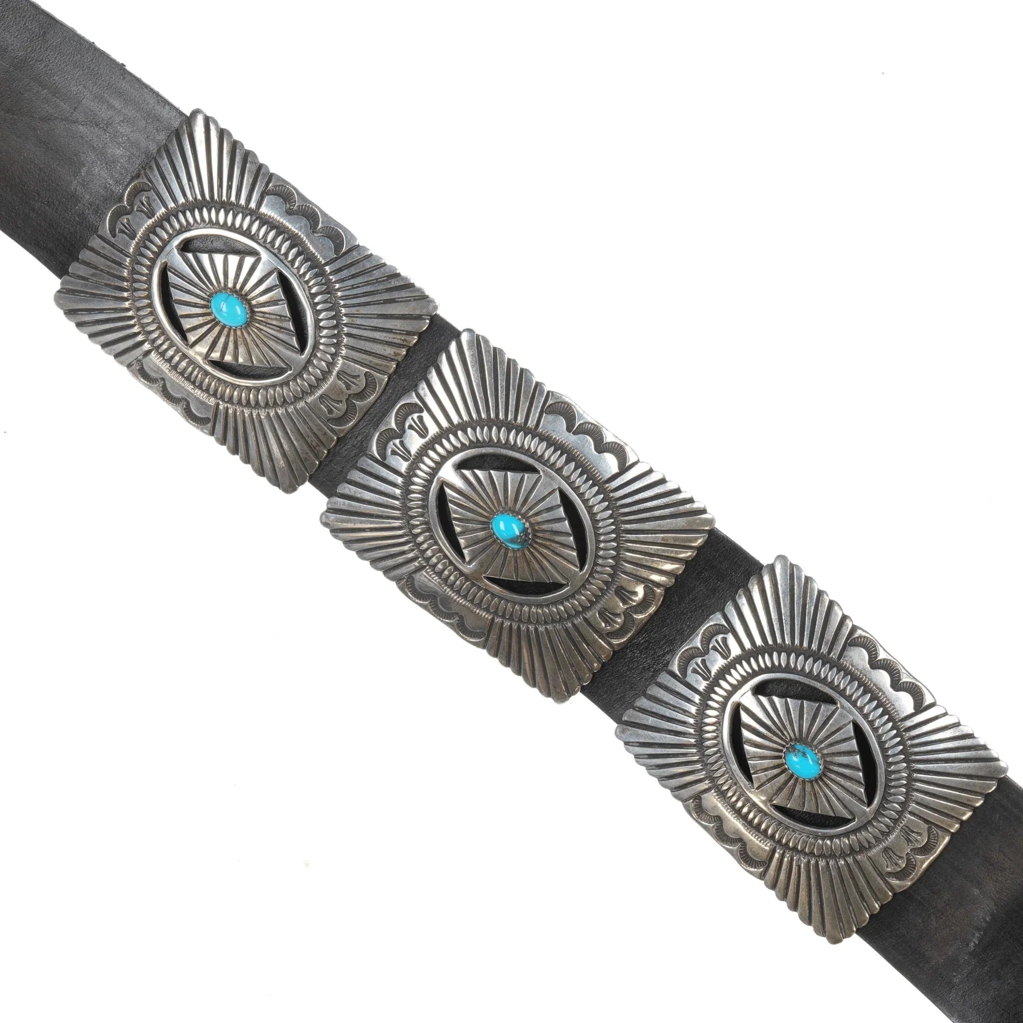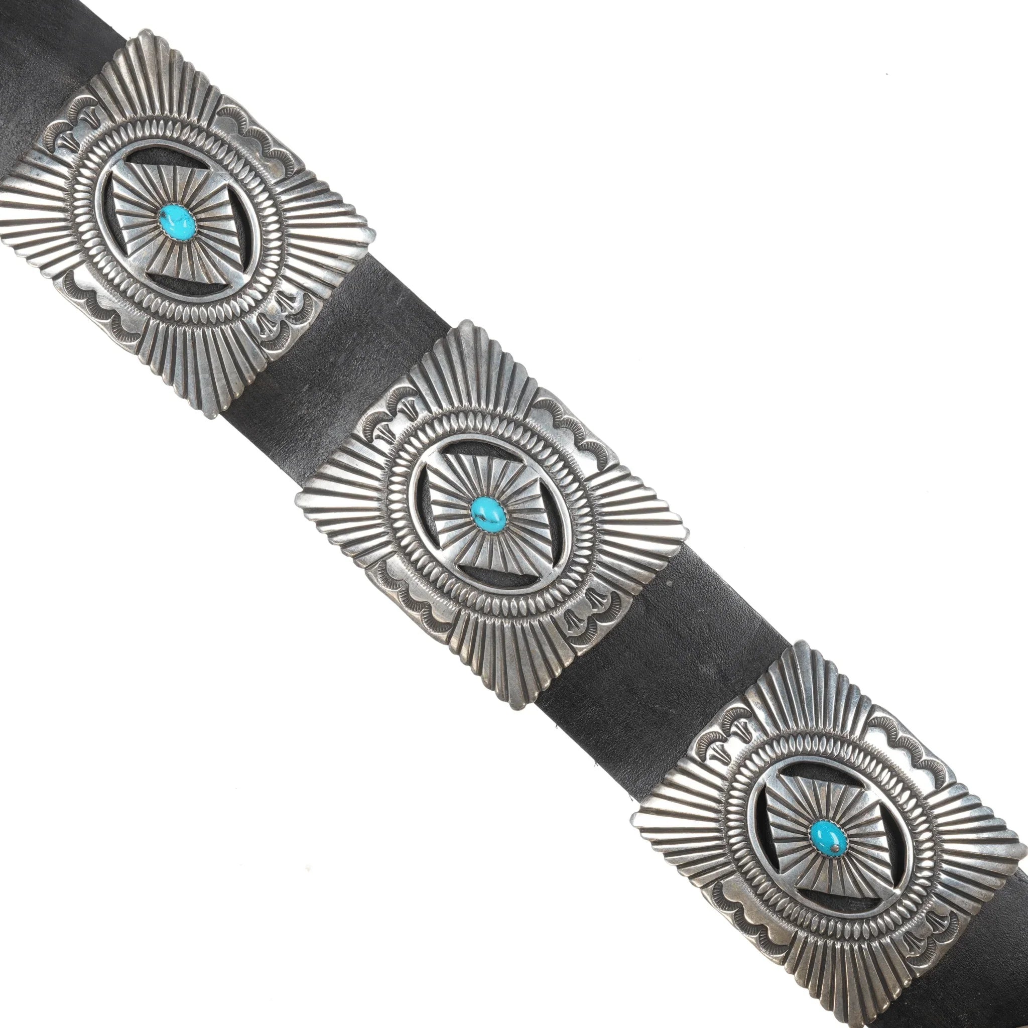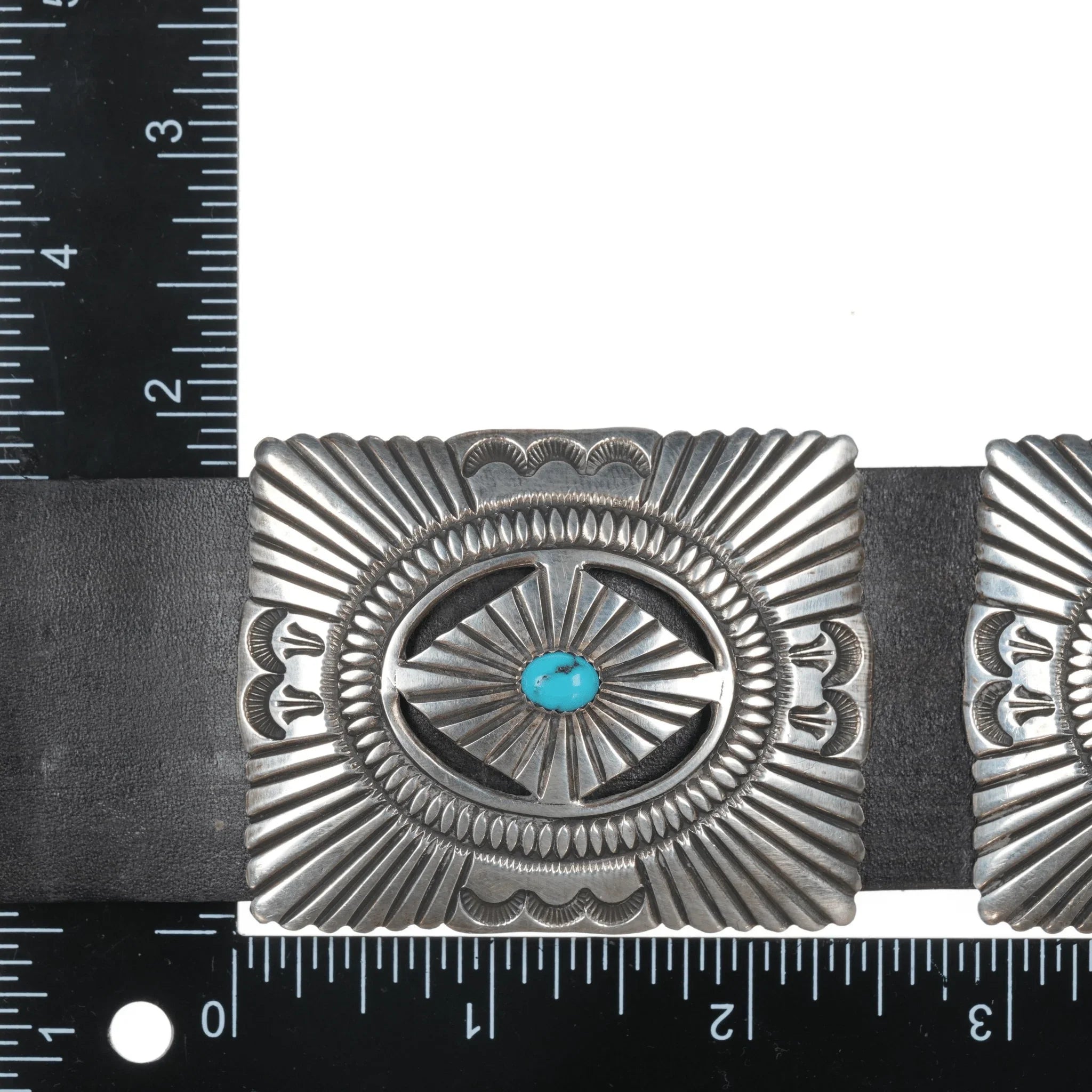 Ernest Roy Begay Navajo Heavy stamped sterling and turquoise concho belt. 408 grams, 43" long, longest usable length about 40", other measurements in pics. Appears unworn. 8 Conchos and 1 Buckle.
