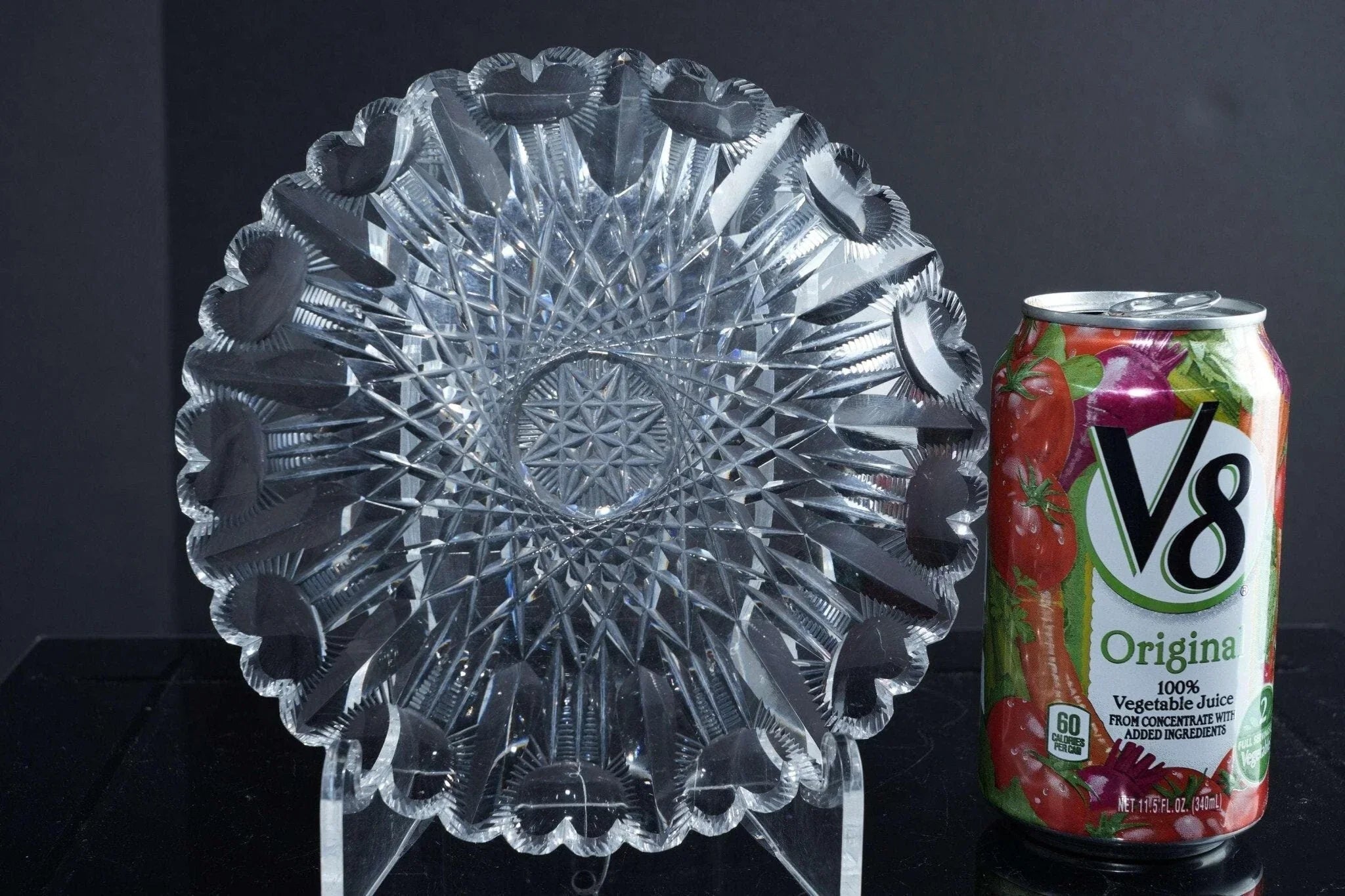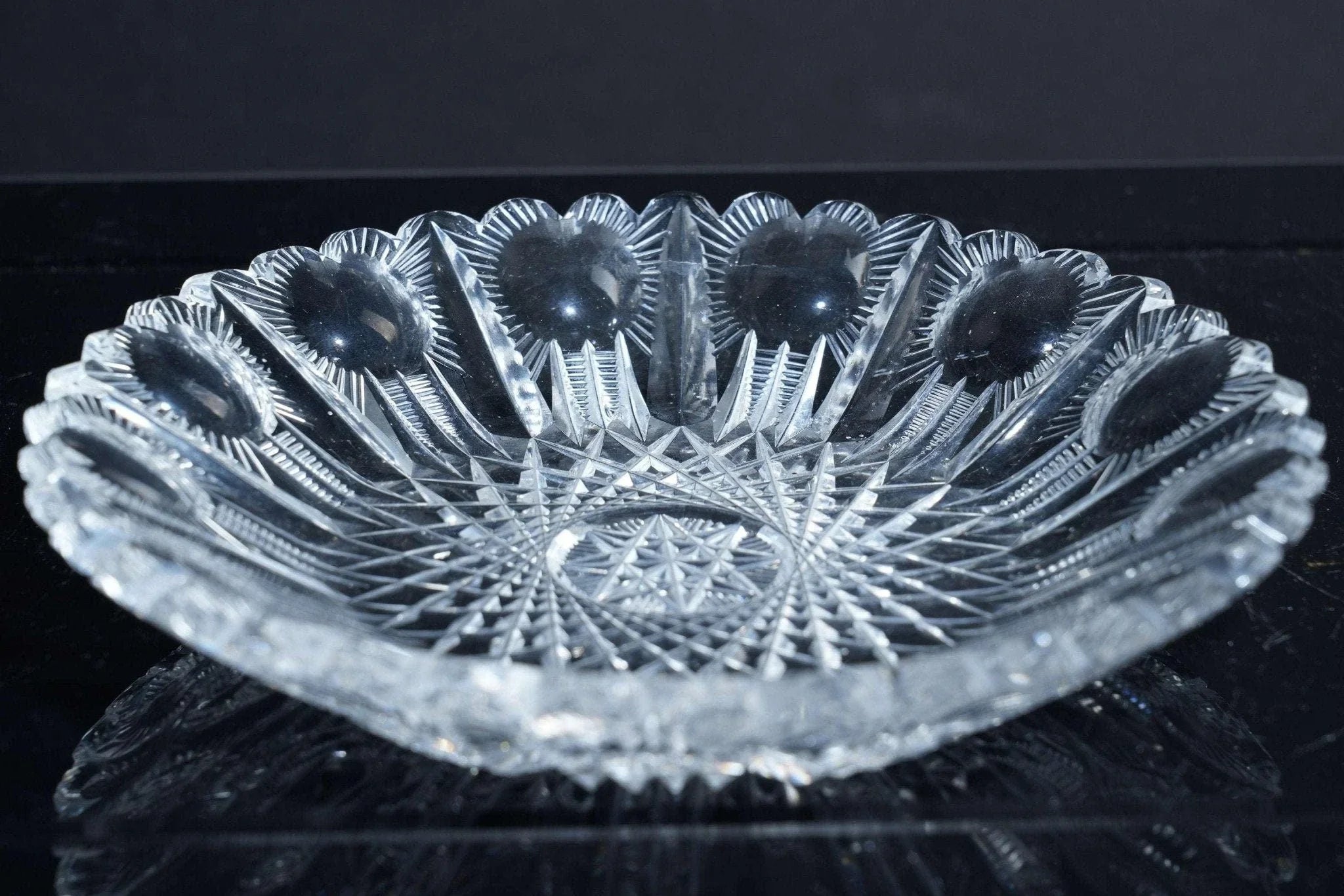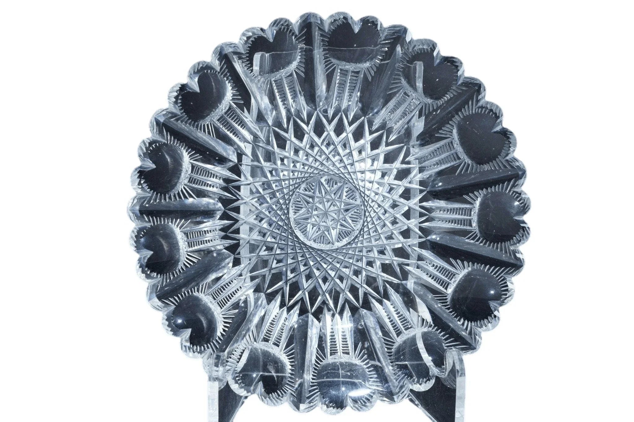 um 1900 Pairpoint-Herzplatte aus amerikanischem Brillantschliffglas. Erstaunliches Stück geschliffenes Glas, 7 Zoll breit, ohne nennenswerten Schaden, nur sehr wenige winzige Flocken sind nur bei äußerst genauer Betrachtung sichtbar, so sauber wie es nur geht. Ich konnte keine Erkennungszeichen finden, aber es ist Pairpoint.