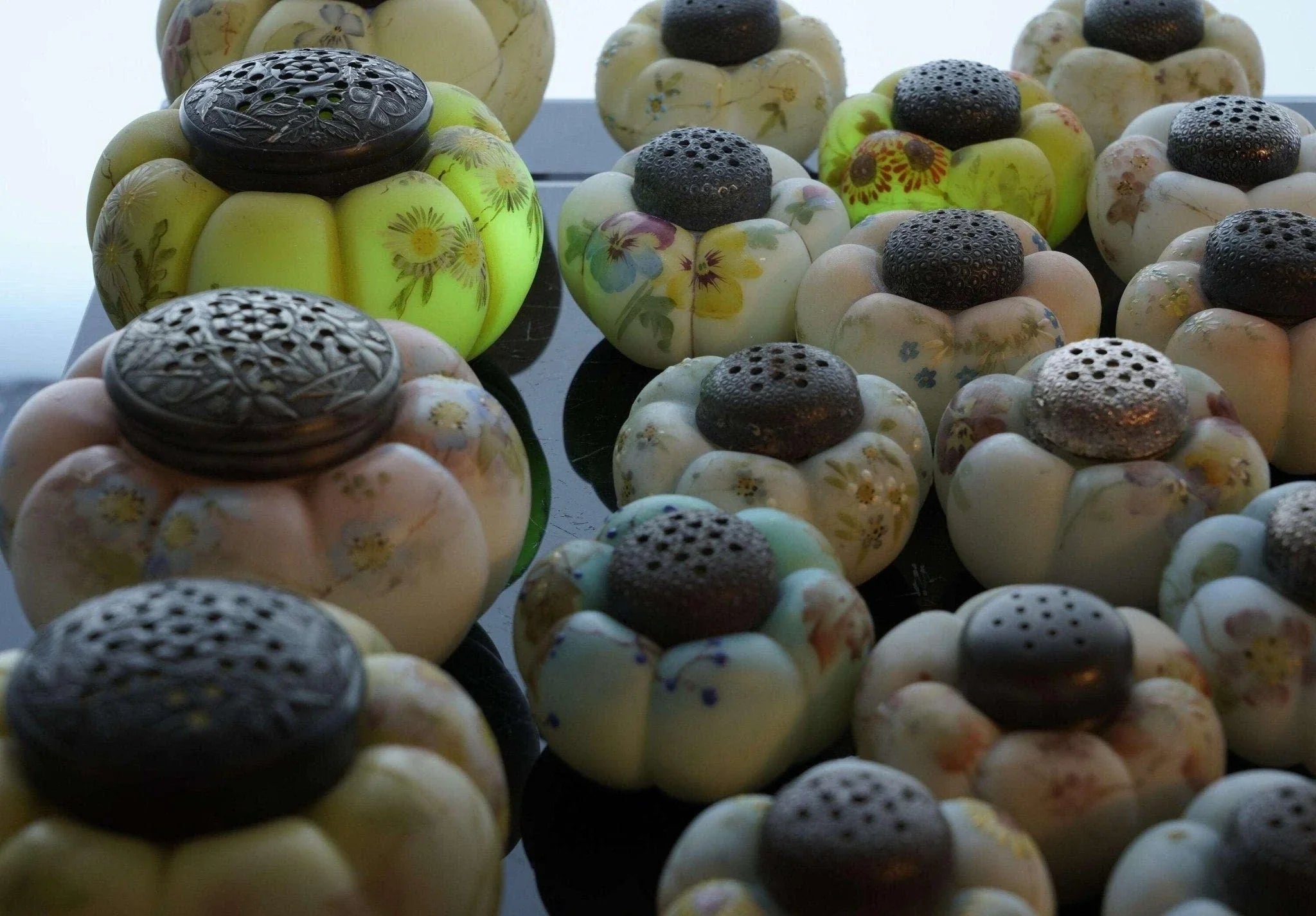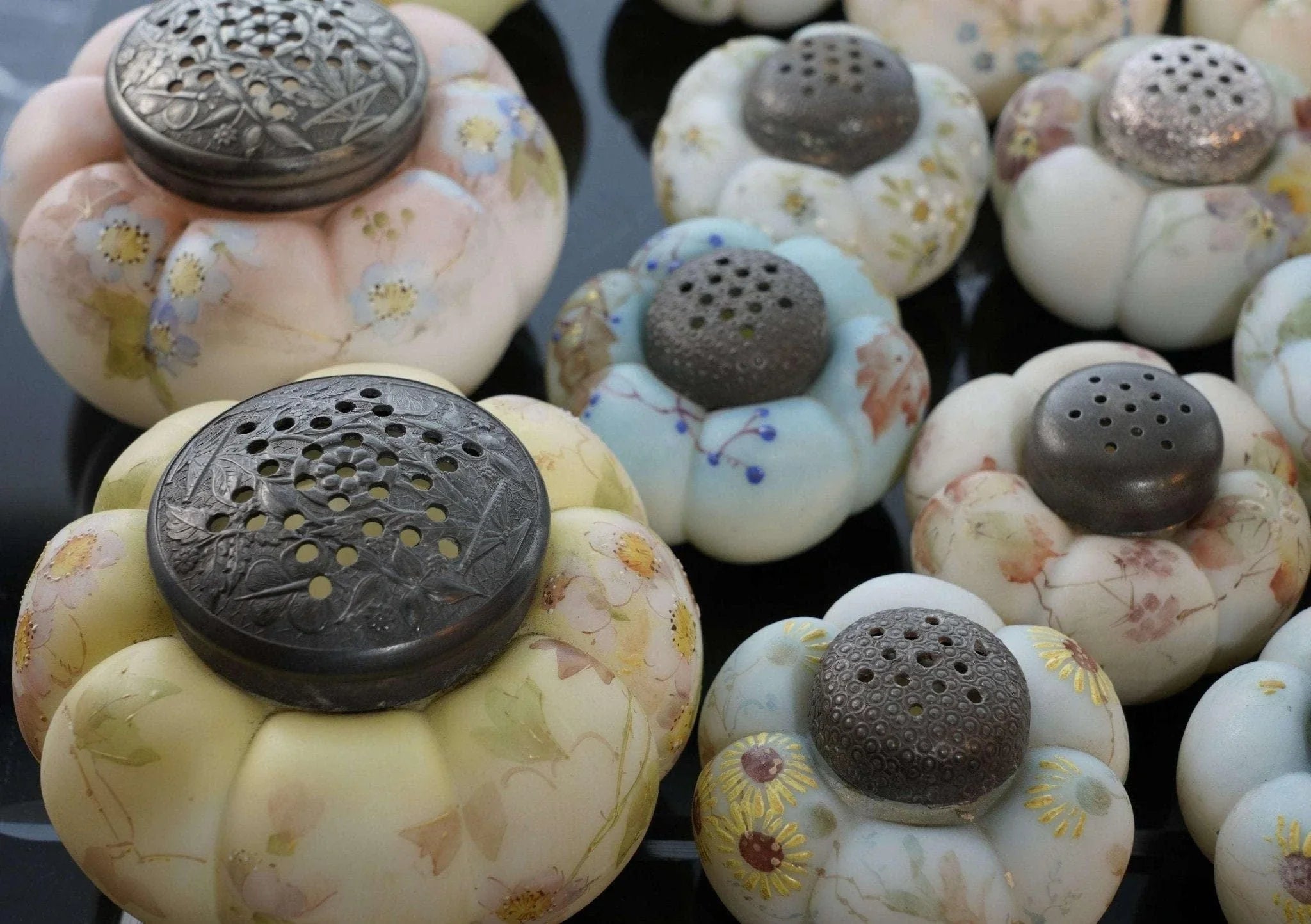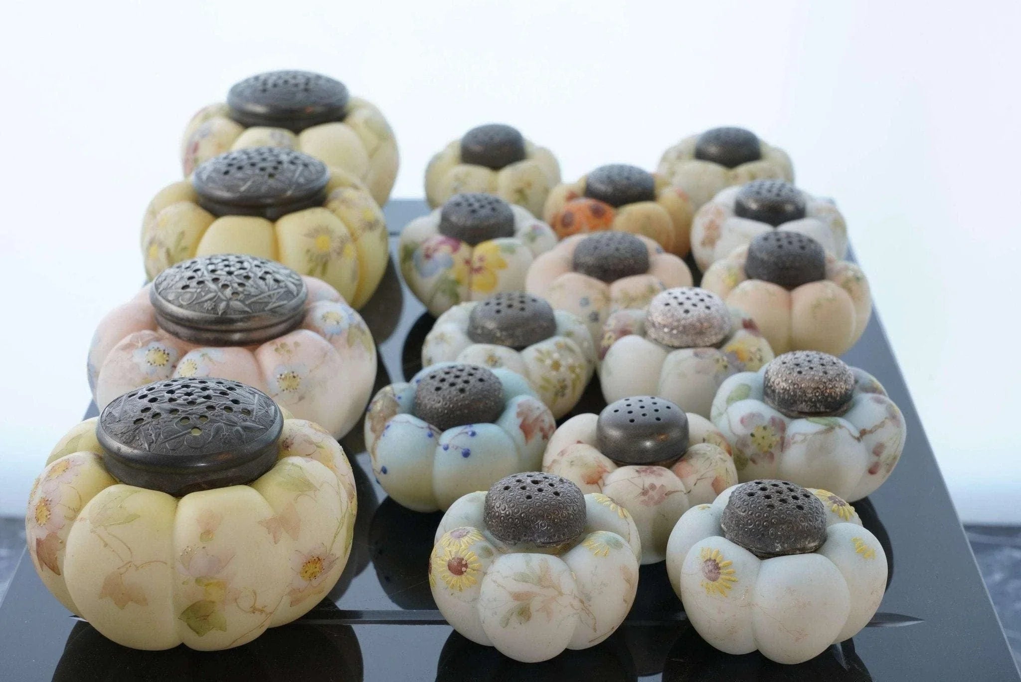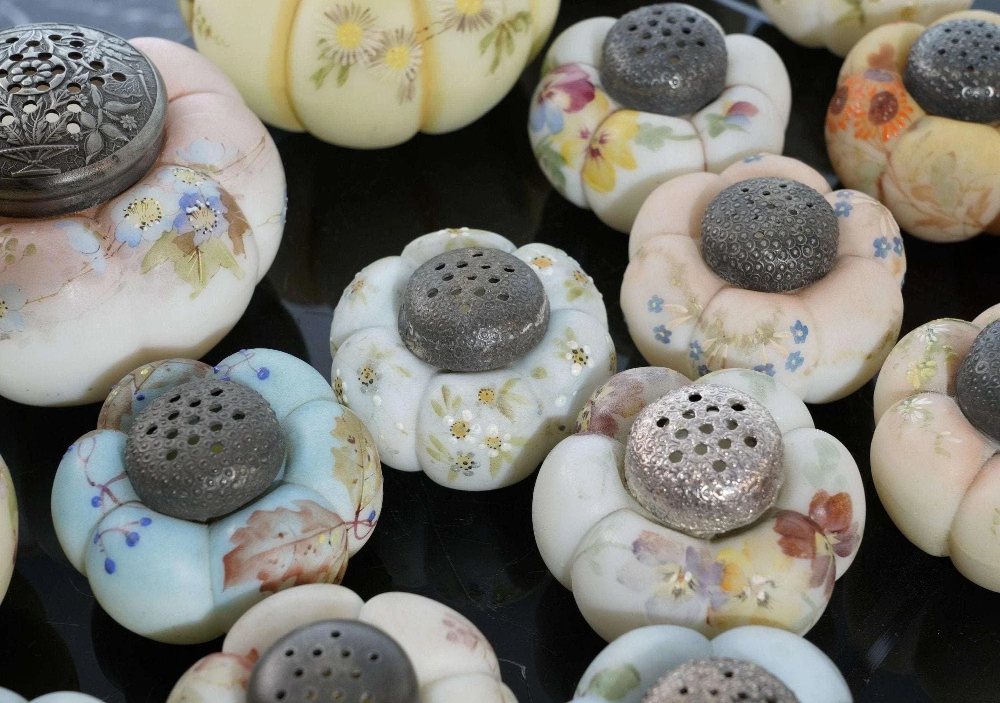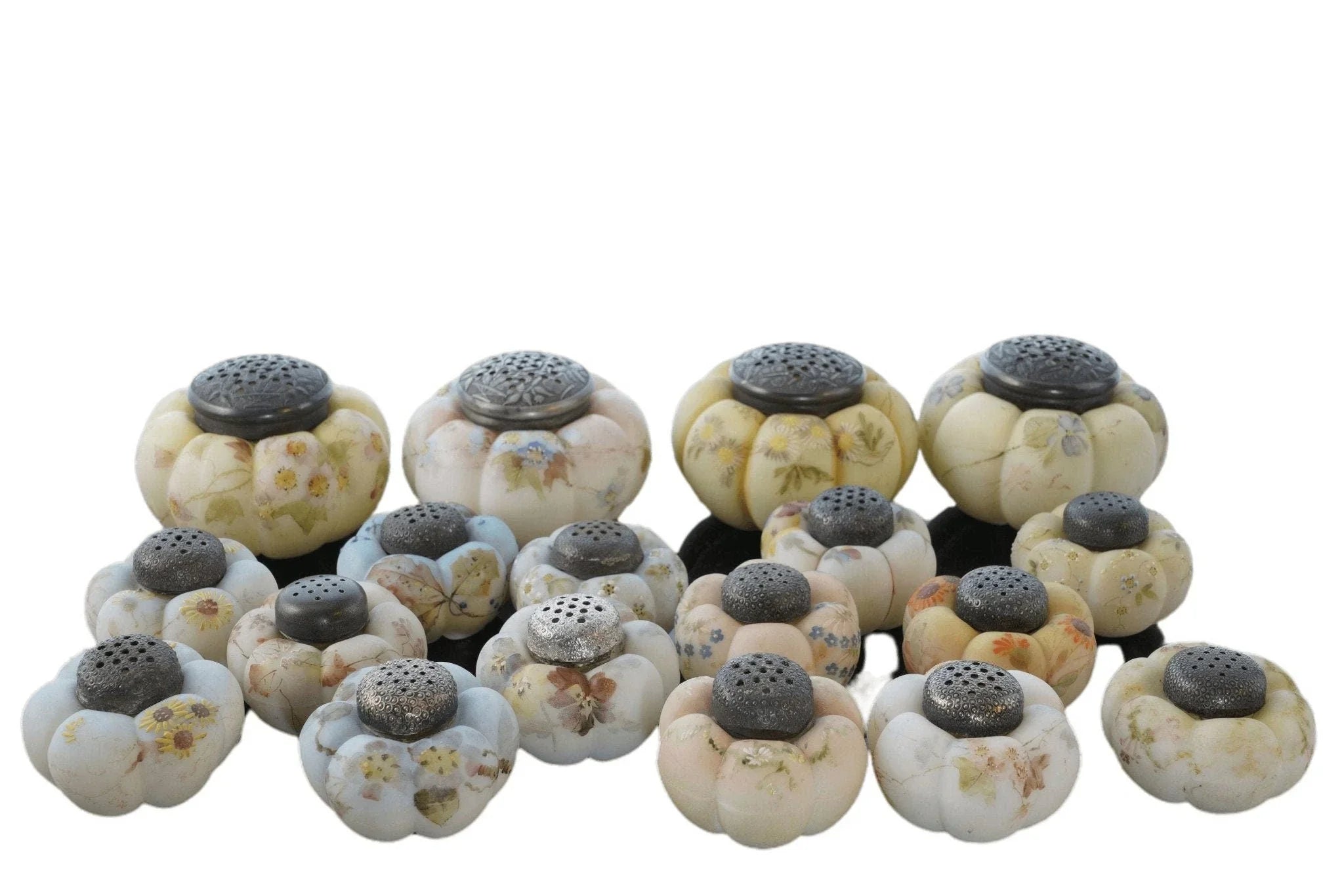 c1890 Mt Washington Art Glass Zuckerstreuer und Salz- und Pfefferkollektion. Zuckerstreuer sind 4 Zoll breit, Streuer sind 2 5/8 Zoll breit. Keiner mit Rissen, einige mit Absplitterungen an der Innenseite des Deckels. Manche benötigen neuen Gips, um das Metallteil an Ort und Stelle zu halten, auf das der Deckel aufgeschraubt wird, damit es funktionsfähig ist. Alles in allem eine tolle und seltene Sammlung, vor 30 Jahren hat mir der Fund nur eines einzigen dieser Shaker „Out in the wild“ den Tag versüßt. Verkauf der gesamten gezeigten Sammlung, alle vor etwa 125 Jahren in den USA handbemalt. Einige wenige zeigen unter UV-Licht starke Spuren von Uran.