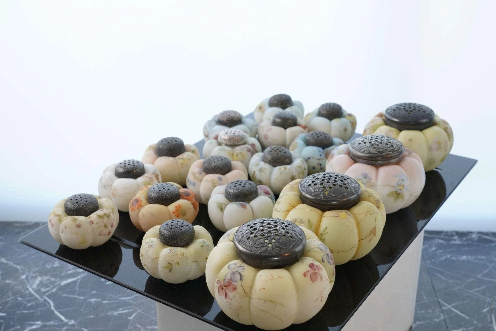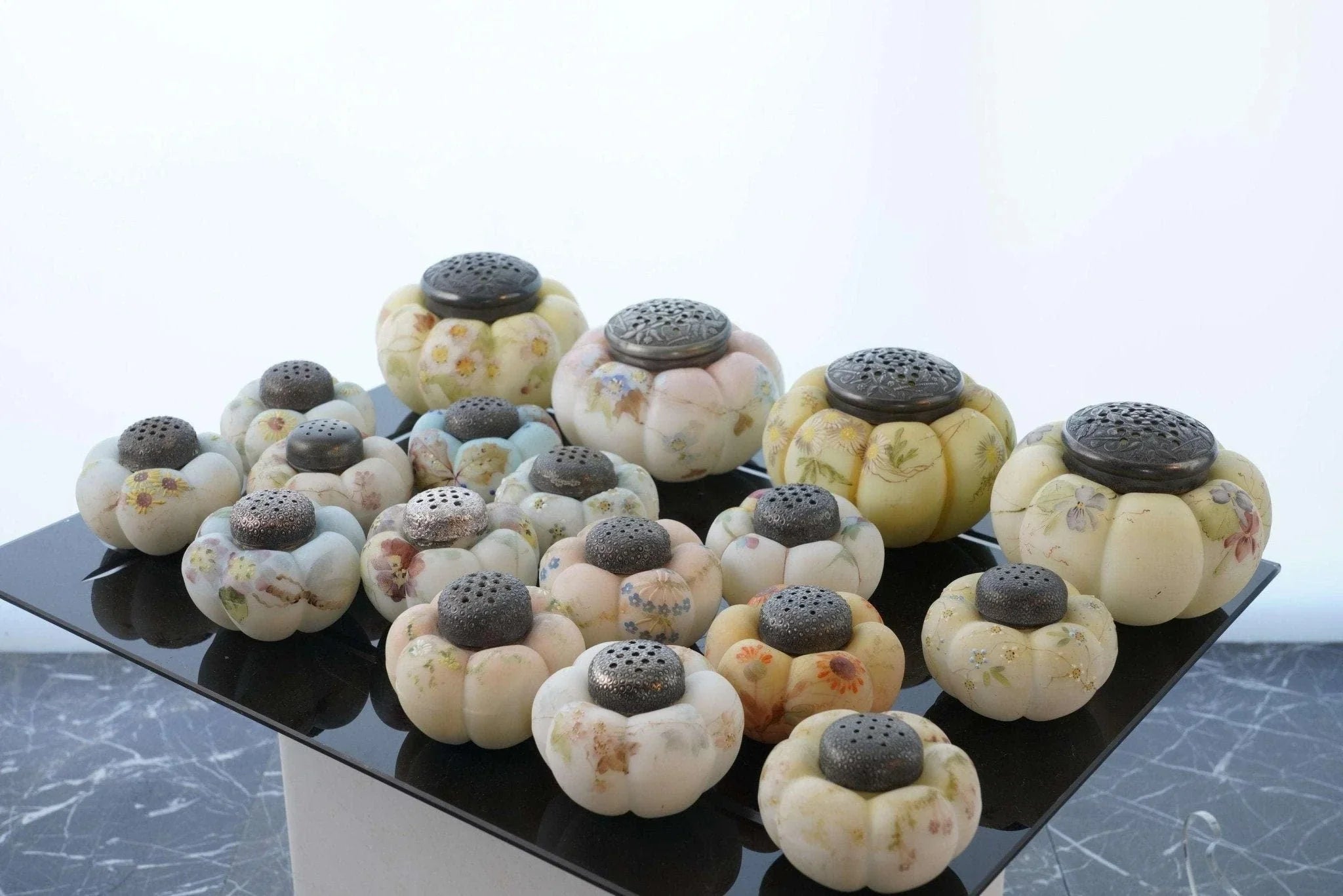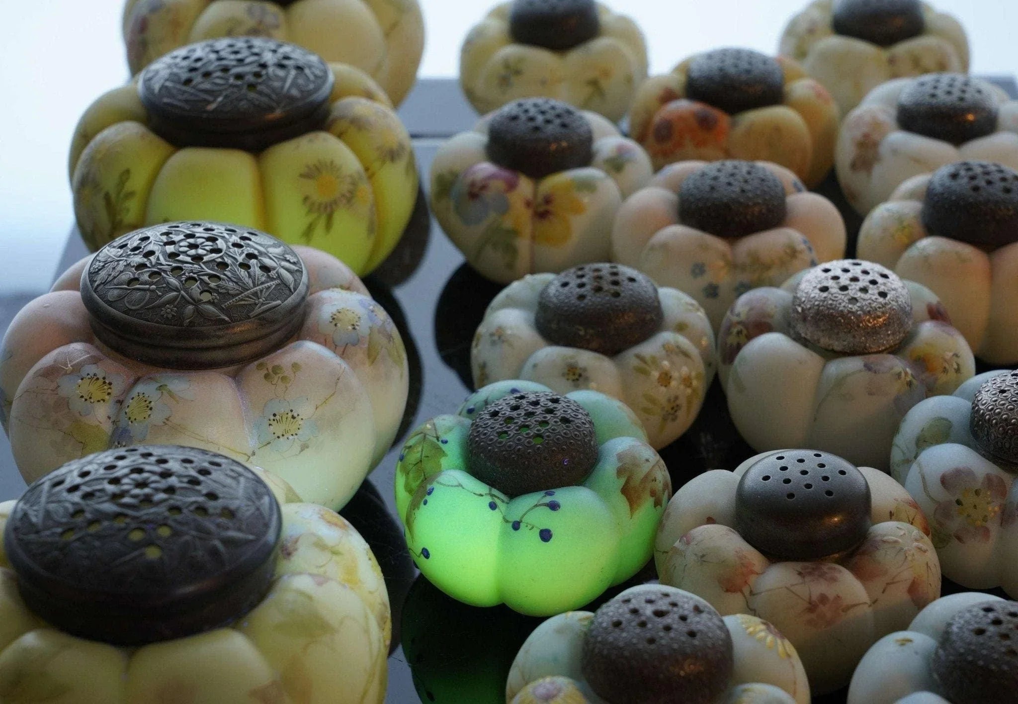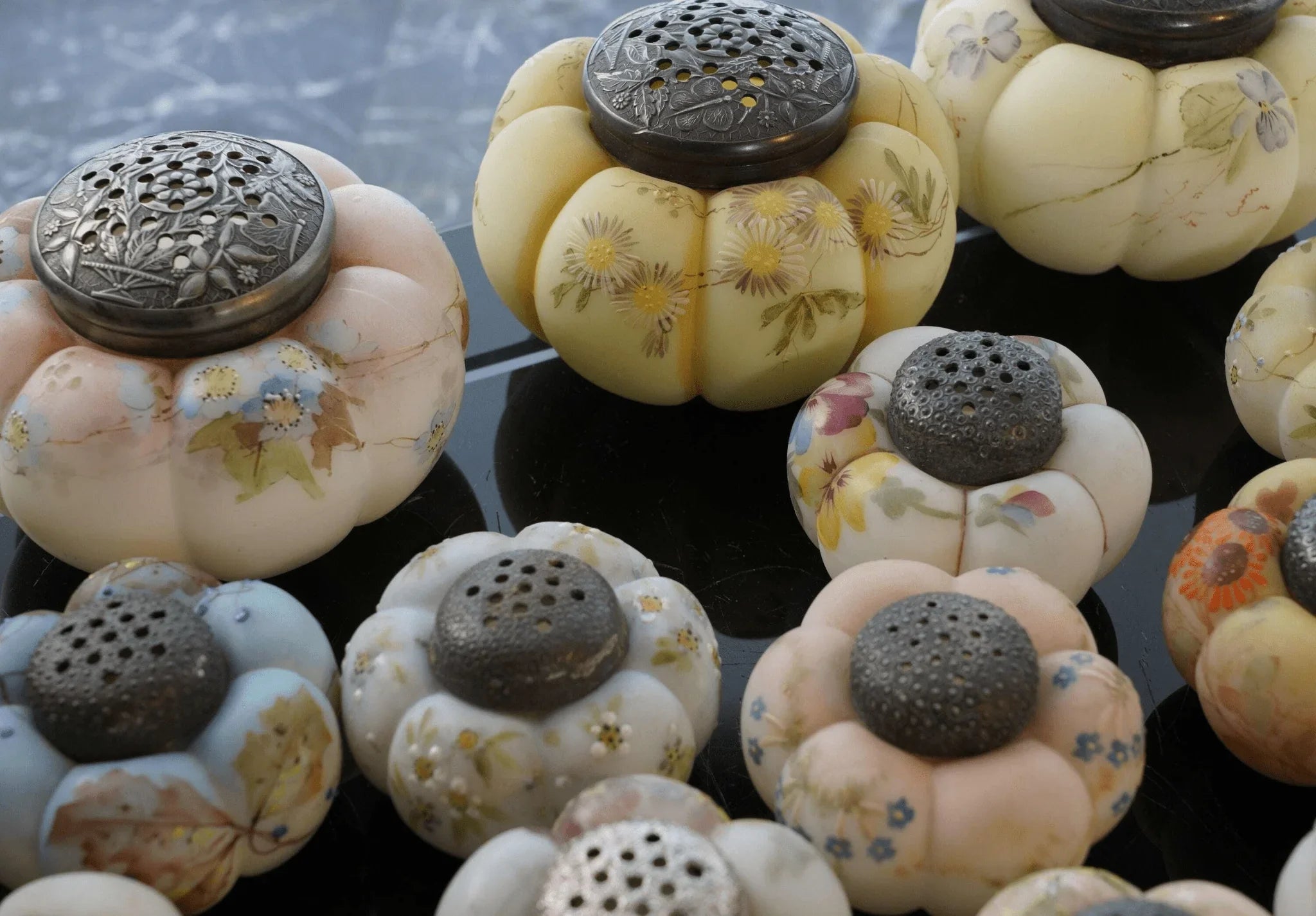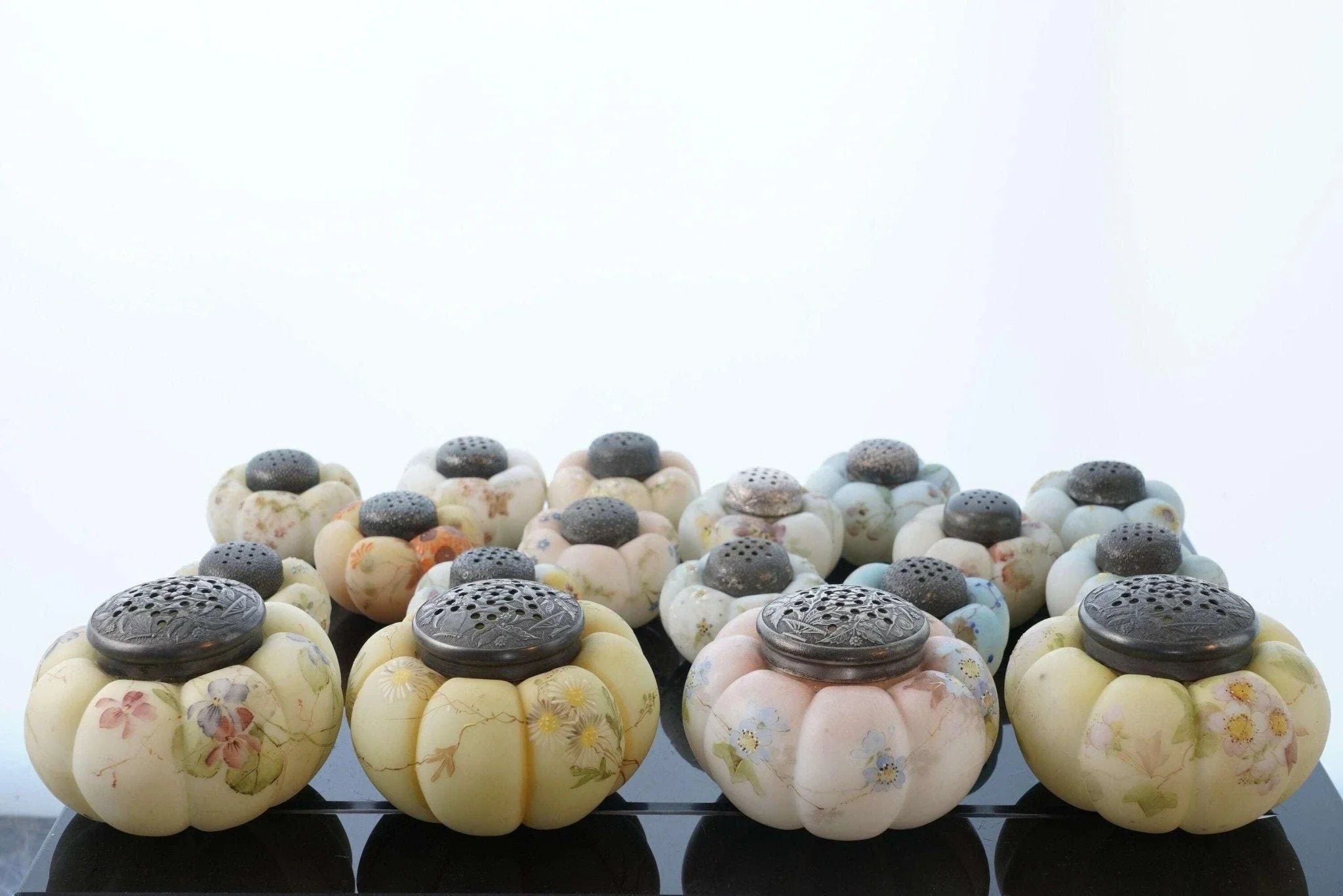 c1890 Mt Washington Art Glass Zuckerstreuer und Salz- und Pfefferkollektion. Zuckerstreuer sind 4 Zoll breit, Streuer sind 2 5/8 Zoll breit. Keiner mit Rissen, einige mit Absplitterungen an der Innenseite des Deckels. Manche benötigen neuen Gips, um das Metallteil an Ort und Stelle zu halten, auf das der Deckel aufgeschraubt wird, damit es funktionsfähig ist. Alles in allem eine tolle und seltene Sammlung, vor 30 Jahren hat mir der Fund nur eines einzigen dieser Shaker „Out in the wild“ den Tag versüßt. Verkauf der gesamten gezeigten Sammlung, alle vor etwa 125 Jahren in den USA handbemalt. Einige wenige zeigen unter UV-Licht starke Spuren von Uran.