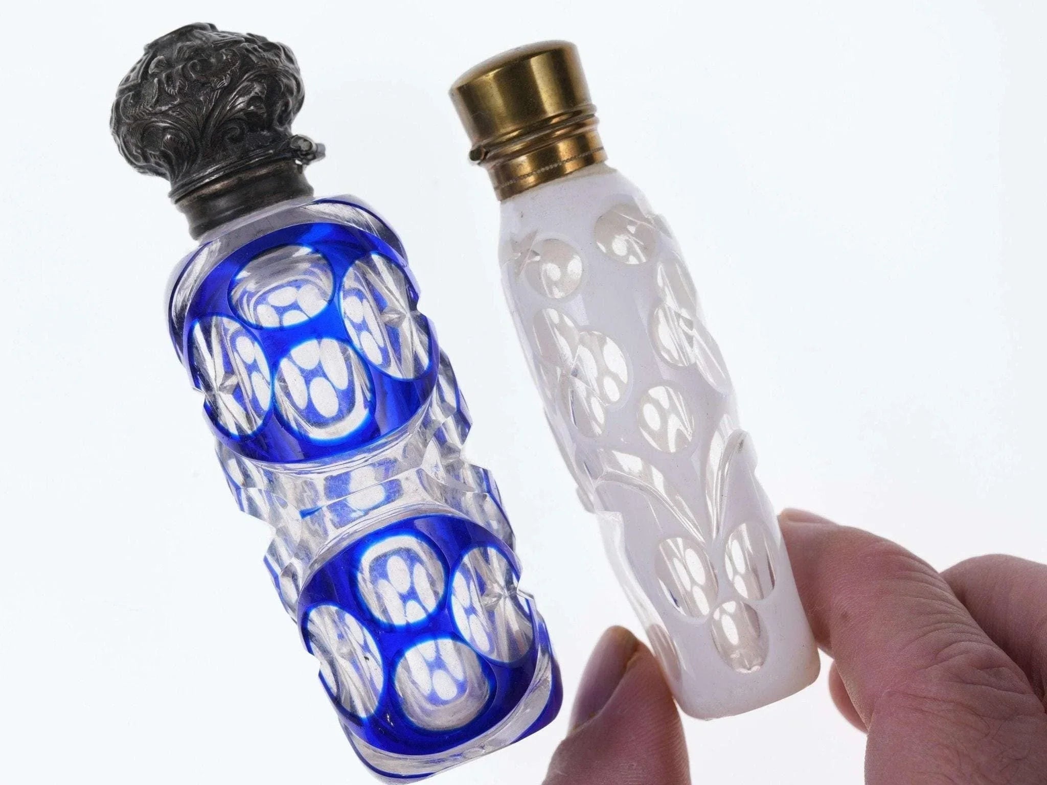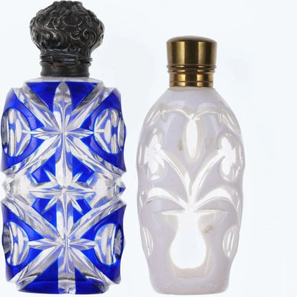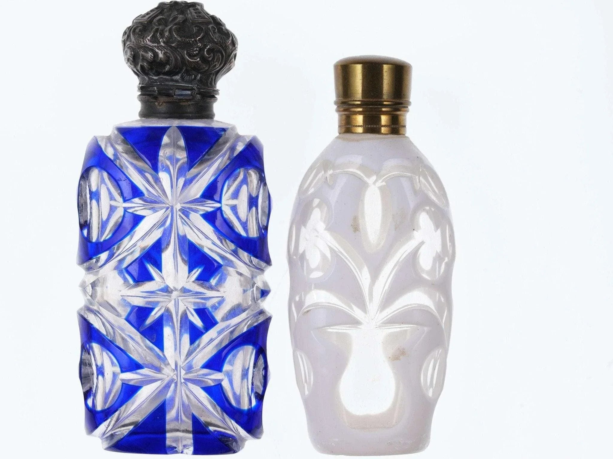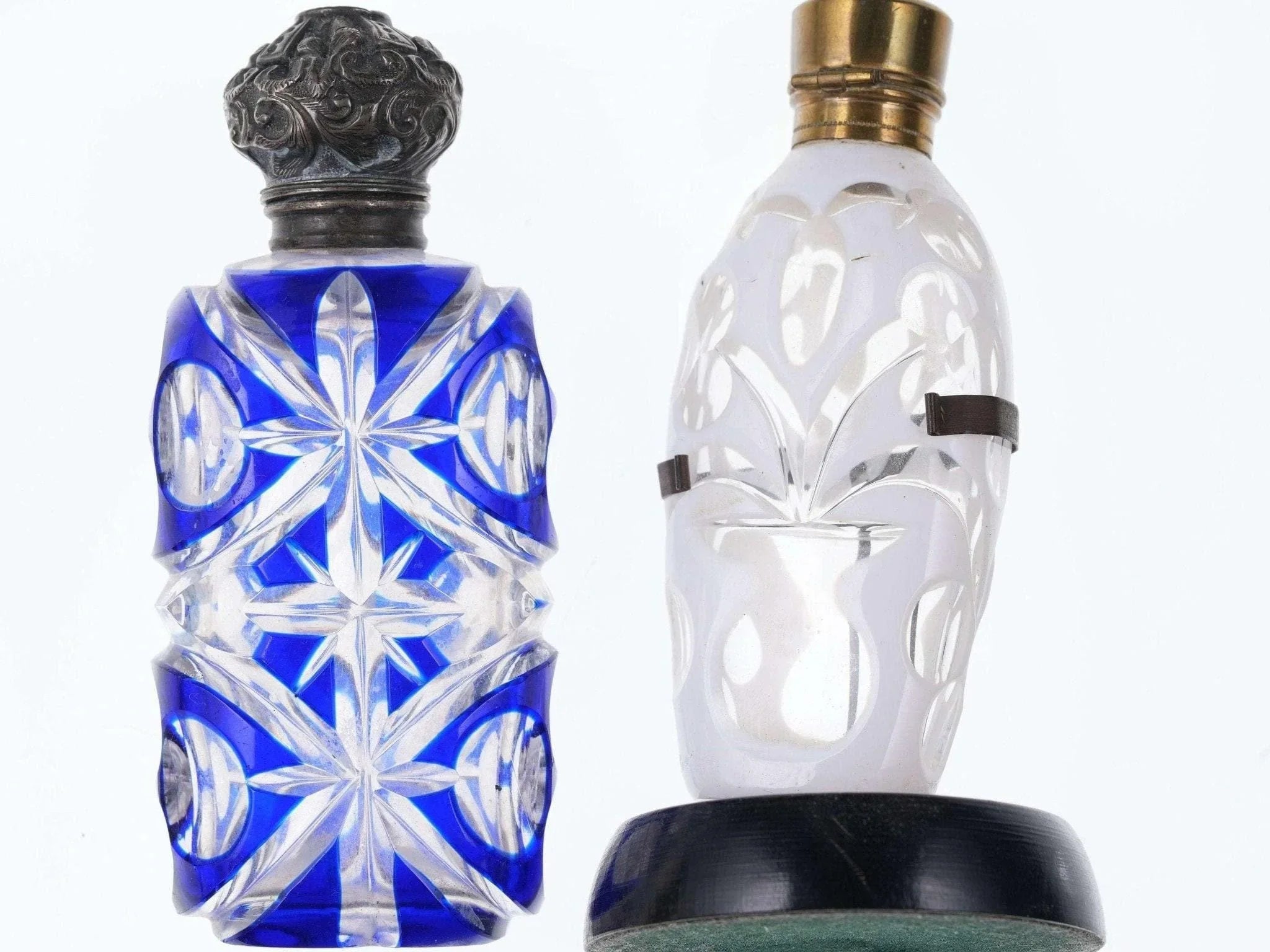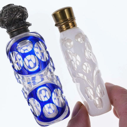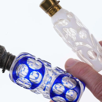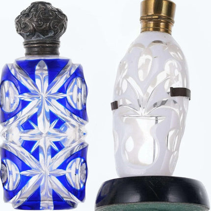 c1880 Weiß/Kobalt, geschliffen für klare Duftflaschen. Eines mit Sterlingplatte, eines mit Originalständer. Kein Halt im Innenstopfen, das Messingscharnier ist in Ordnung, das Sterlingscharnier ist kaputt. Chip am inneren Rand der Kobaltflasche unter der Sterling-Einlage, keine weiteren Chips, keine Risse. Verkaufe beide Flaschen, die größte 4"