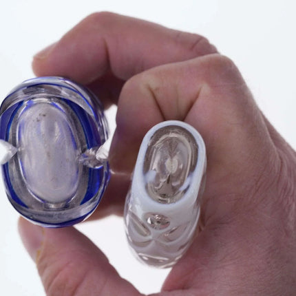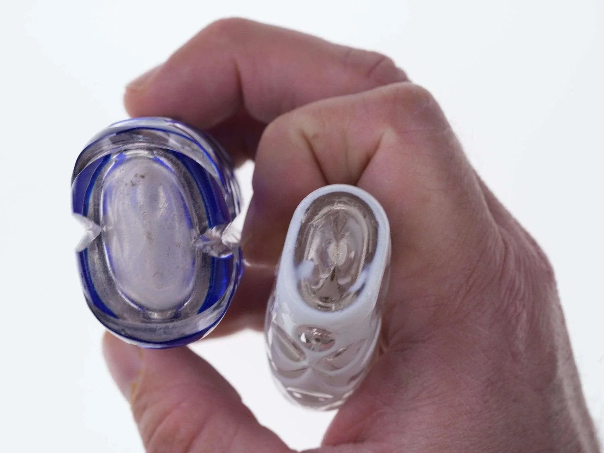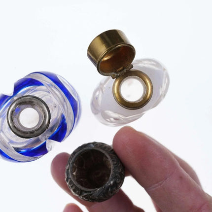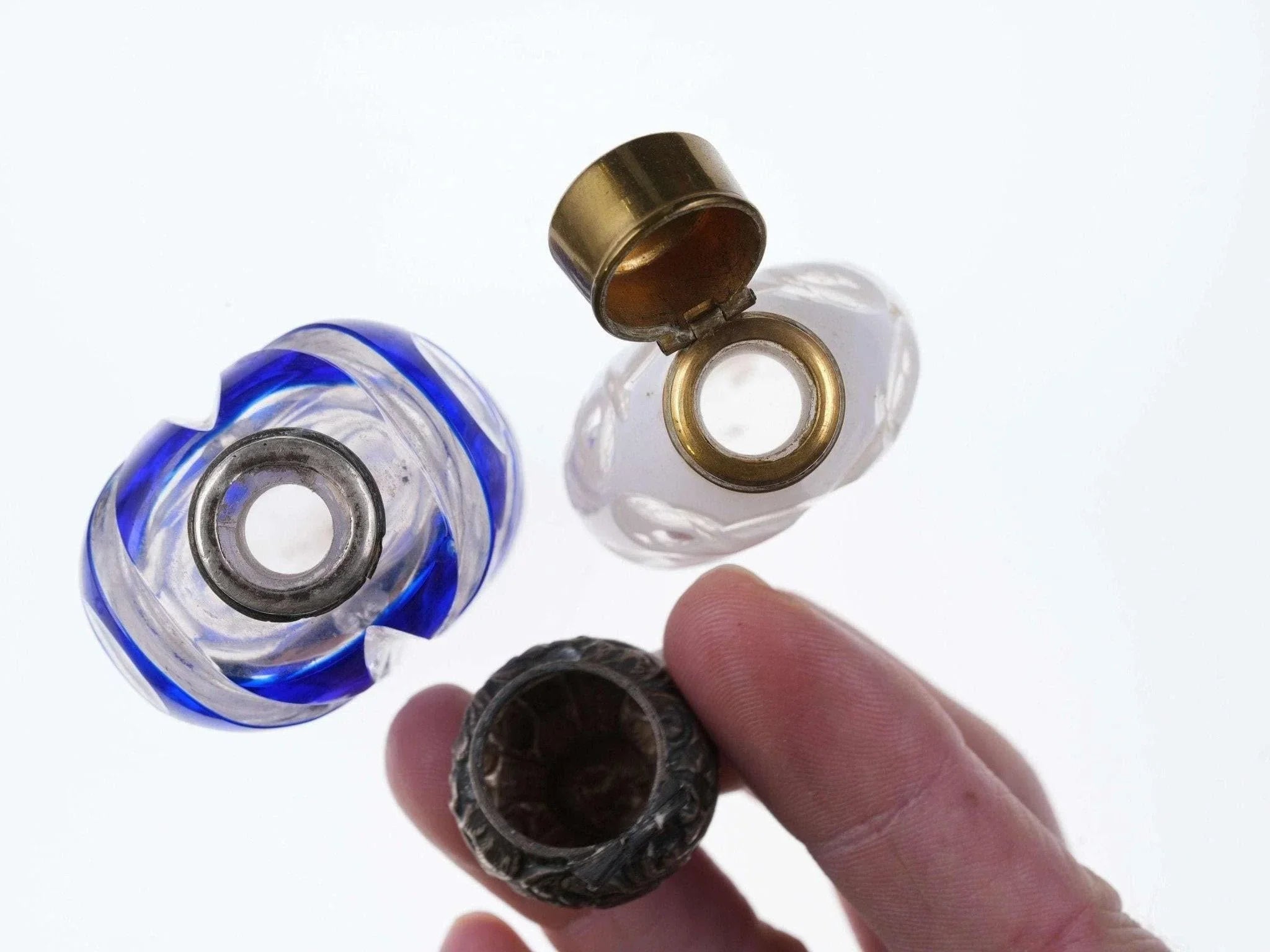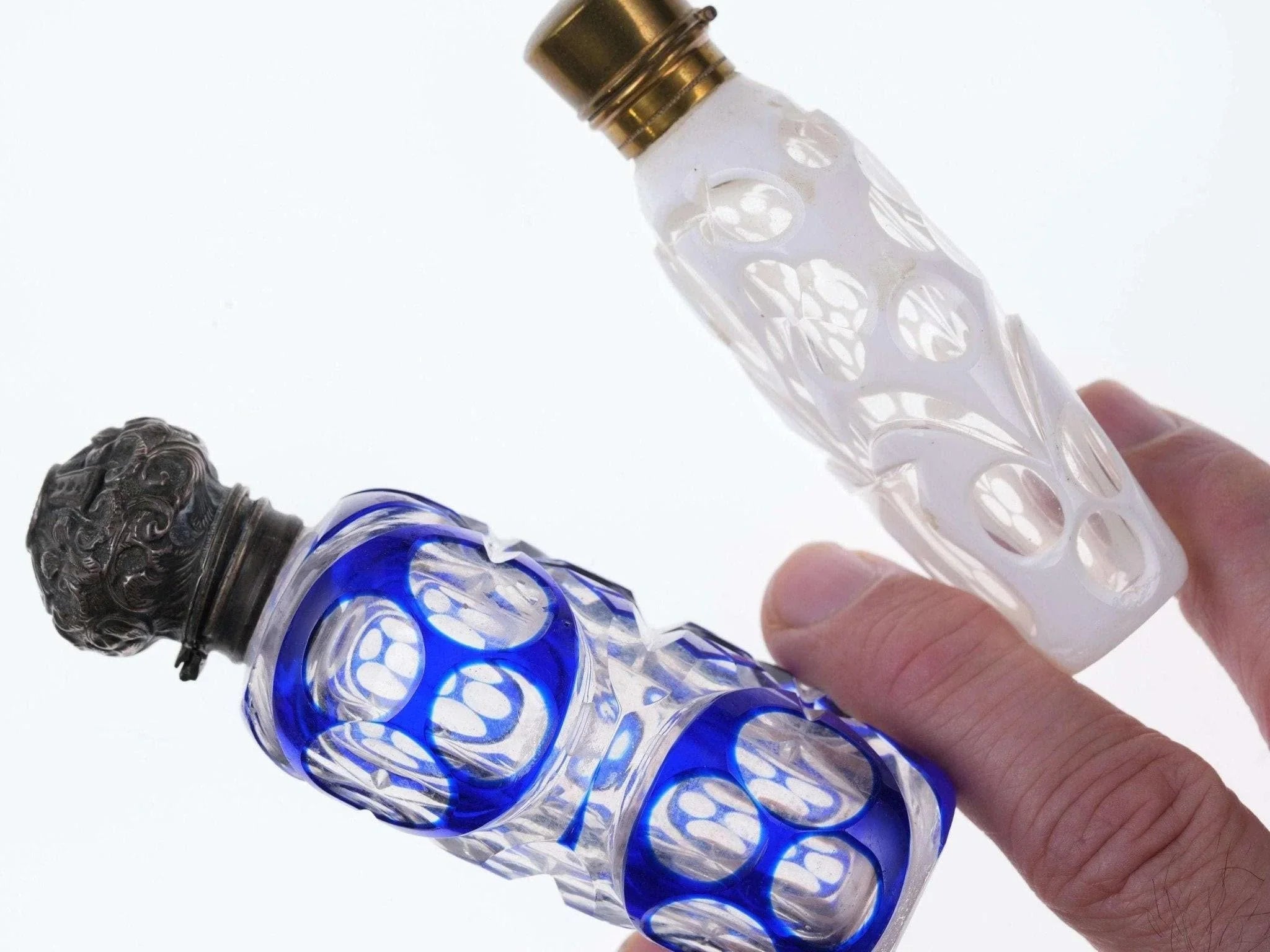 c1880 Weiß/Kobalt, geschliffen für klare Duftflaschen. Eines mit Sterlingplatte, eines mit Originalständer. Kein Halt im Innenstopfen, das Messingscharnier ist in Ordnung, das Sterlingscharnier ist kaputt. Chip am inneren Rand der Kobaltflasche unter der Sterling-Einlage, keine weiteren Chips, keine Risse. Verkaufe beide Flaschen, die größte 4"