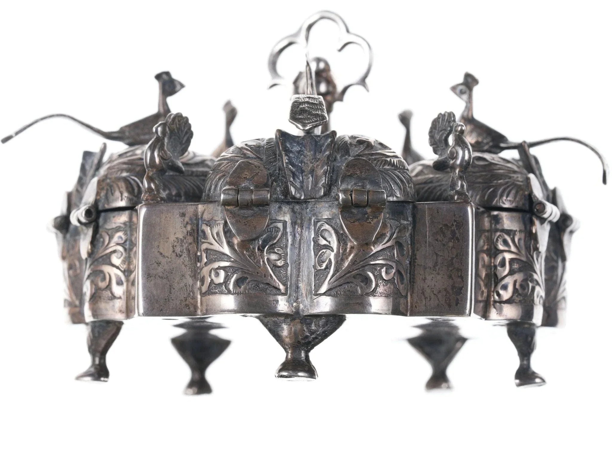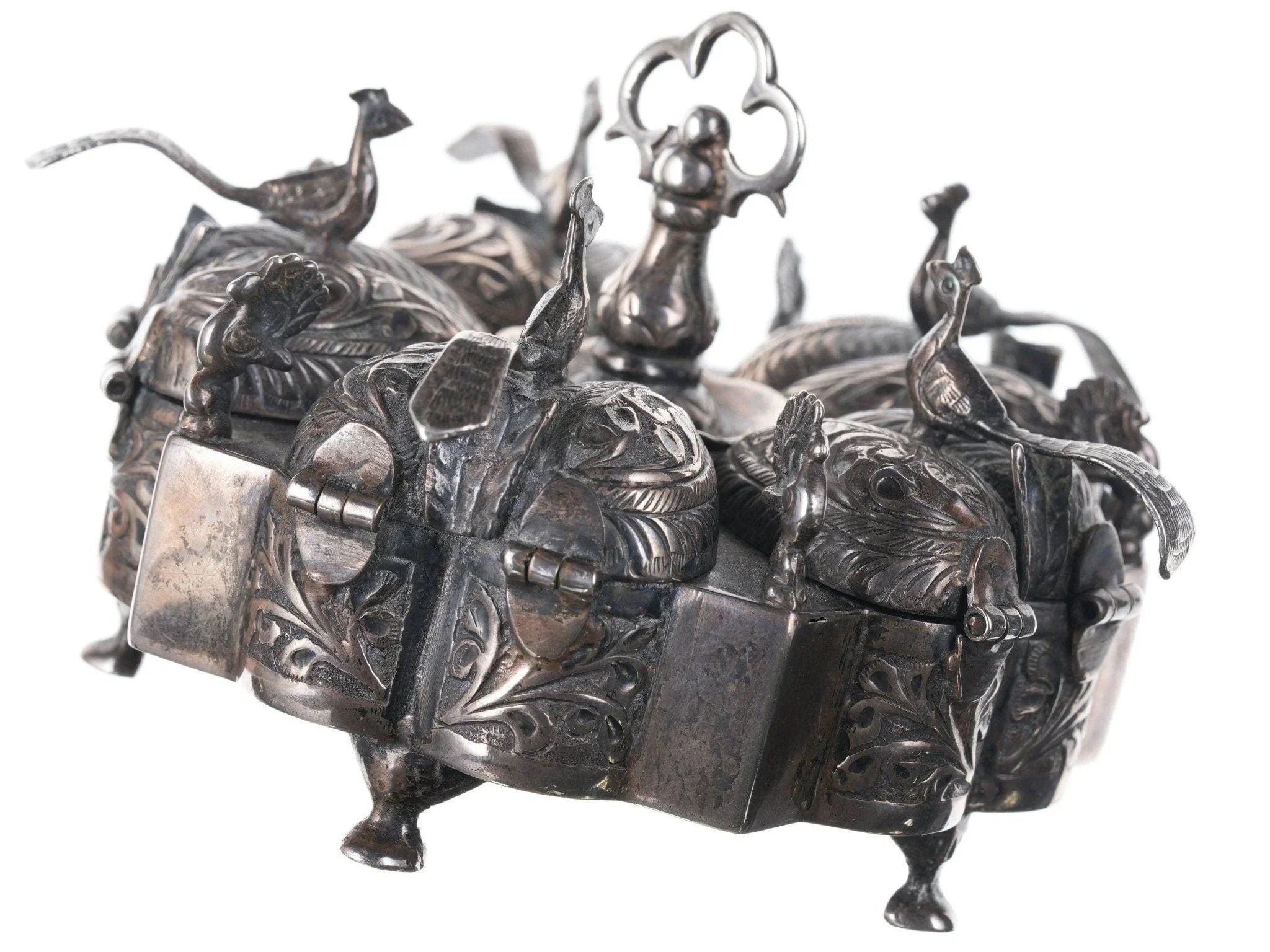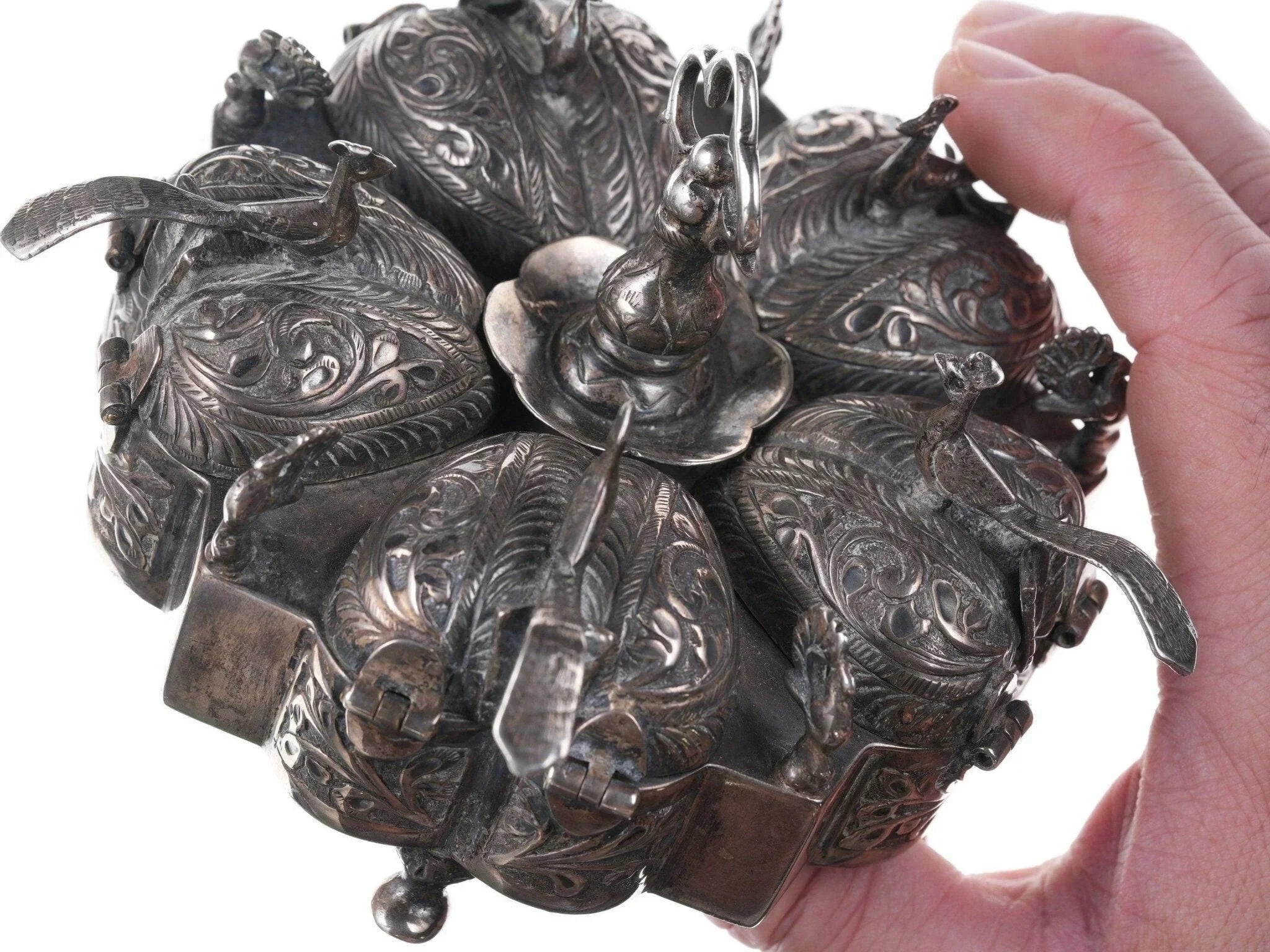 Antike indische Gewürzdose aus Silber, 19. Jahrhundert. Ein ähnliches Exemplar befindet sich im Victoria & Albert Museum, Ref.-Nummer 02672(IS), Betelnuss-förmige Deckel, Pfauen-Endstücke, in jeder Hinsicht großartig. Wirklich eine erstaunliche Sache mit 5 Klappdeckeln und einem mittigen Gewindegriff, der zum Anheben der Deckel abgeschraubt werden muss und beim Festschrauben die Deckel an Ort und Stelle hält. 5,5" breit x 3,75" hoch, sehr dick, massiv, mit hohem Silbergehalt, markiert und getestet. 545,1 Gramm.