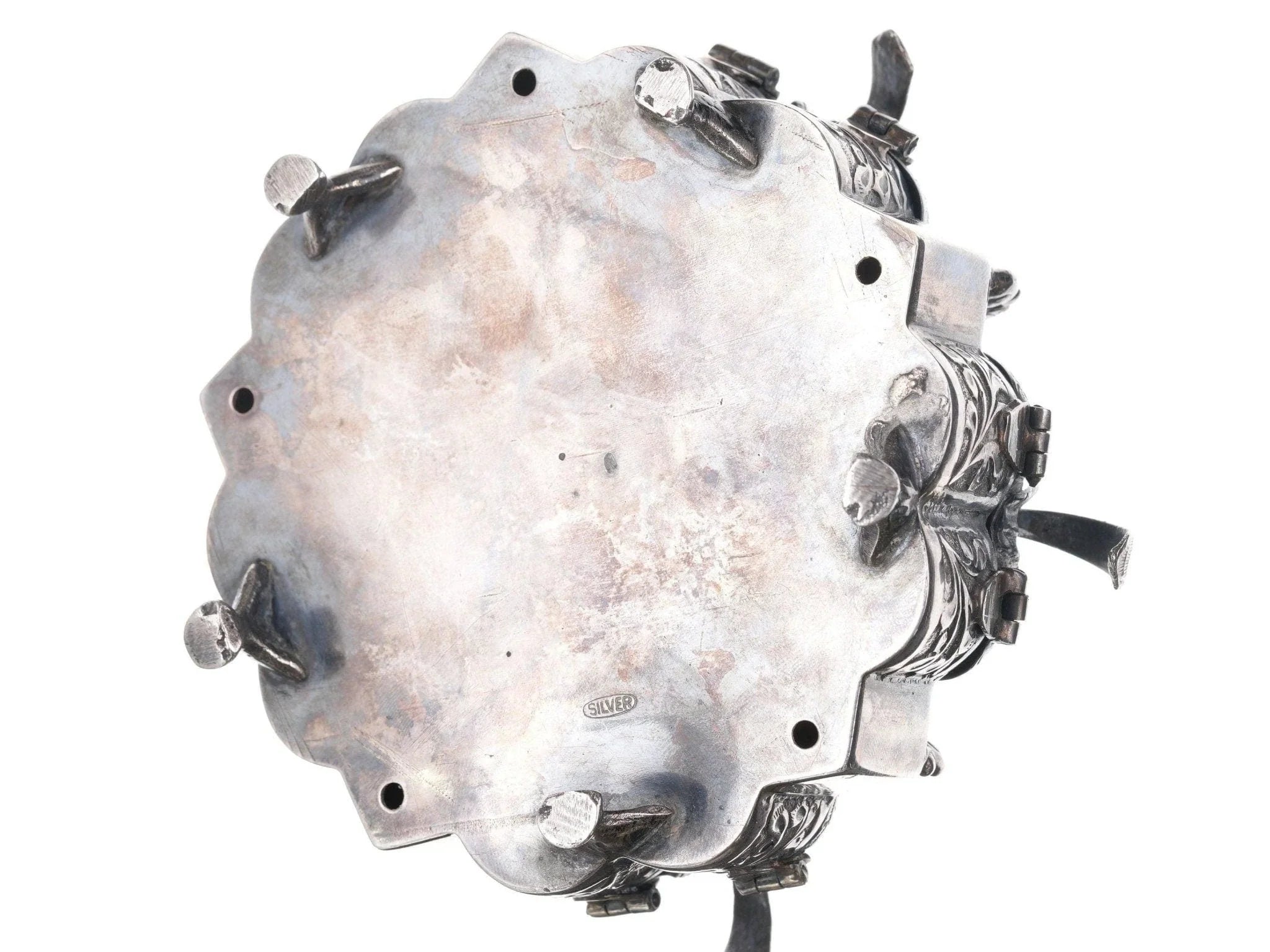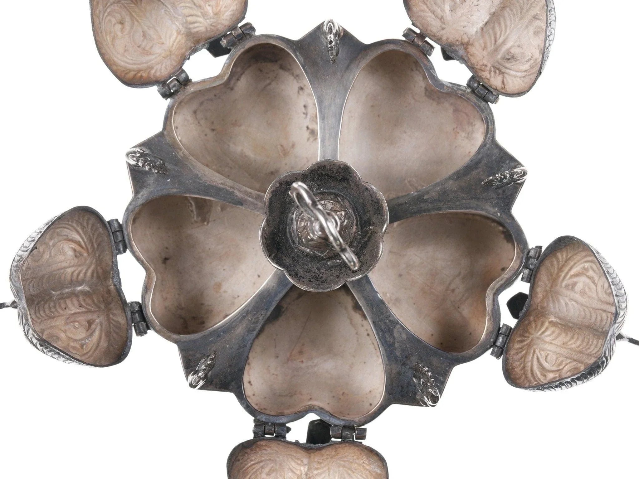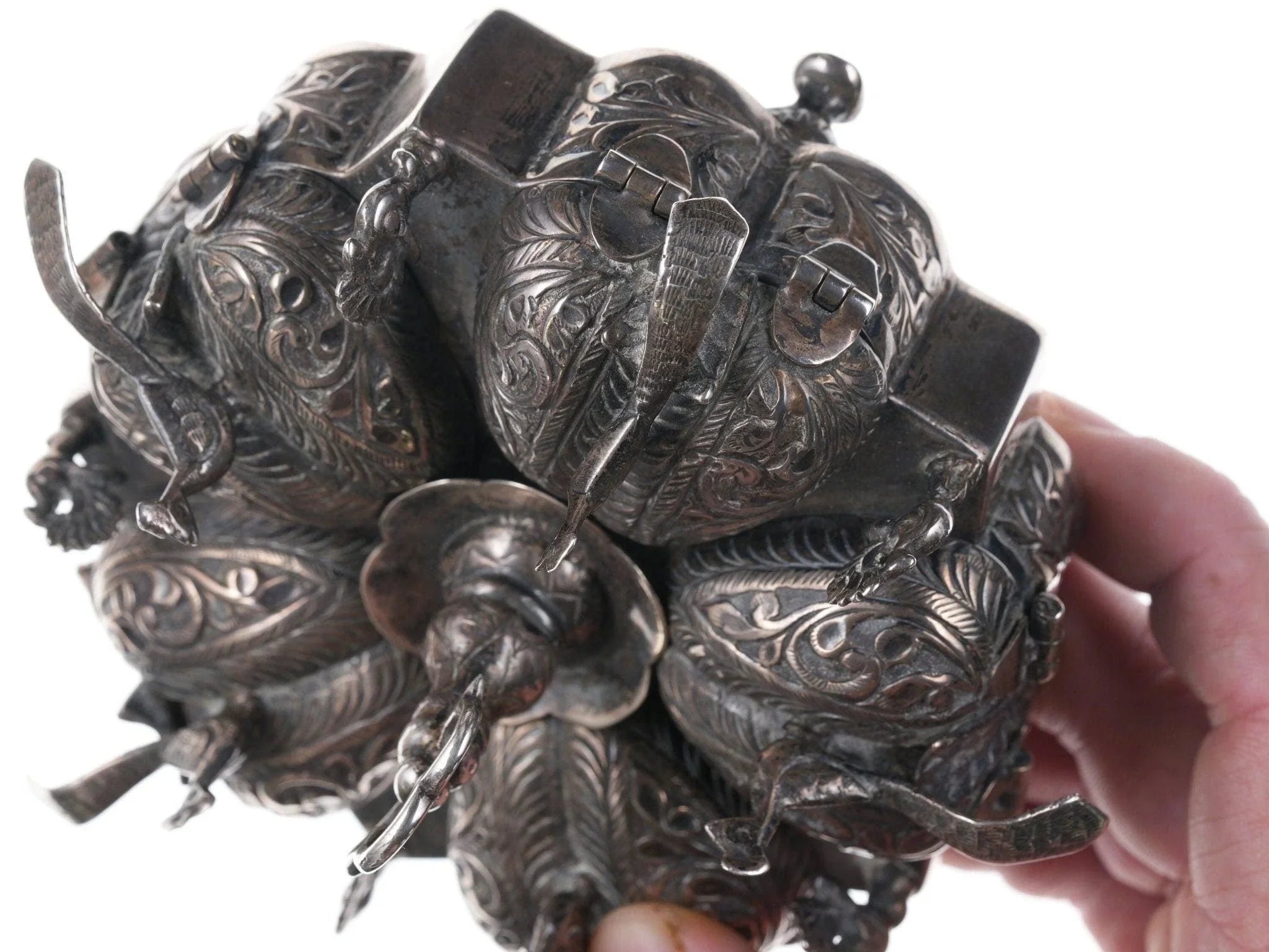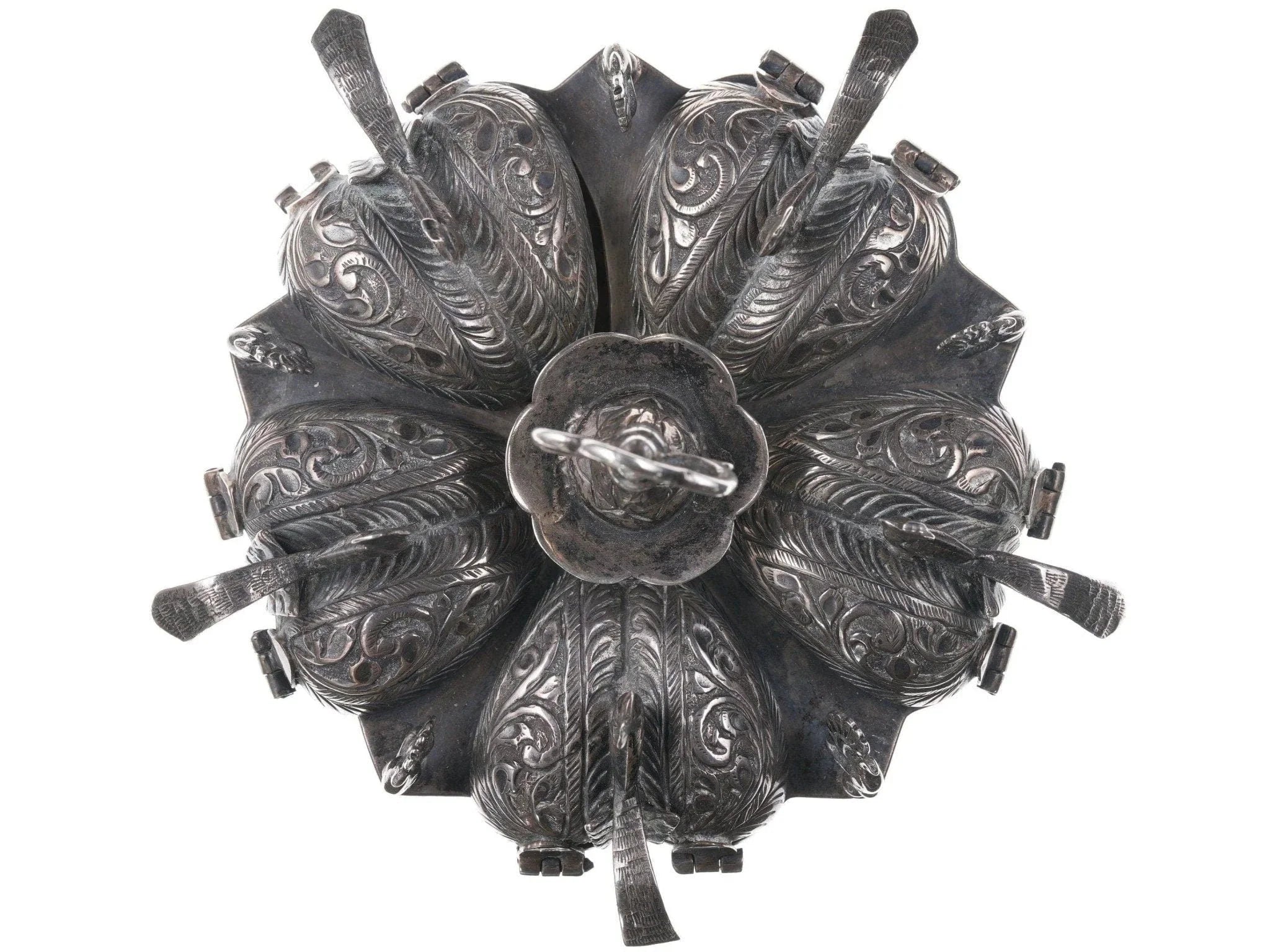 Antike indische Gewürzdose aus Silber, 19. Jahrhundert. Ein ähnliches Exemplar befindet sich im Victoria & Albert Museum, Ref.-Nummer 02672(IS), Betelnuss-förmige Deckel, Pfauen-Endstücke, in jeder Hinsicht großartig. Wirklich eine erstaunliche Sache mit 5 Klappdeckeln und einem mittigen Gewindegriff, der zum Anheben der Deckel abgeschraubt werden muss und beim Festschrauben die Deckel an Ort und Stelle hält. 5,5" breit x 3,75" hoch, sehr dick, massiv, mit hohem Silbergehalt, markiert und getestet. 545,1 Gramm.