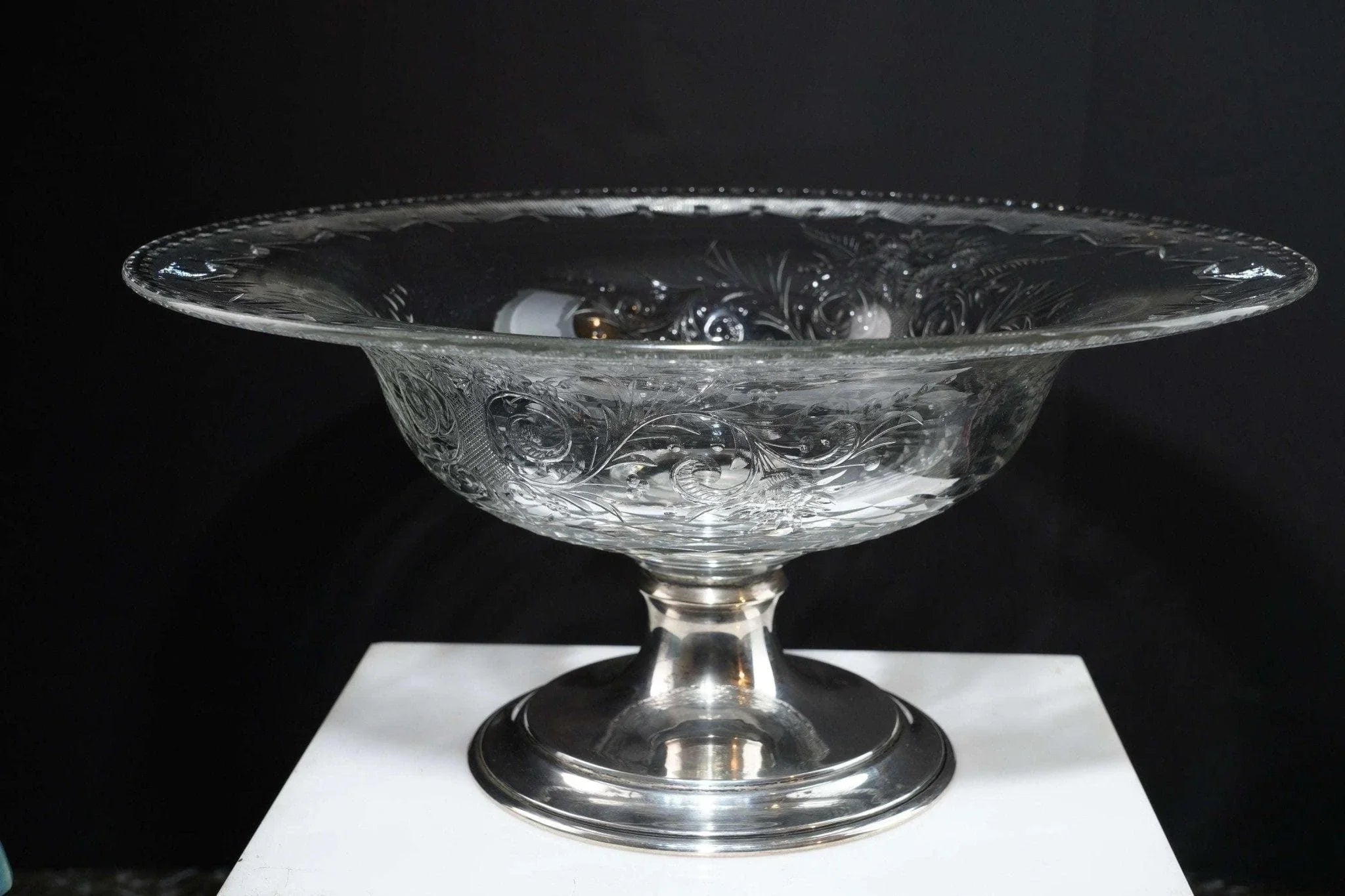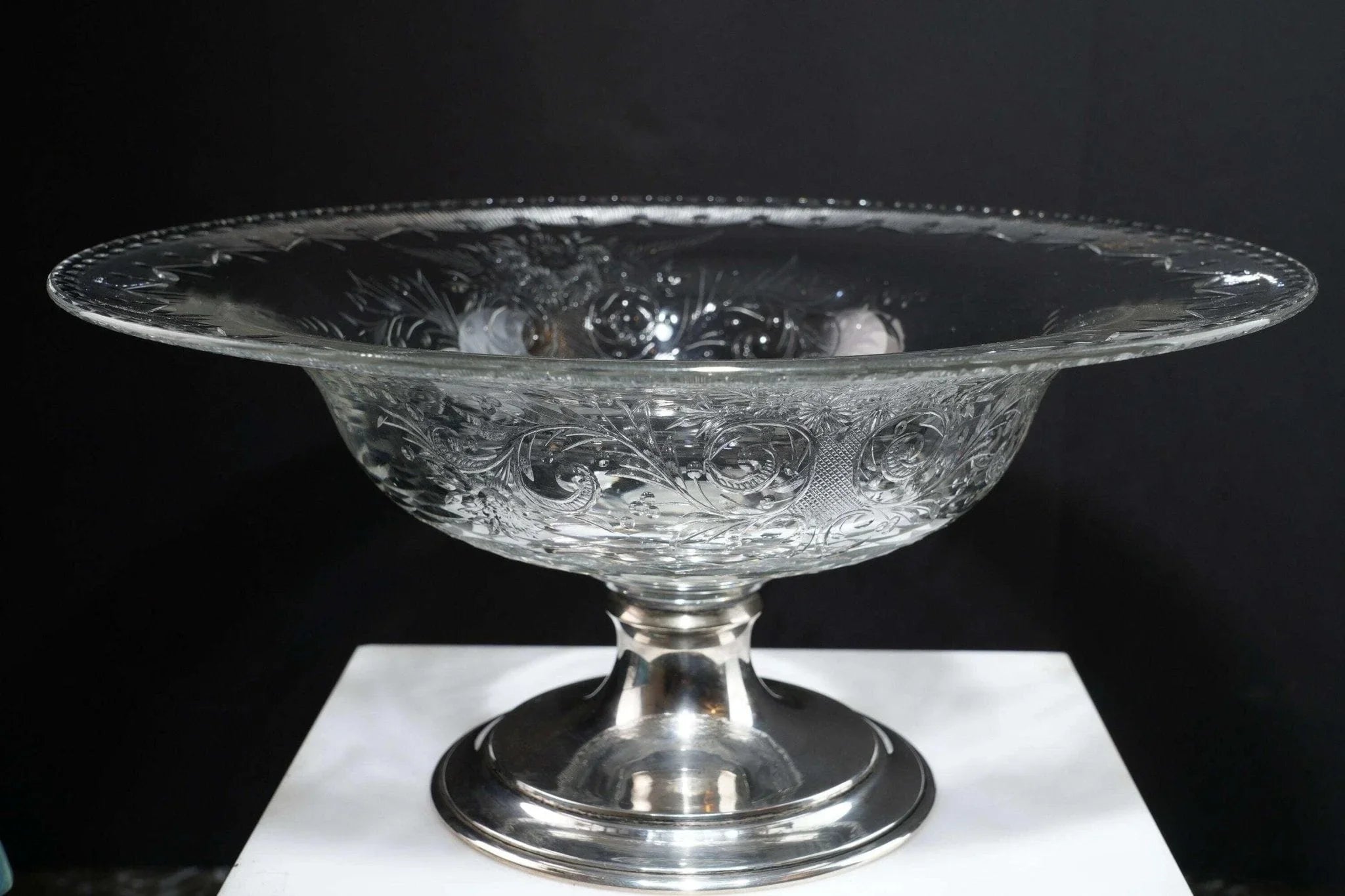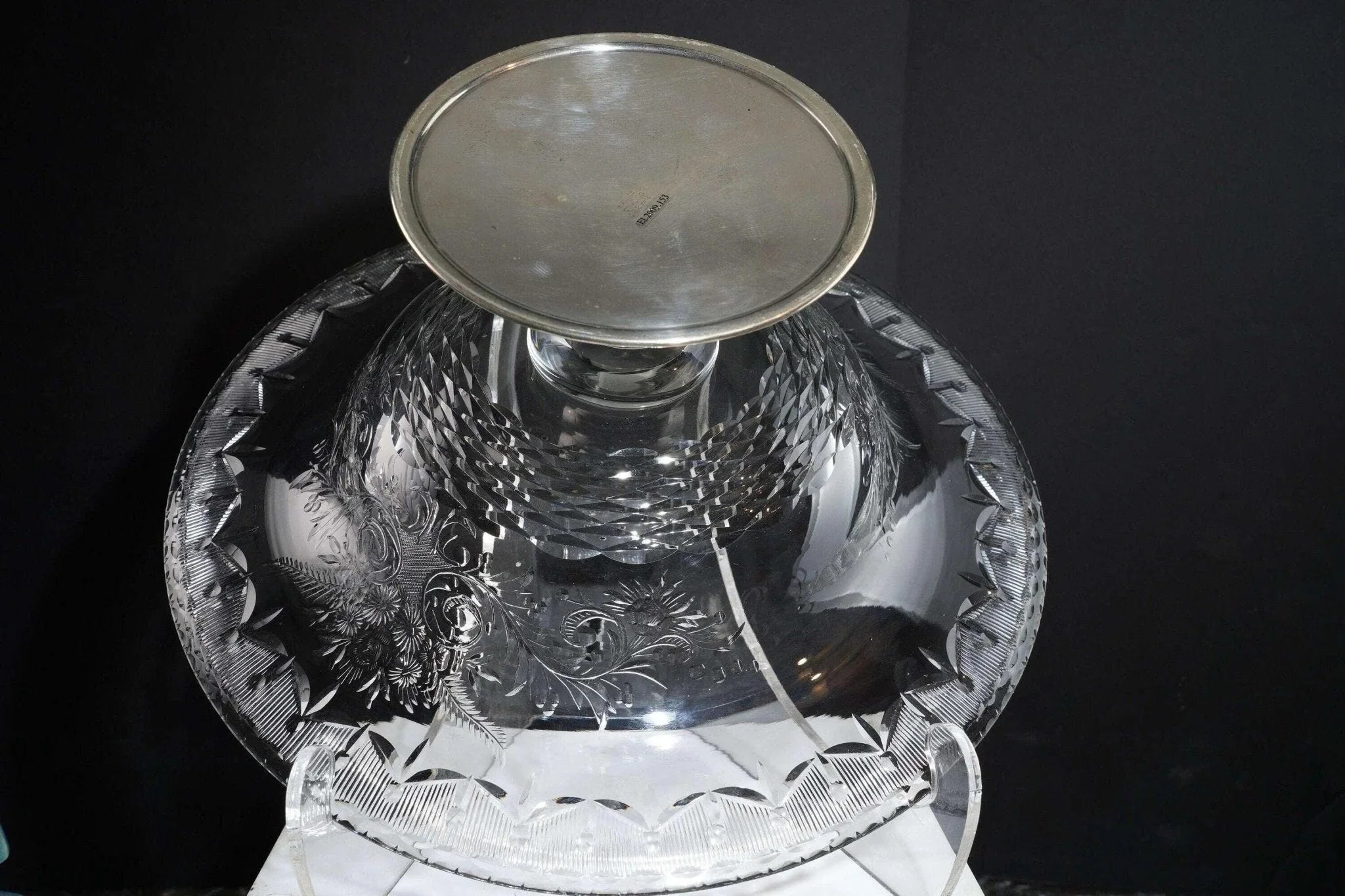 Hawkes Sterling Base Cut Glass Centerpiece Kompott. Schale aus geschliffenem Hawkes-Glas mit einer Urne und verschlungenen Blumen in einem Sockel aus Sterlingsilber mit der Aufschrift „Hawkes Sterling“, 12 1/2" breit und 6" hoch. HINWEIS: Ausgestellt im Wichita Art Museum, wo sich derzeit eine Dauerausstellung der Burnstein-Sammlung befindet. Alle Museums-ID-Tags können entfernt werden. PROVENIENZ: Sammlung Burnstein.