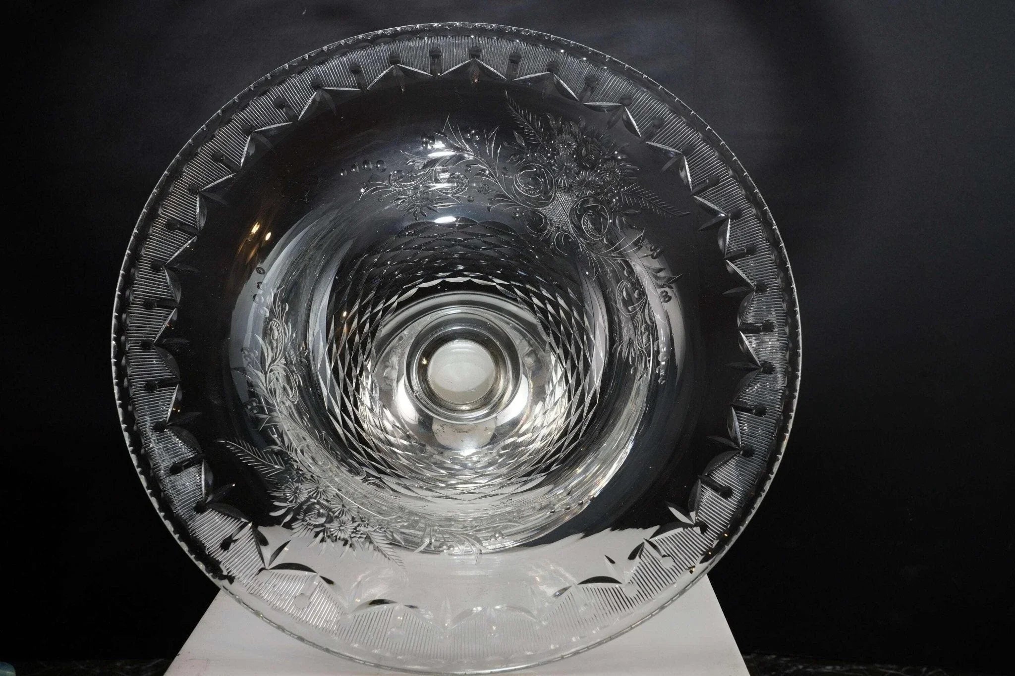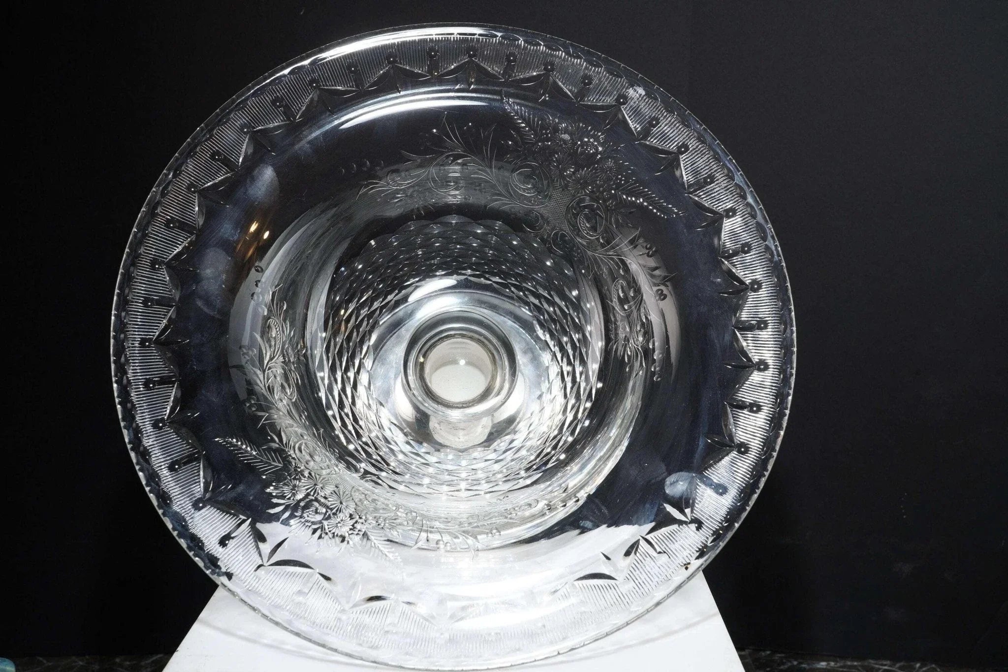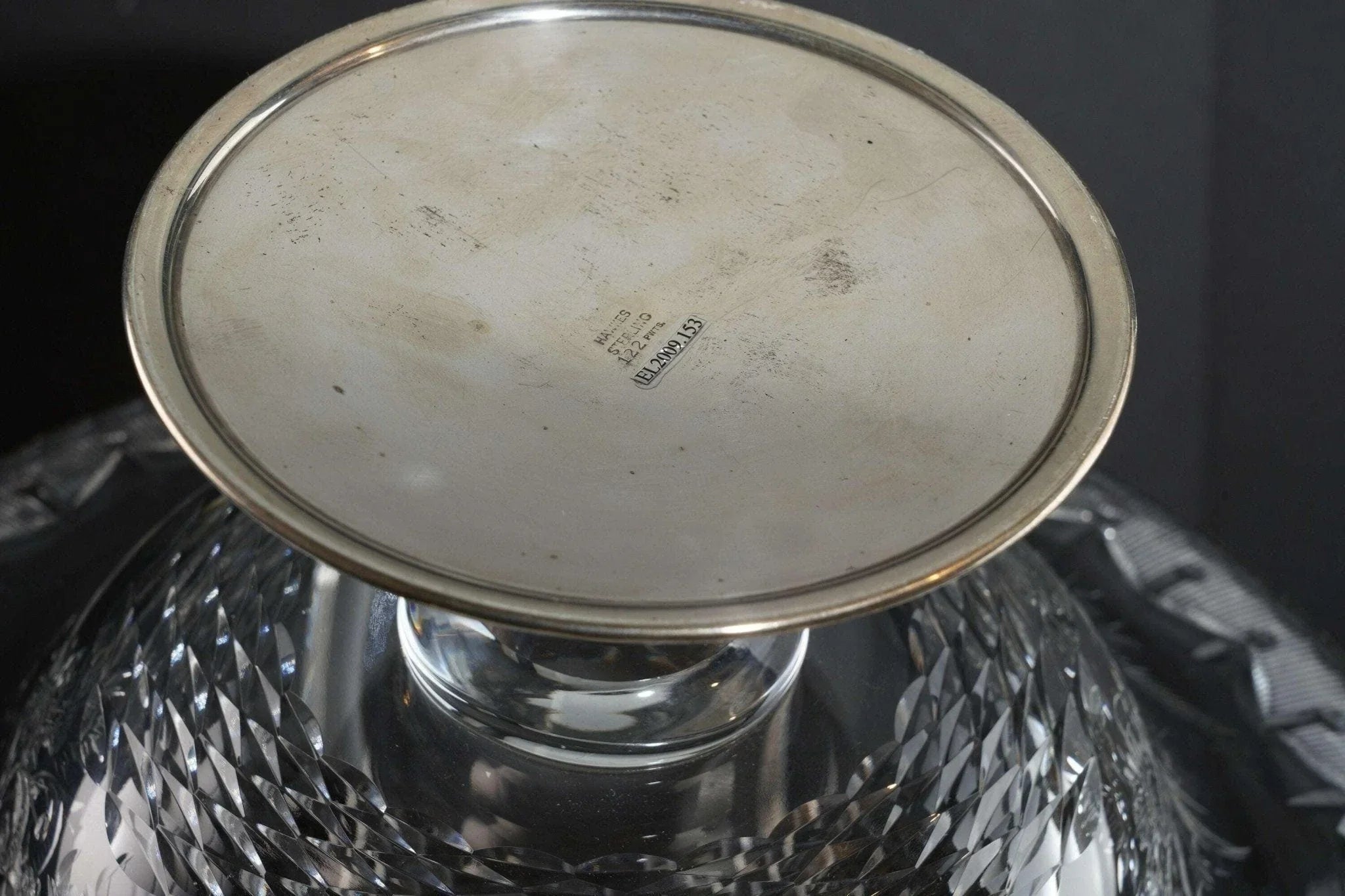 Hawkes Sterling Base Cut Glass Centerpiece Kompott. Schale aus geschliffenem Hawkes-Glas mit einer Urne und verschlungenen Blumen in einem Sockel aus Sterlingsilber mit der Aufschrift „Hawkes Sterling“, 12 1/2" breit und 6" hoch. HINWEIS: Ausgestellt im Wichita Art Museum, wo sich derzeit eine Dauerausstellung der Burnstein-Sammlung befindet. Alle Museums-ID-Tags können entfernt werden. PROVENIENZ: Sammlung Burnstein.