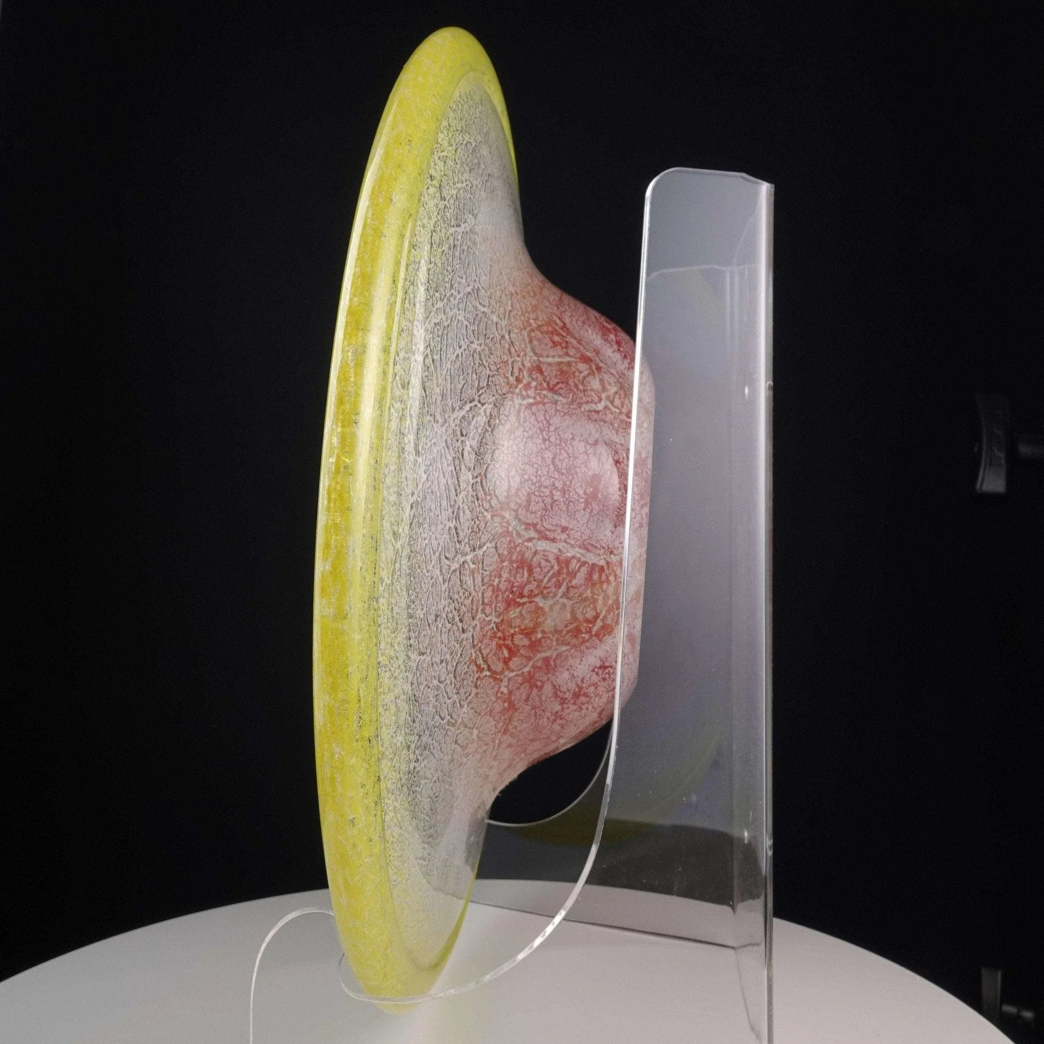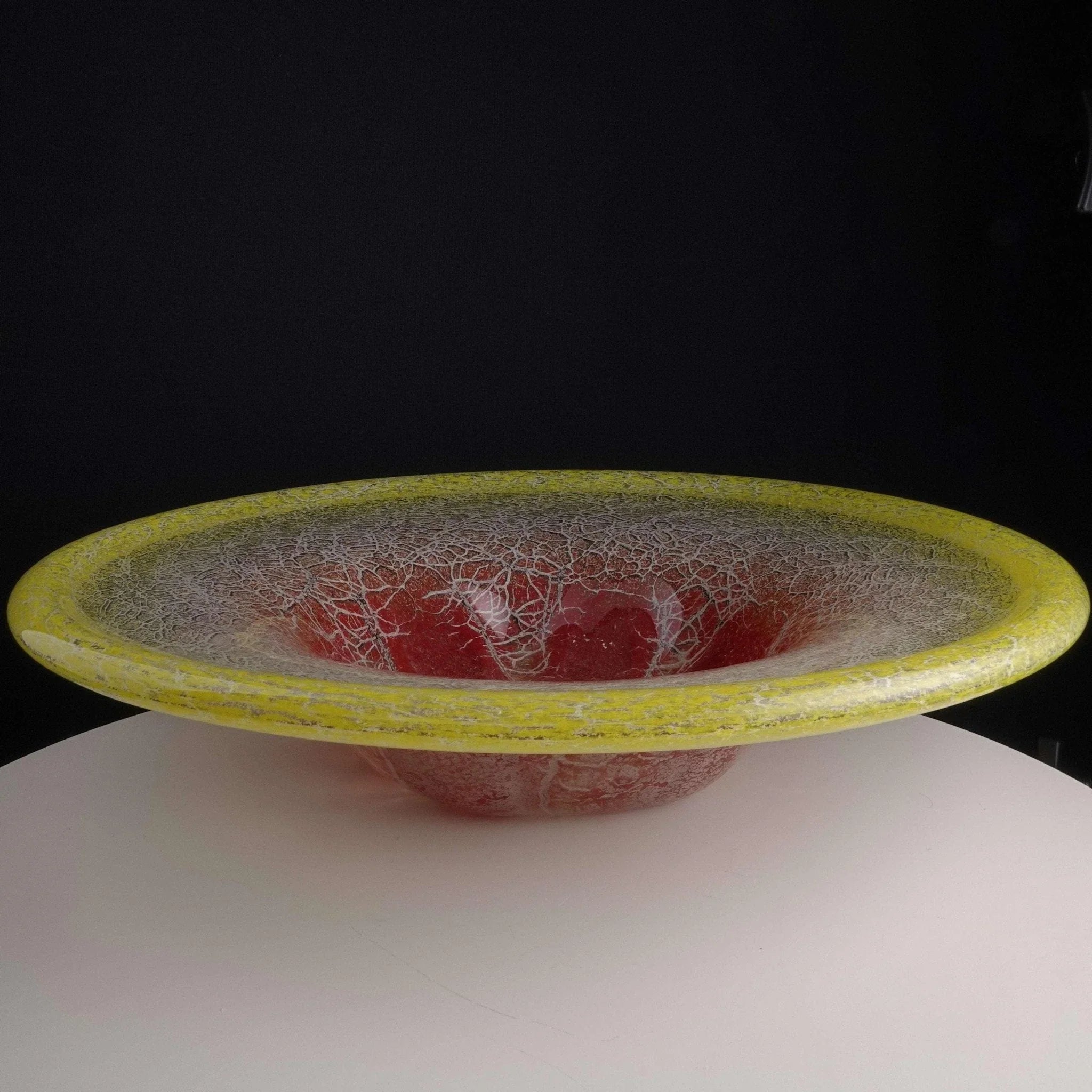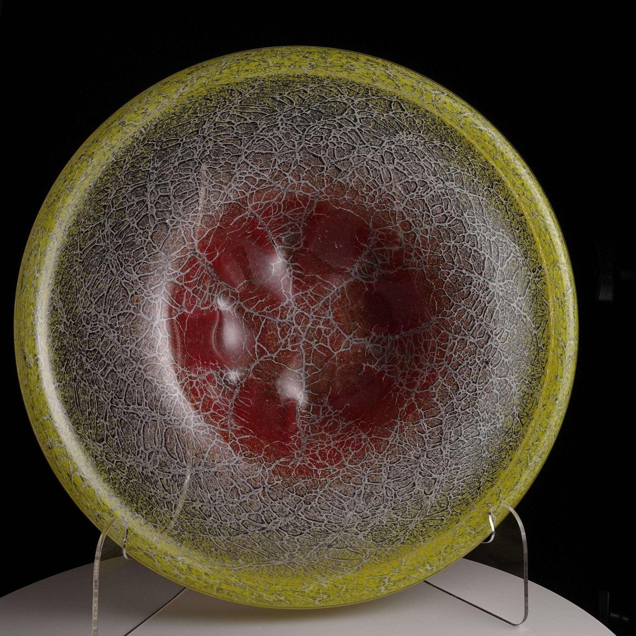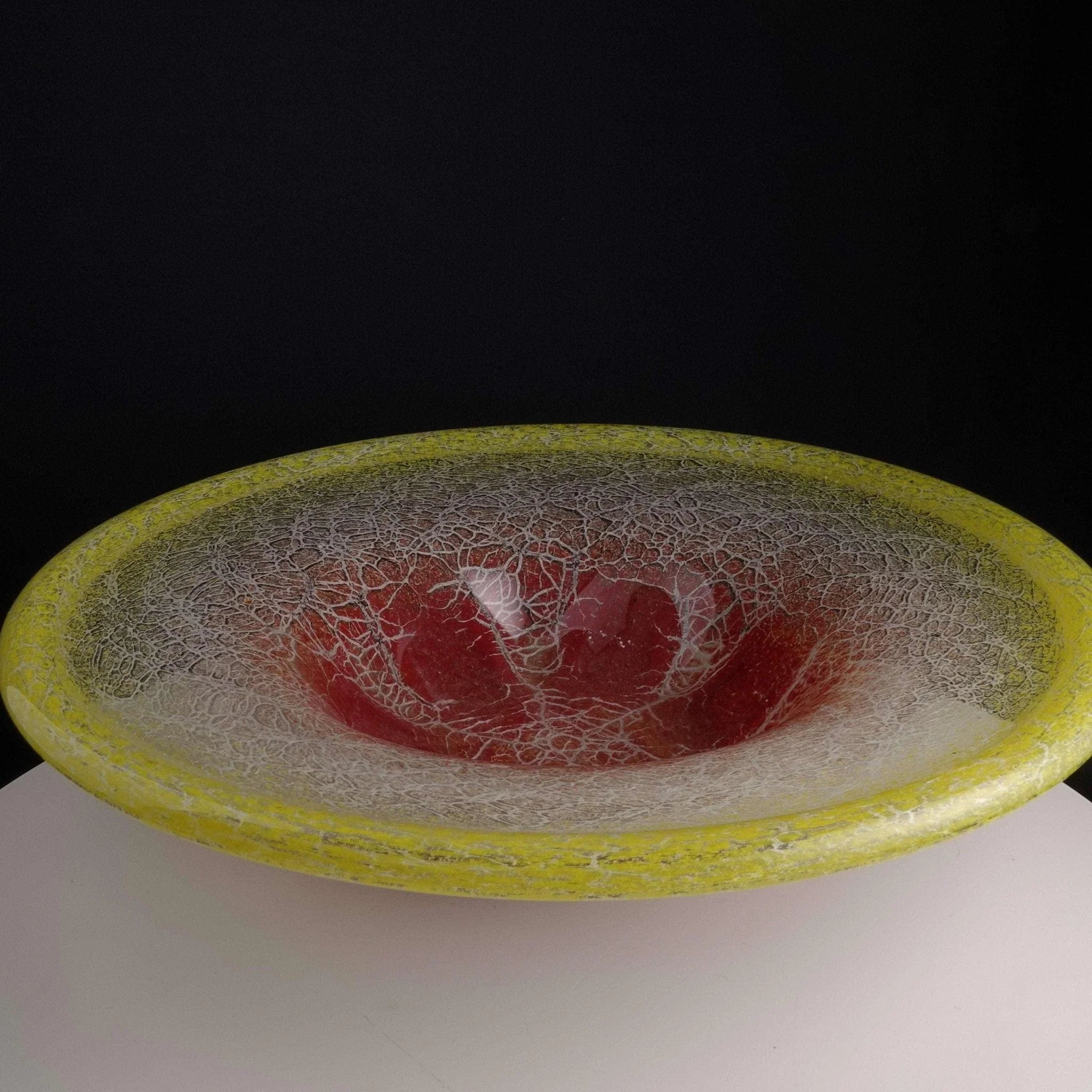 Diese sind normalerweise 12", vielleicht 14", dieses misst 17 7/8" breit x 4" hoch. Es ist nicht markiert und trug ursprünglich ein Papieretikett. Garantiert ca. 1930-1950 WMF Ikora. Spricht so ziemlich für sich. Keine Risse oder Chips. Auf der Oberseite gibt es keine Kratzer, aber die Basis weist Gebrauchsspuren und direkt neben der Basis einige Abnutzungserscheinungen auf. Entwickelt von Karl Wiedmann und hergestellt von der Württembergischen Metallwarenfabrik (WMF) in Deutschland.
