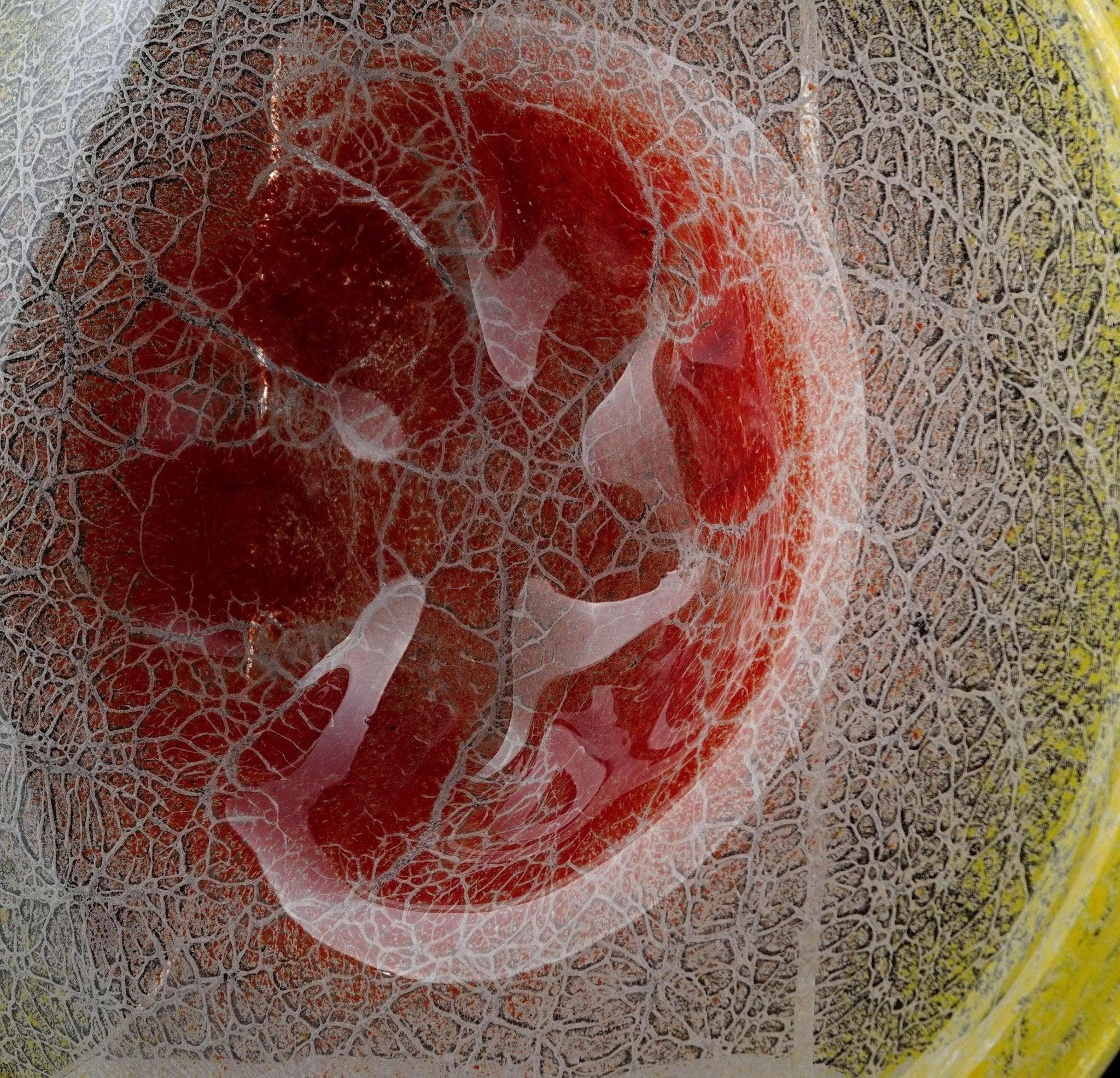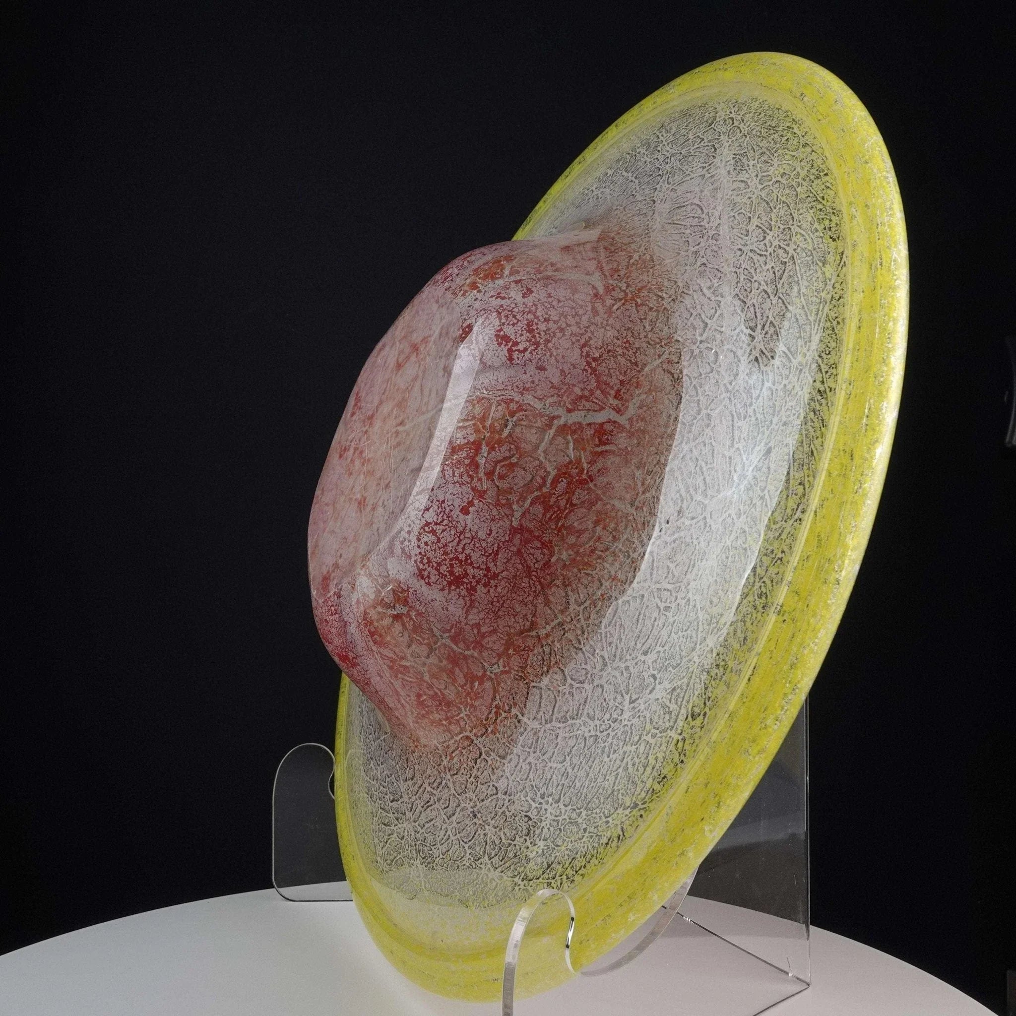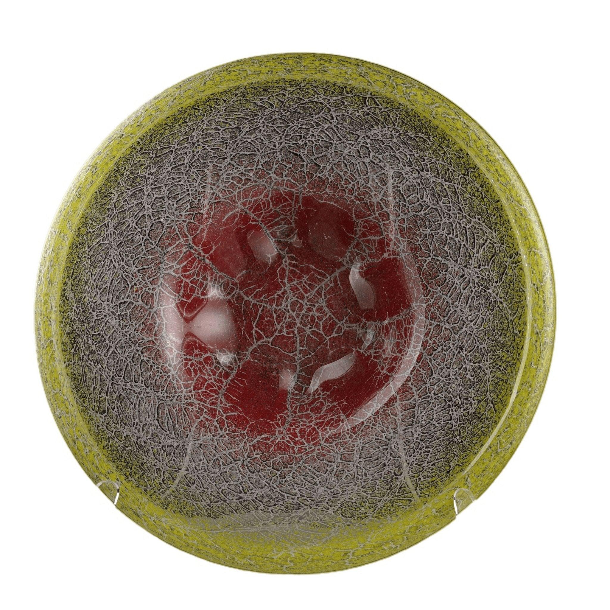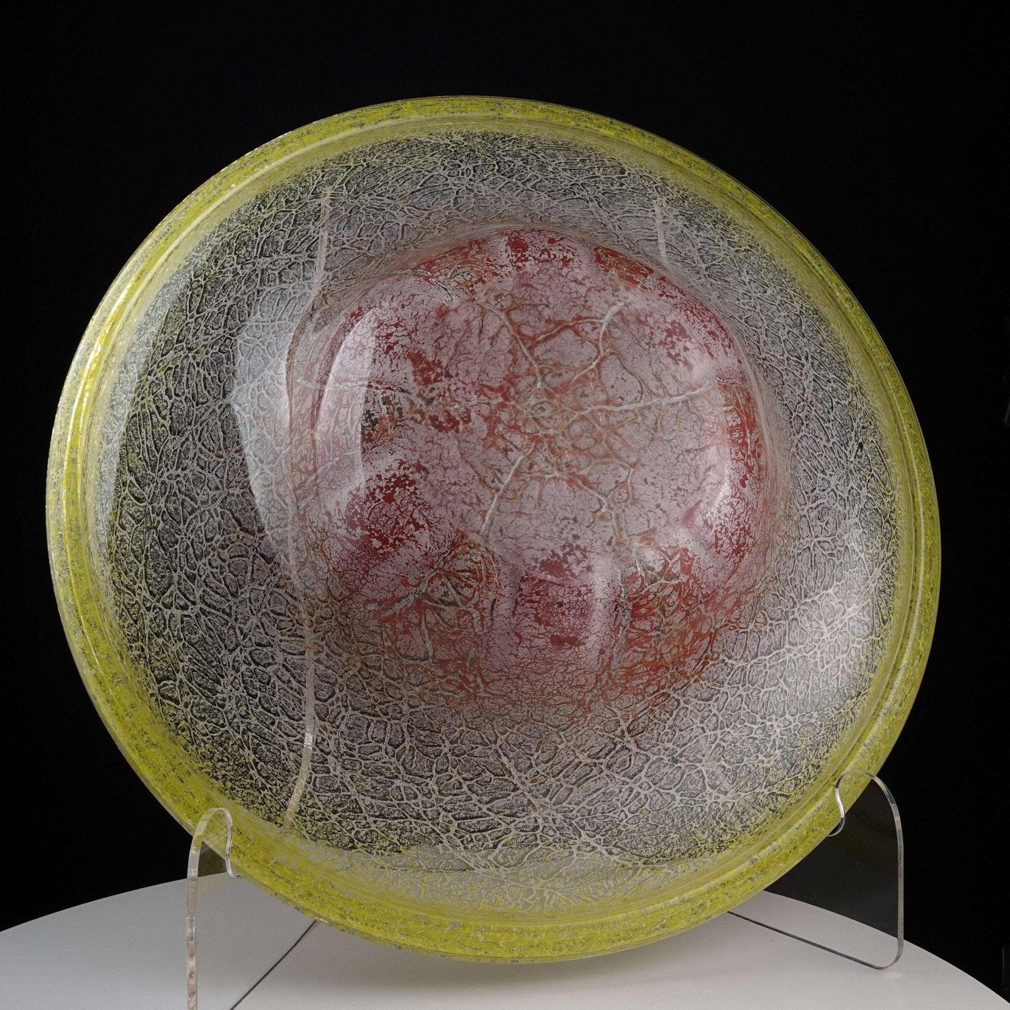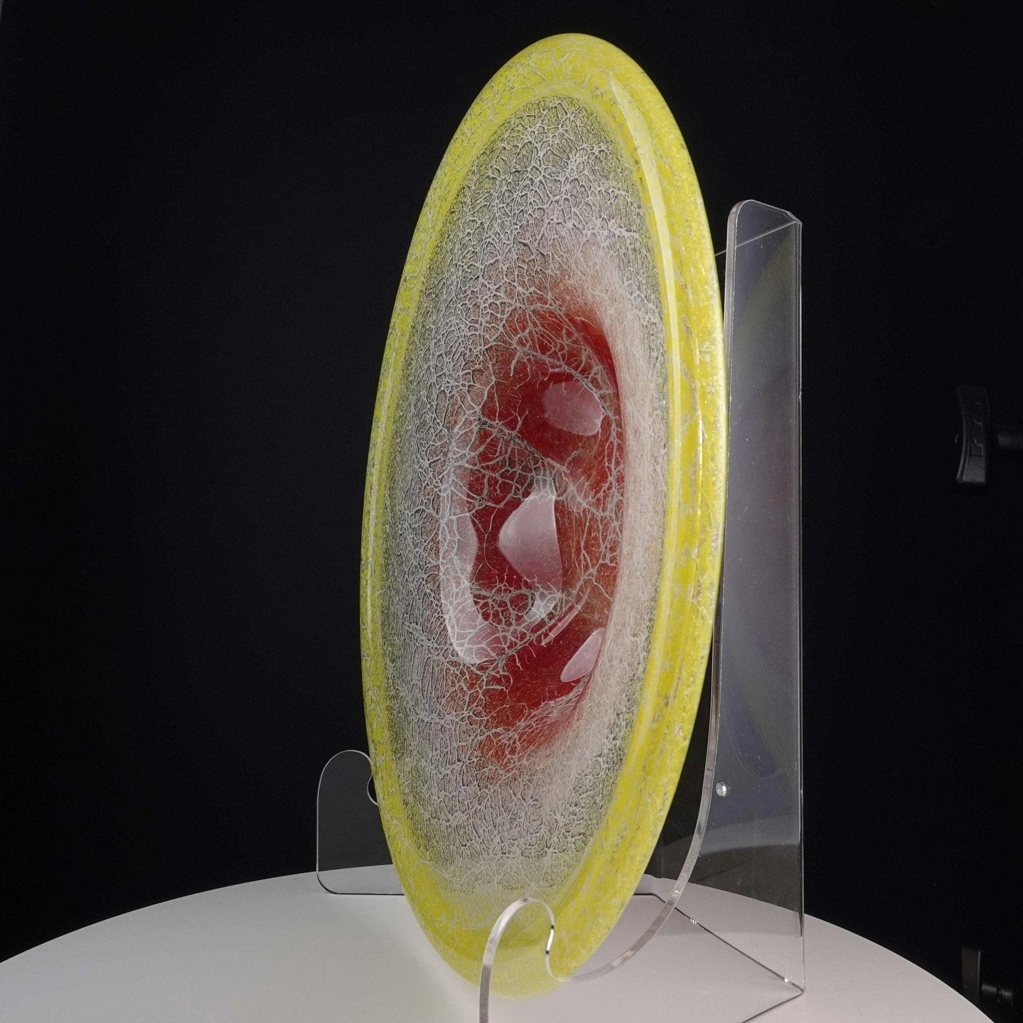 Diese sind normalerweise 12", vielleicht 14", dieses misst 17 7/8" breit x 4" hoch. Es ist nicht markiert und trug ursprünglich ein Papieretikett. Garantiert ca. 1930-1950 WMF Ikora. Spricht so ziemlich für sich. Keine Risse oder Chips. Auf der Oberseite gibt es keine Kratzer, aber die Basis weist Gebrauchsspuren und direkt neben der Basis einige Abnutzungserscheinungen auf. Entwickelt von Karl Wiedmann und hergestellt von der Württembergischen Metallwarenfabrik (WMF) in Deutschland.