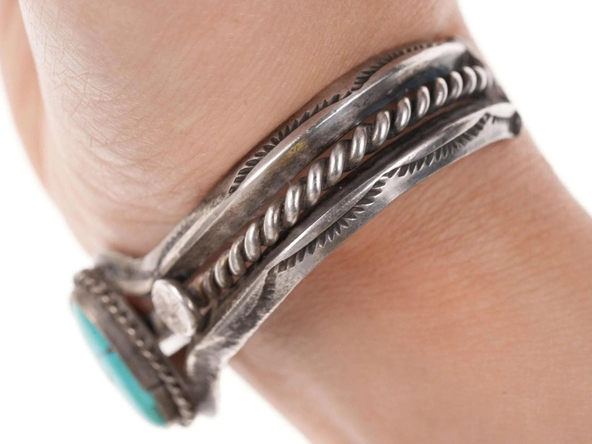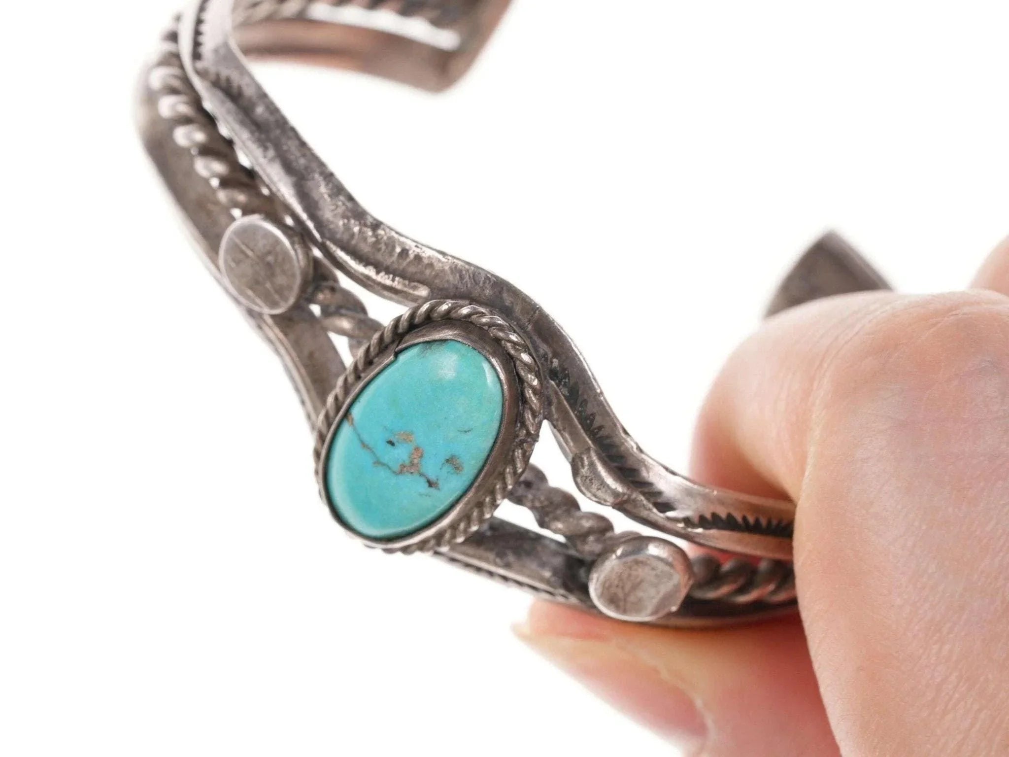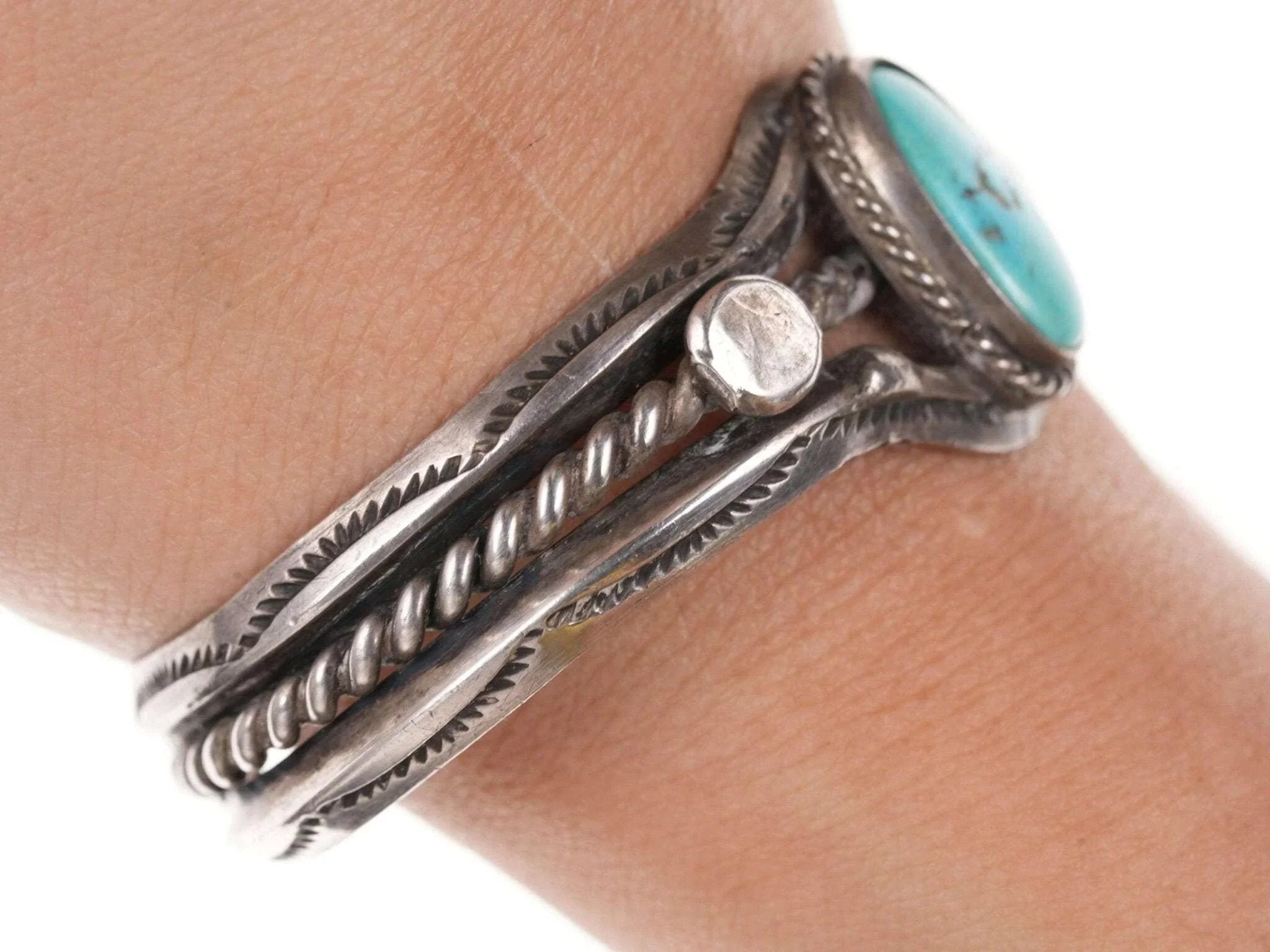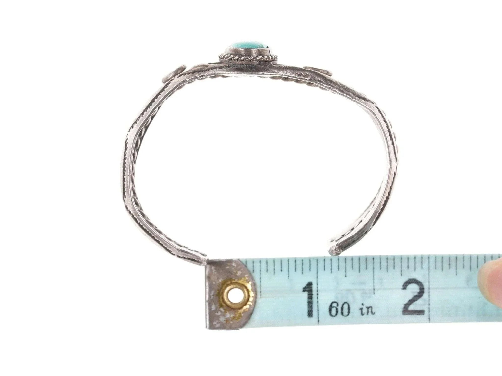 Vintage Silber/Türkis Manschettenarmband der amerikanischen Ureinwohner. Passt ohne Probleme an ein Handgelenk mit einem Umfang von bis zu 6 Zoll und einer Lücke von 1 1/8 Zoll. Ohne Markierung