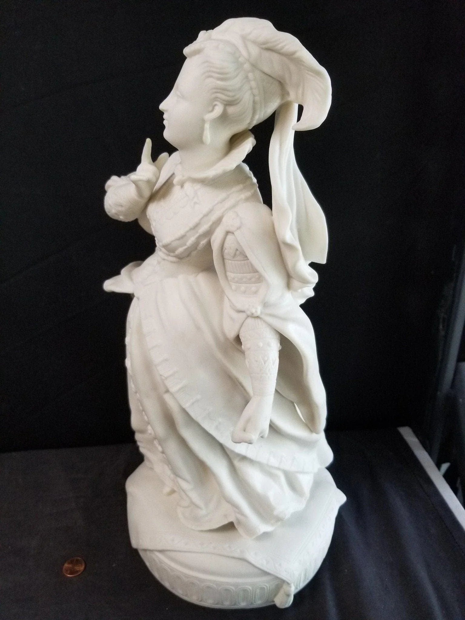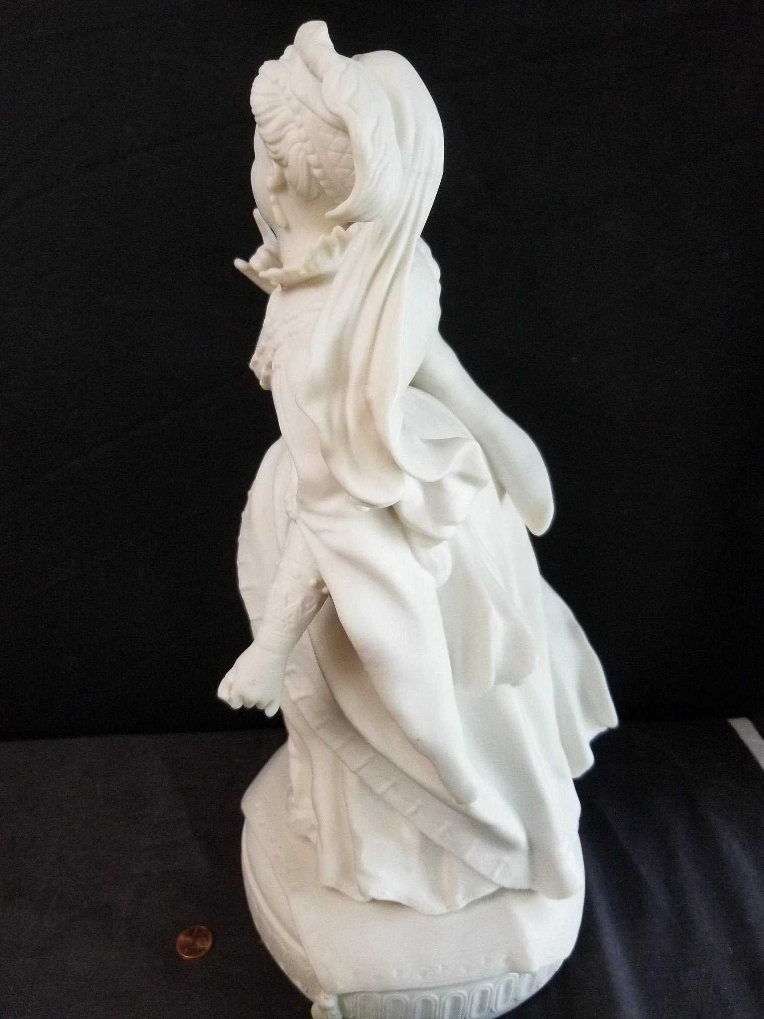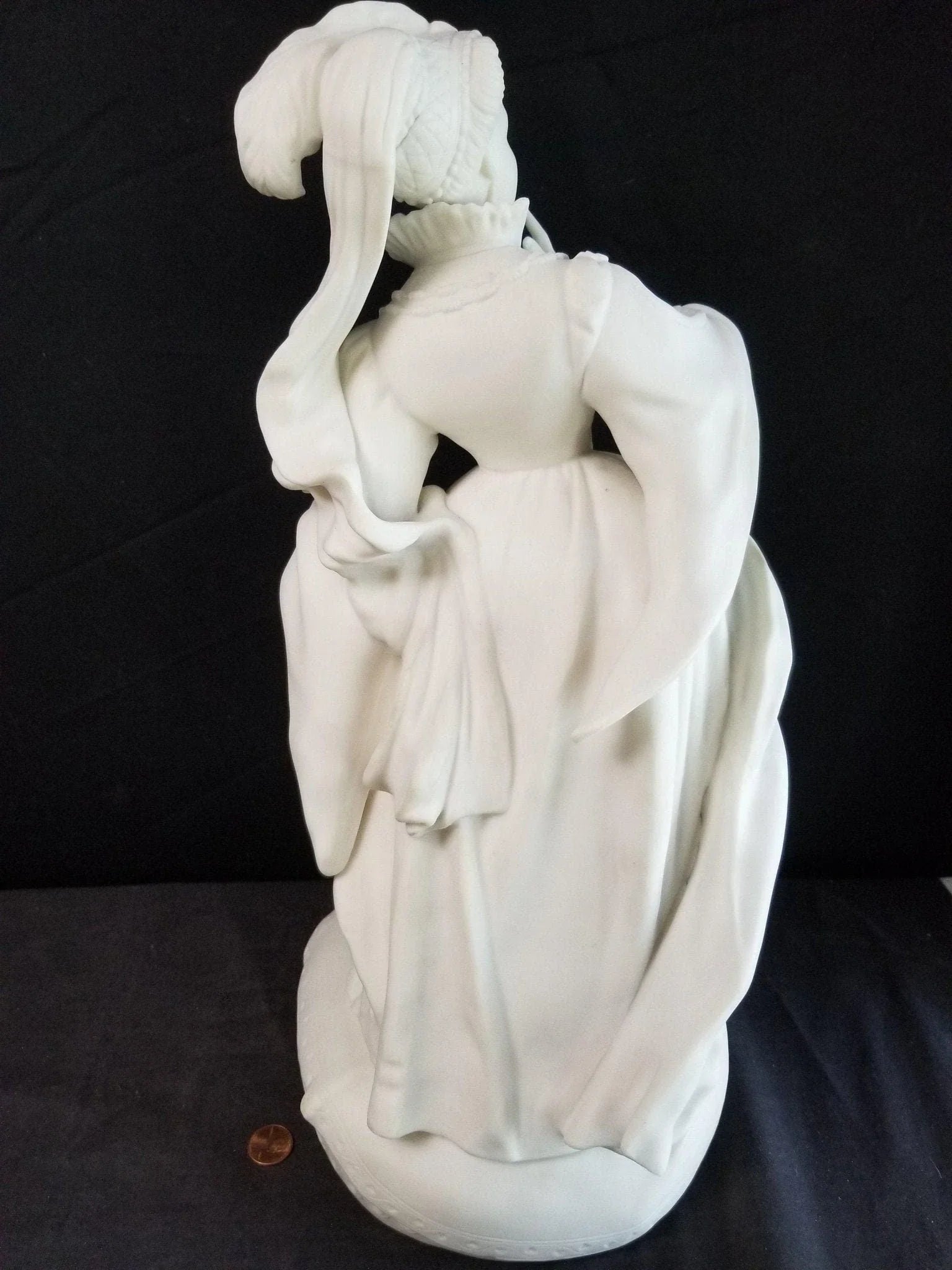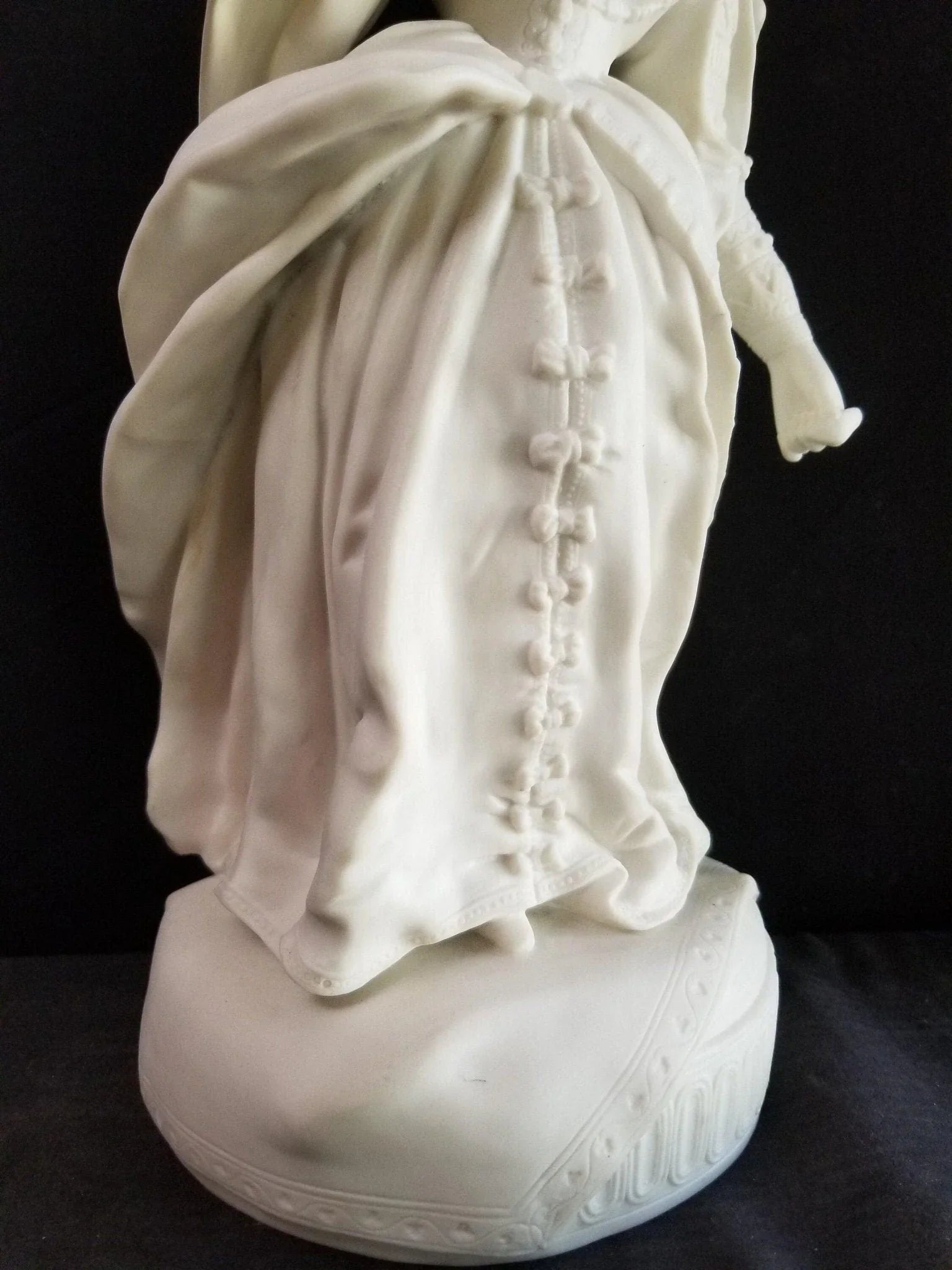 16 5/8" große antike Parian-Figurenskulptur, Frau in verziertem Kleid, 19. Jahrhundert, 8" breit an der Basis. Kleiner Chip am Innenrand des Sockels. Keine Risse, andere Chips oder Restaurierungen. Großes schweres Stück. Wiegt 9 Pfund. Mit „B&B“ gekennzeichnet, oben mit „H“ und unten mit „S“ in einer Raute.