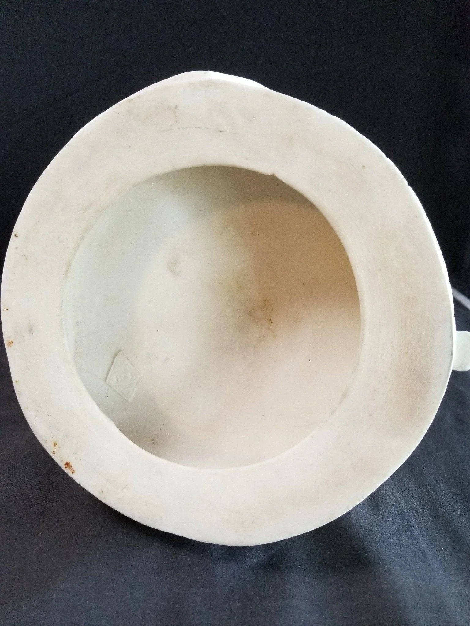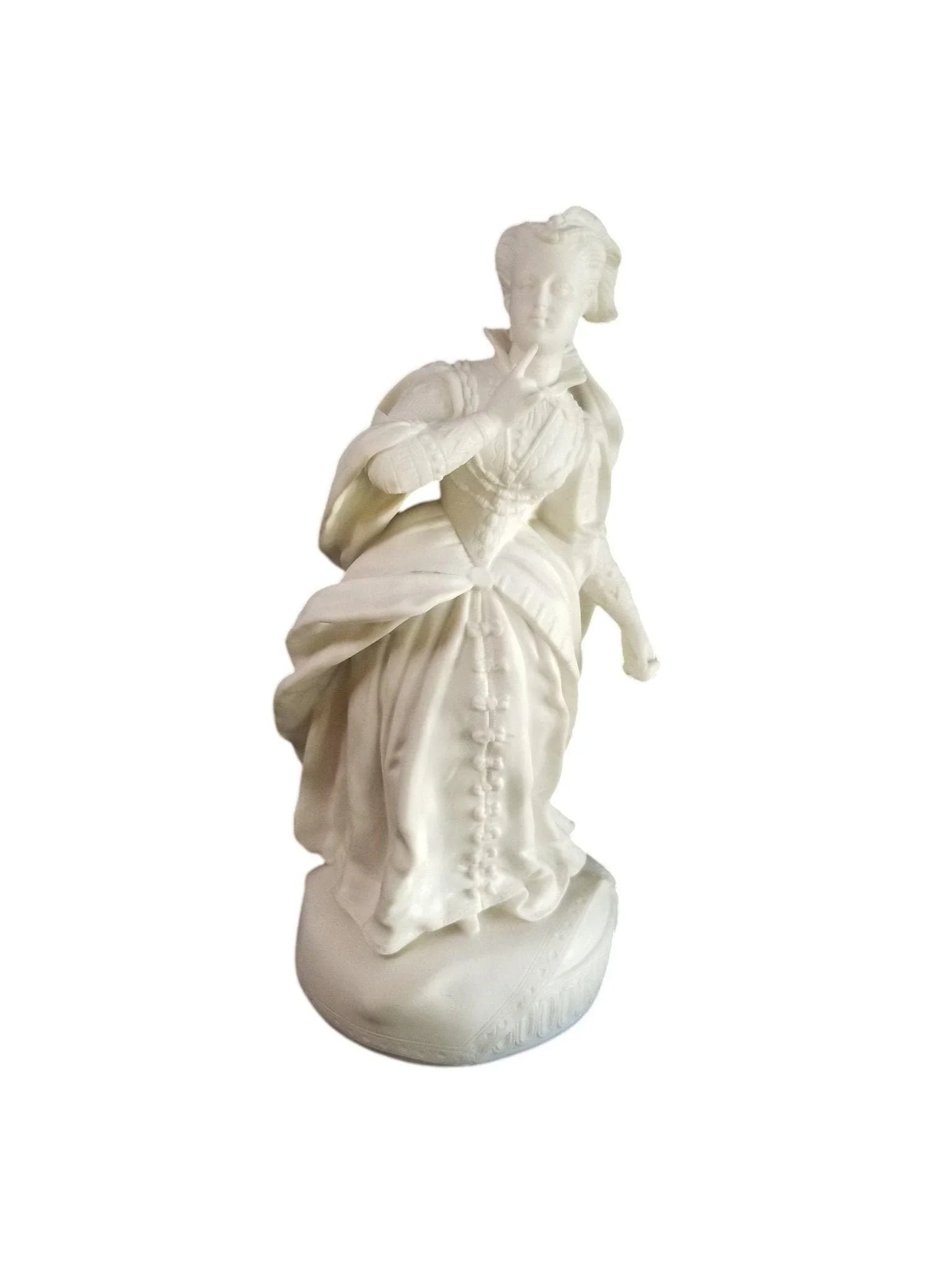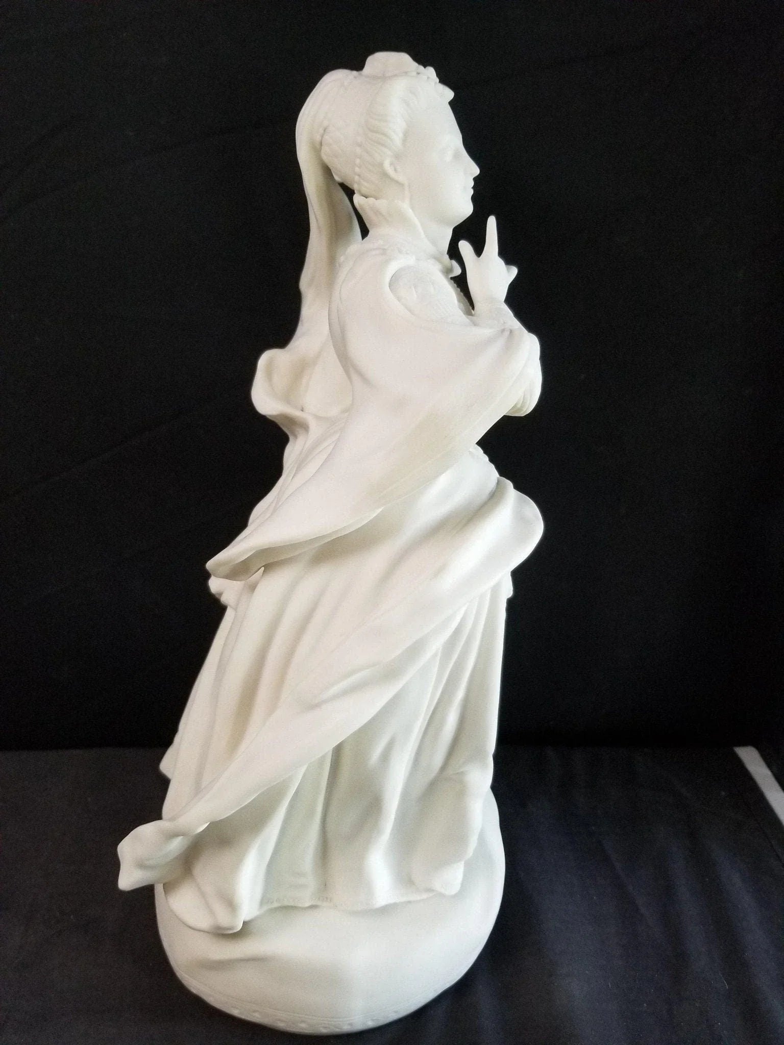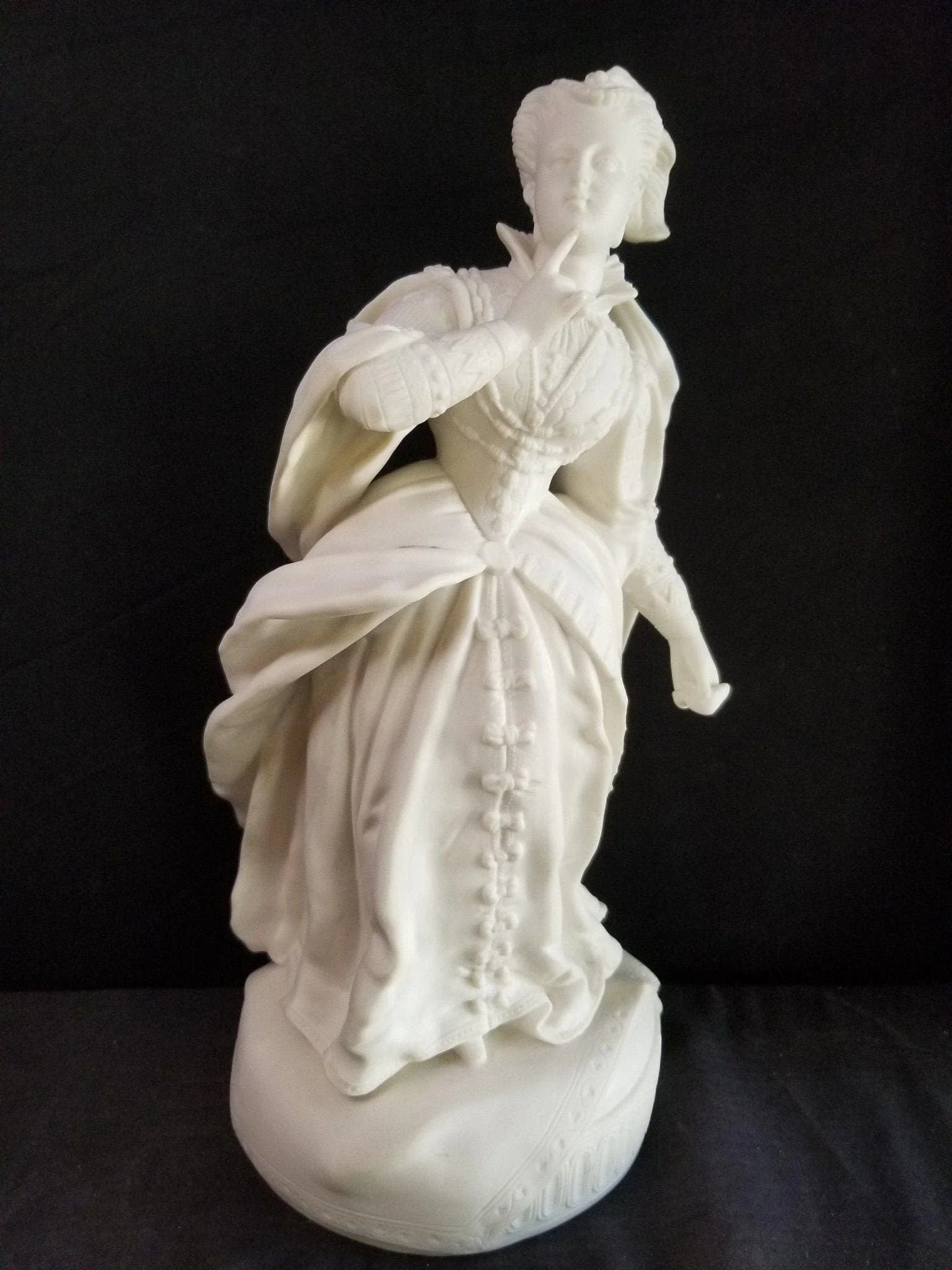 16 5/8" große antike Parian-Figurenskulptur, Frau in verziertem Kleid, 19. Jahrhundert, 8" breit an der Basis. Kleiner Chip am Innenrand des Sockels. Keine Risse, andere Chips oder Restaurierungen. Großes schweres Stück. Wiegt 9 Pfund. Mit „B&B“ gekennzeichnet, oben mit „H“ und unten mit „S“ in einer Raute.