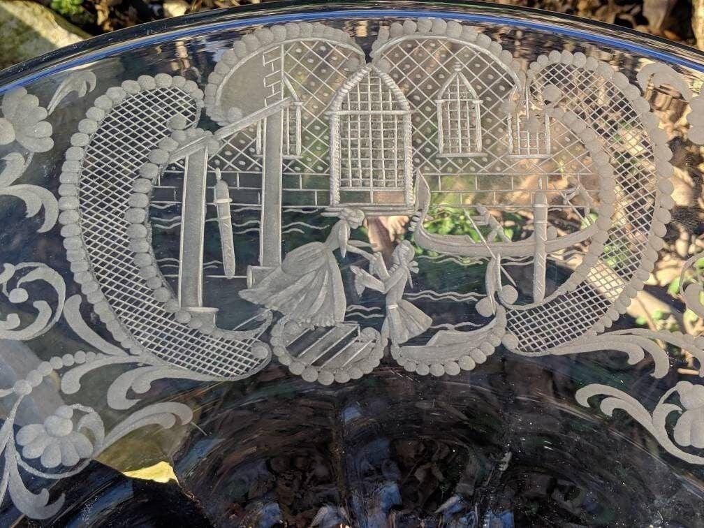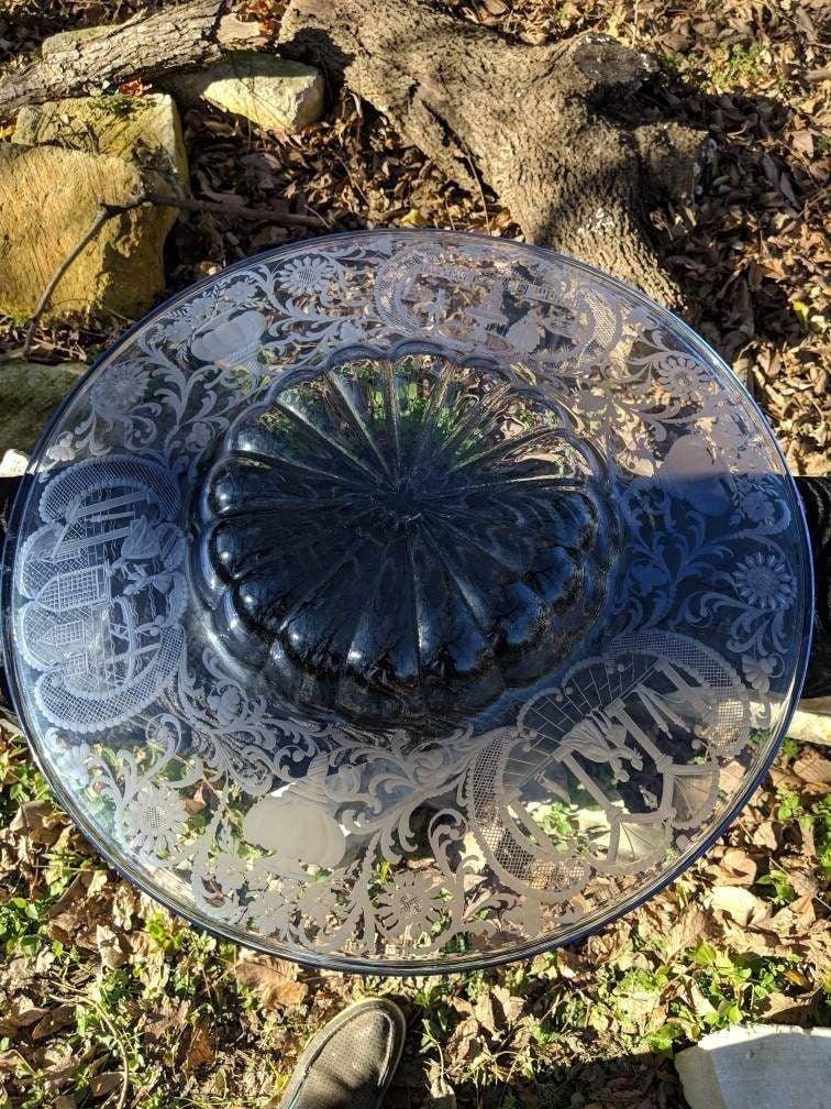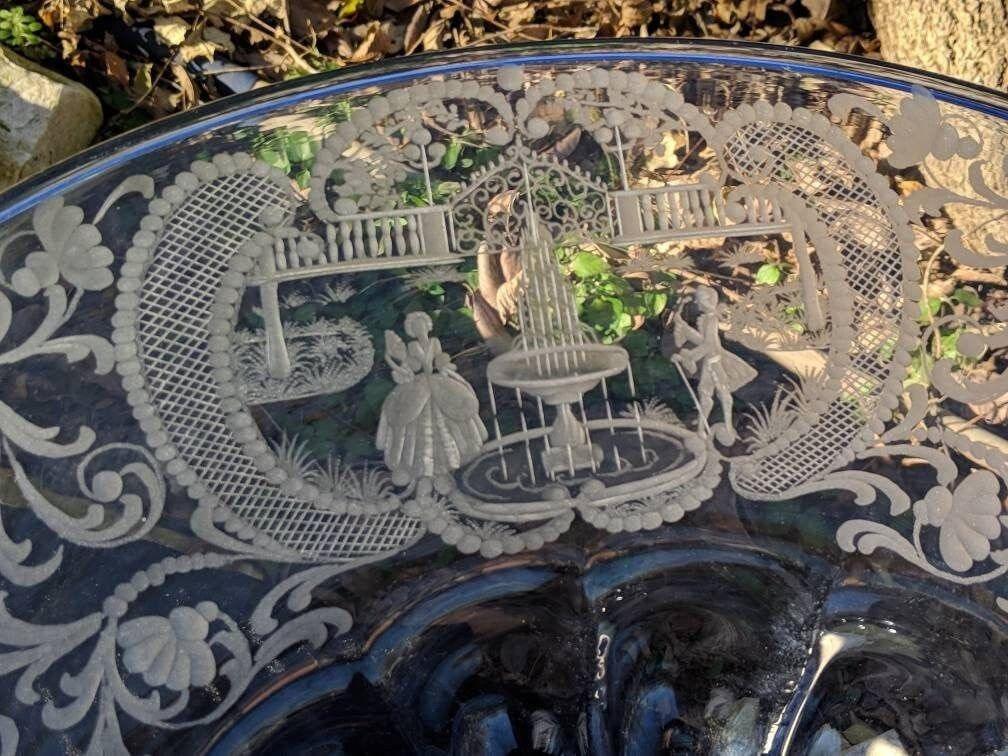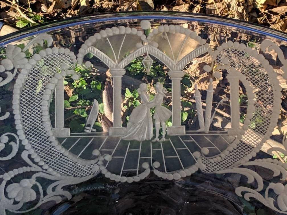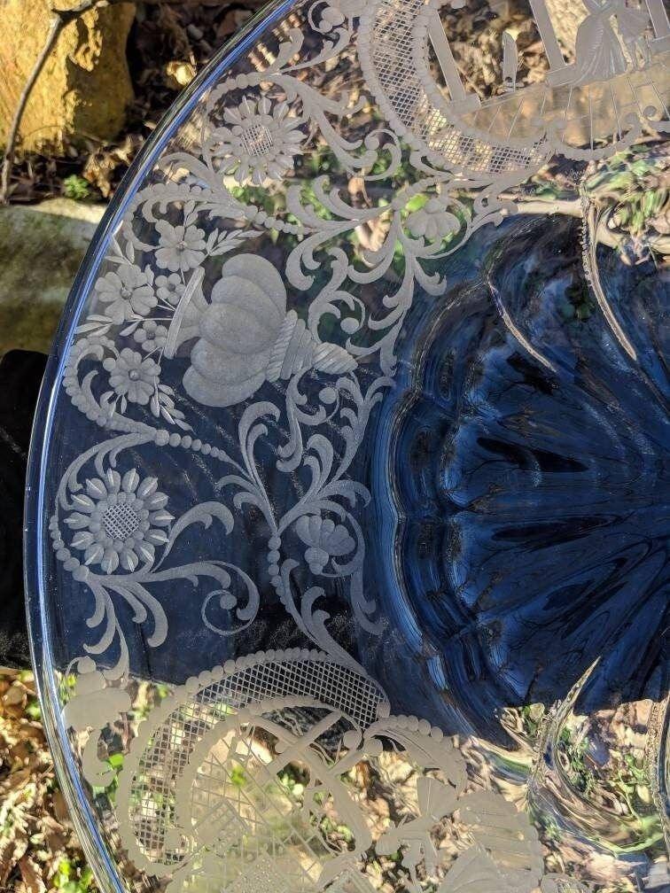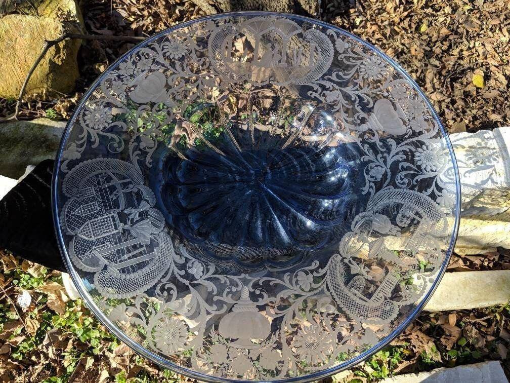 22" geätzter Tafelaufsatz aus venezianischem Glas, blau, vom Künstler signiert, 3" tief