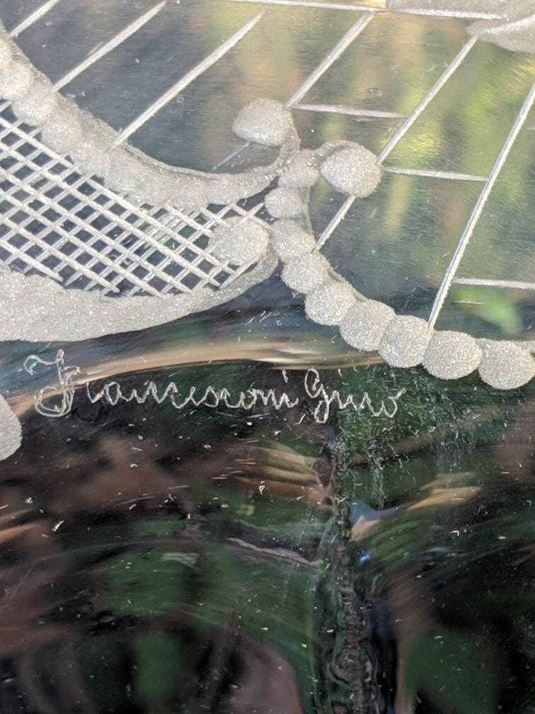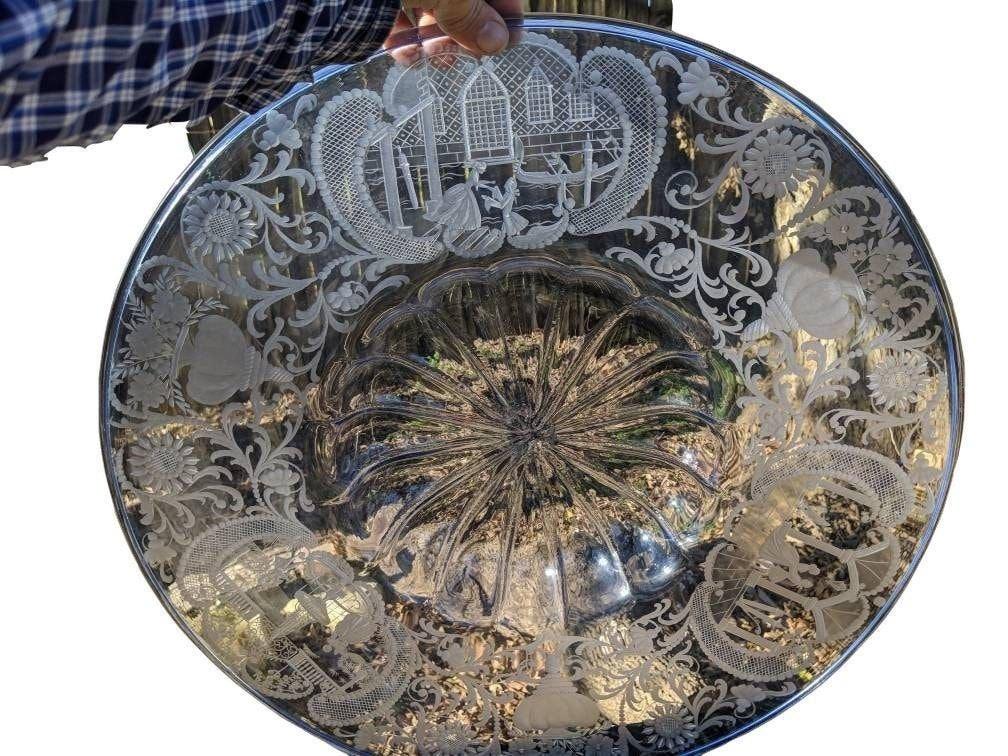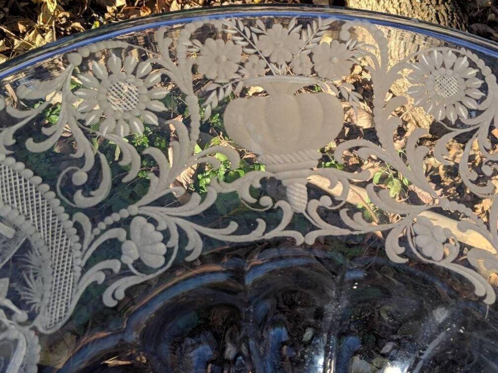 22" geätzter Tafelaufsatz aus venezianischem Glas, blau, vom Künstler signiert, 3" tief. Spricht für sich selbst. Zu groß für mich, um drinnen zu fotografieren. Keine Risse, Chips oder Kratzer.