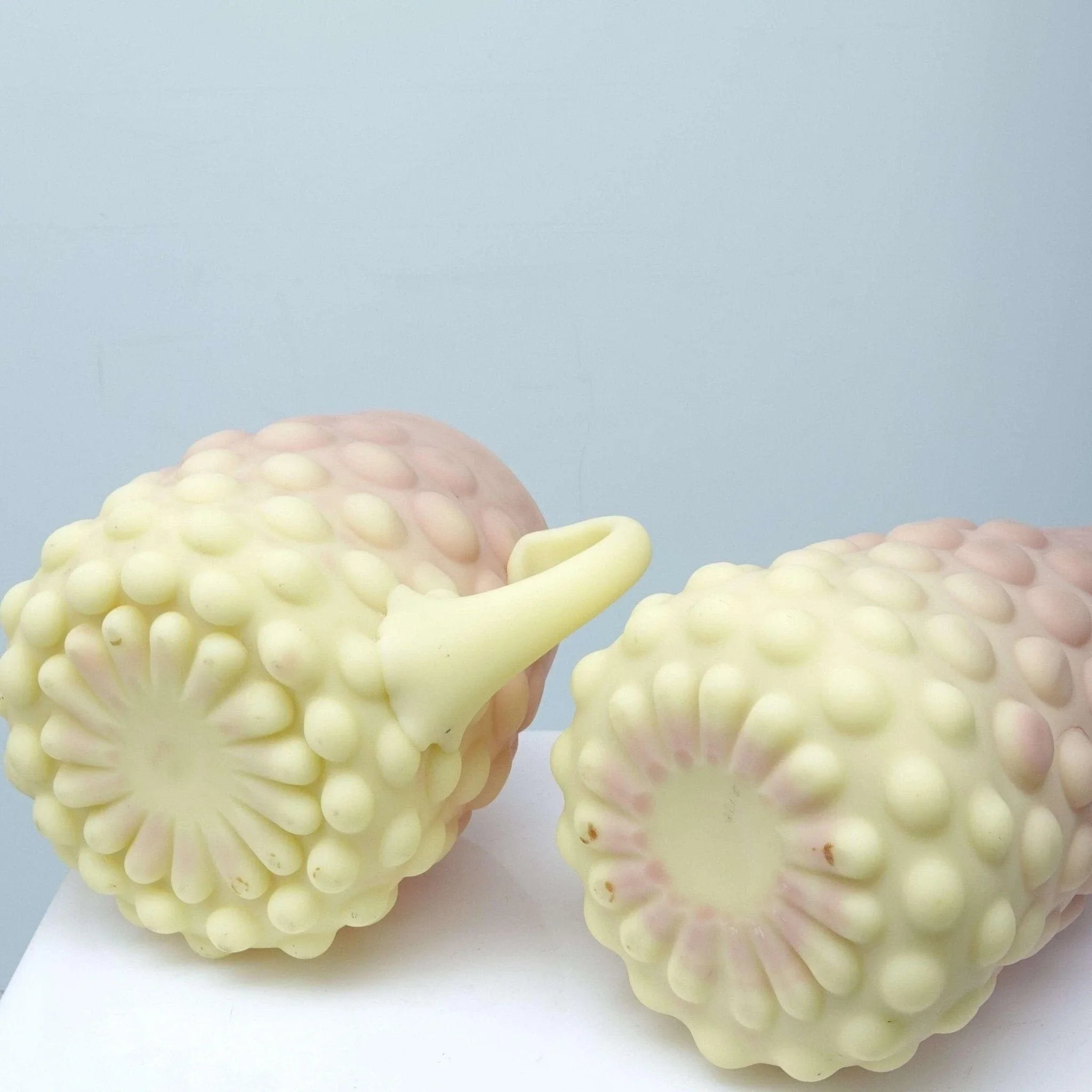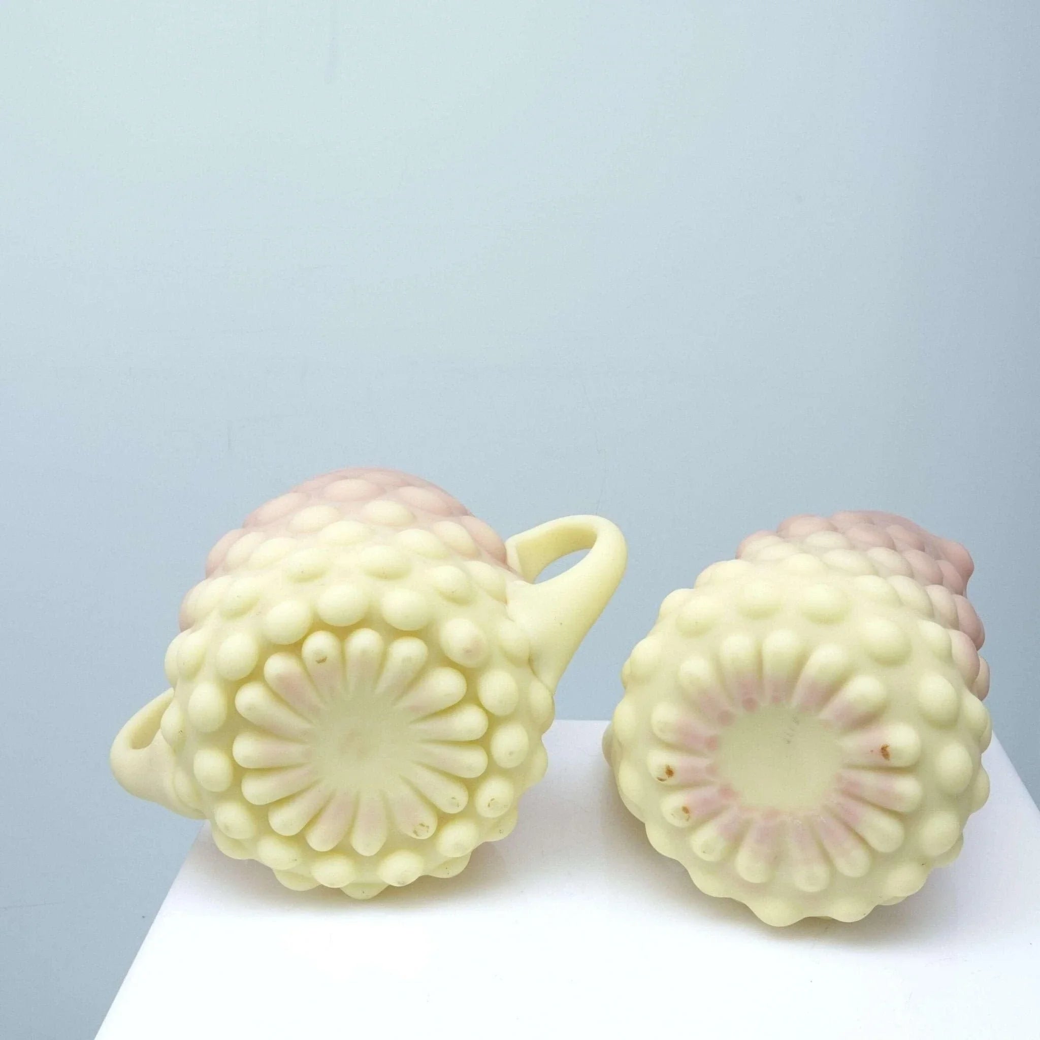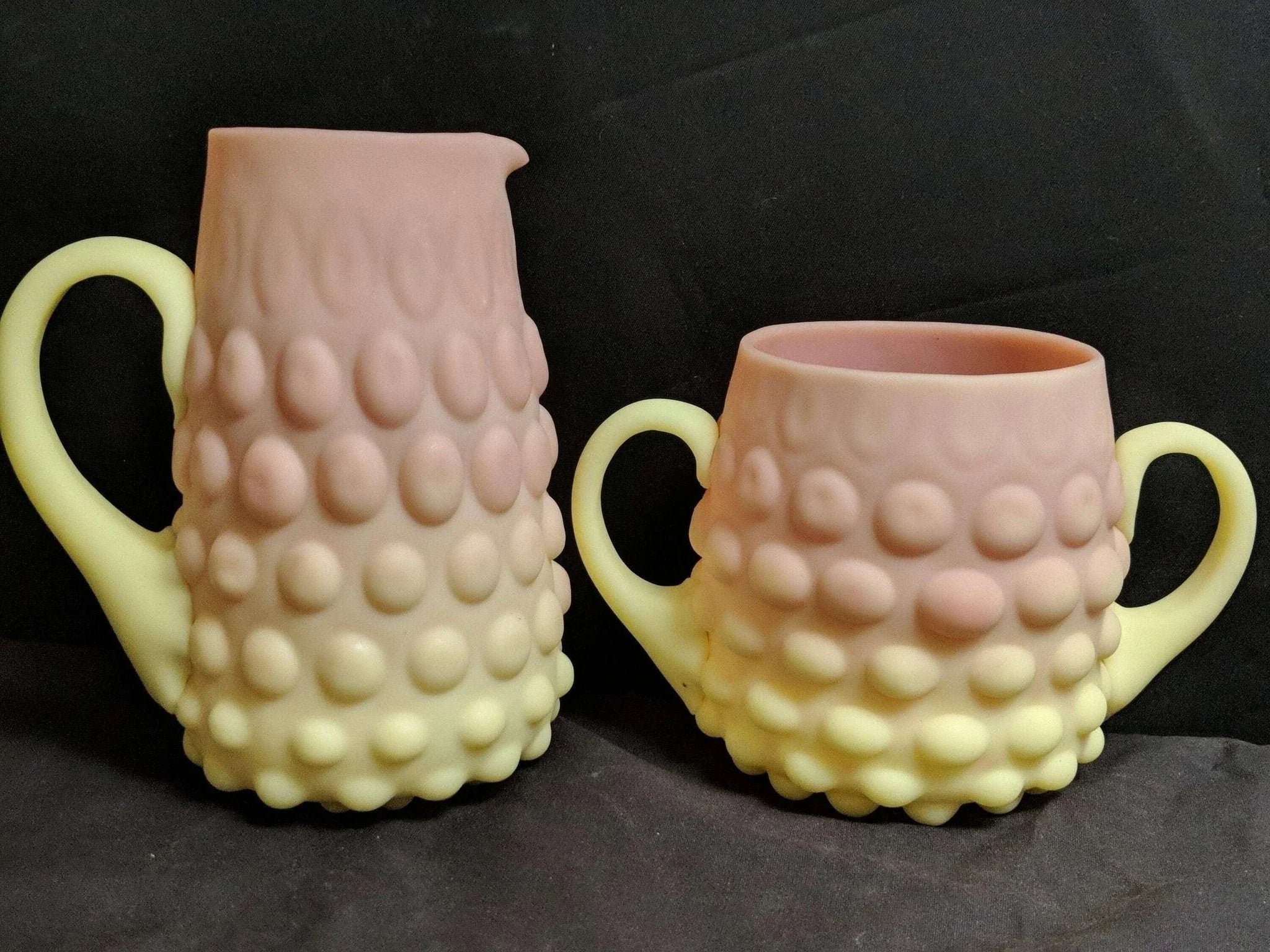 c1890 Mt Washington Burmese Hobnail Creamer and Sugar Selten und authentisch, garantiert etwa Ende des 19. Jahrhunderts. Verkaufe beides zum gleichen Preis. Der Milchkännchen ist 5,75" hoch x 5" breit mit Griff. Der Zucker ist 10,2 cm hoch und 15,8 cm lang. Ein paar kleinere produktionsbedingte Mängel, keine Risse, Chips oder Restaurierungen. Beide mit gemahlenen Pontils, Milchkännchen mit der Markierung Nr. 130, sie leuchten unter Schwarzlicht.