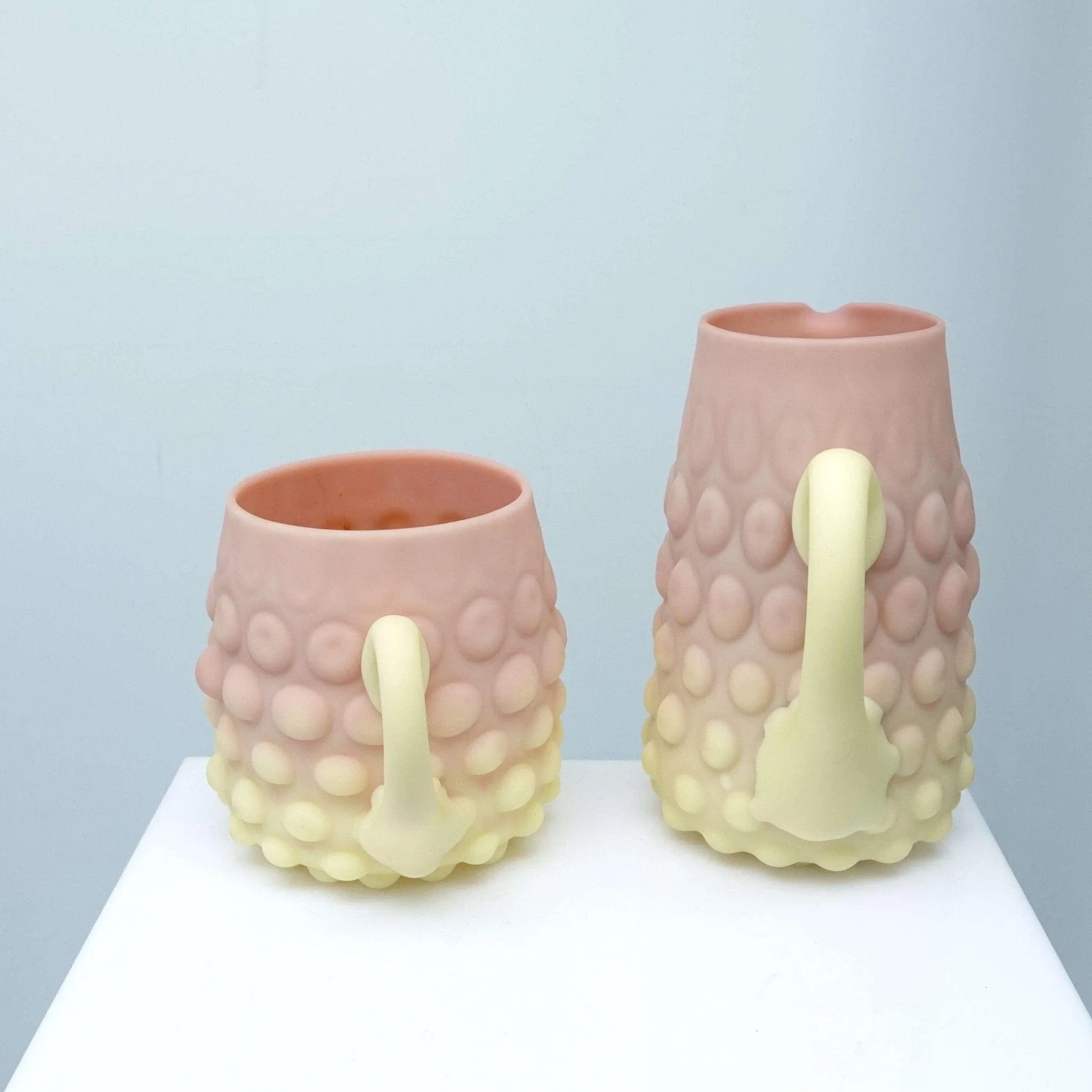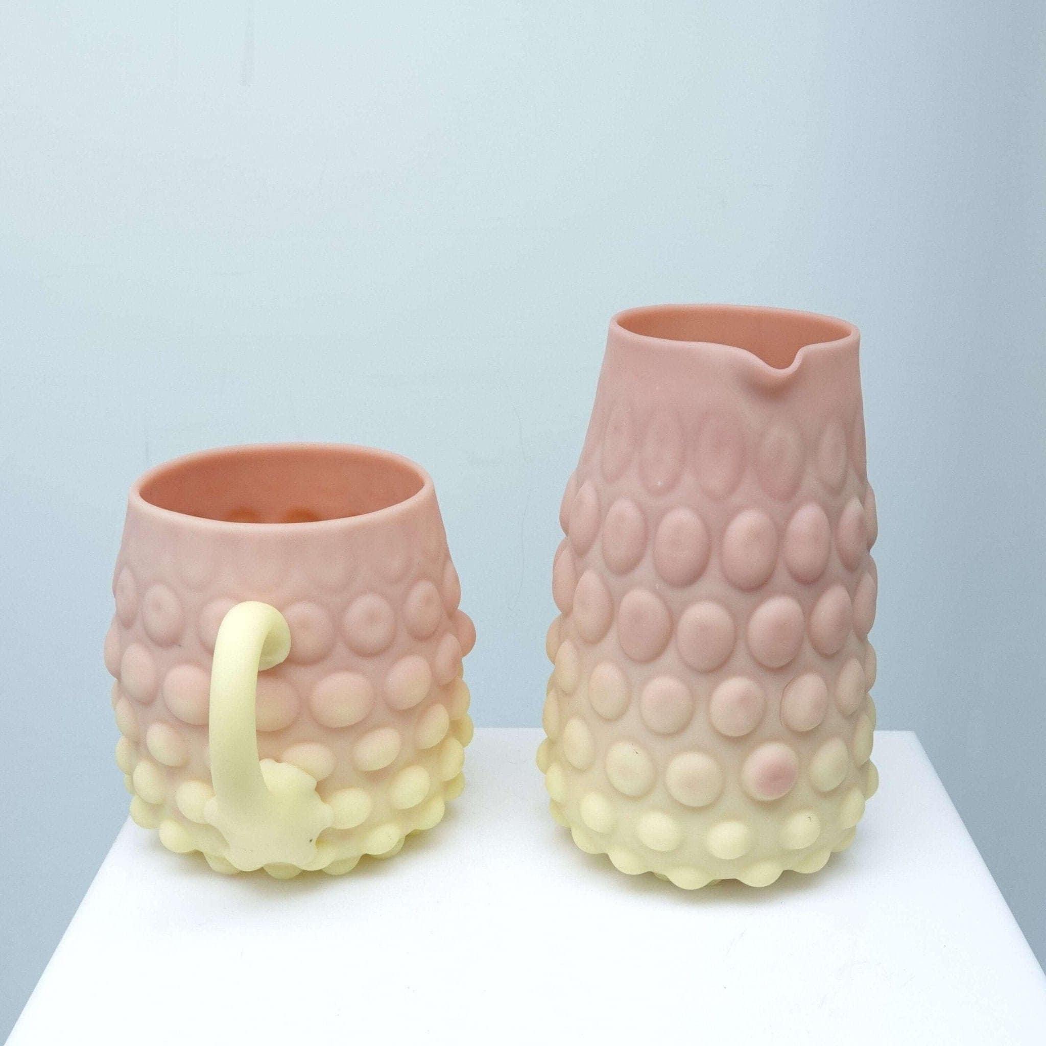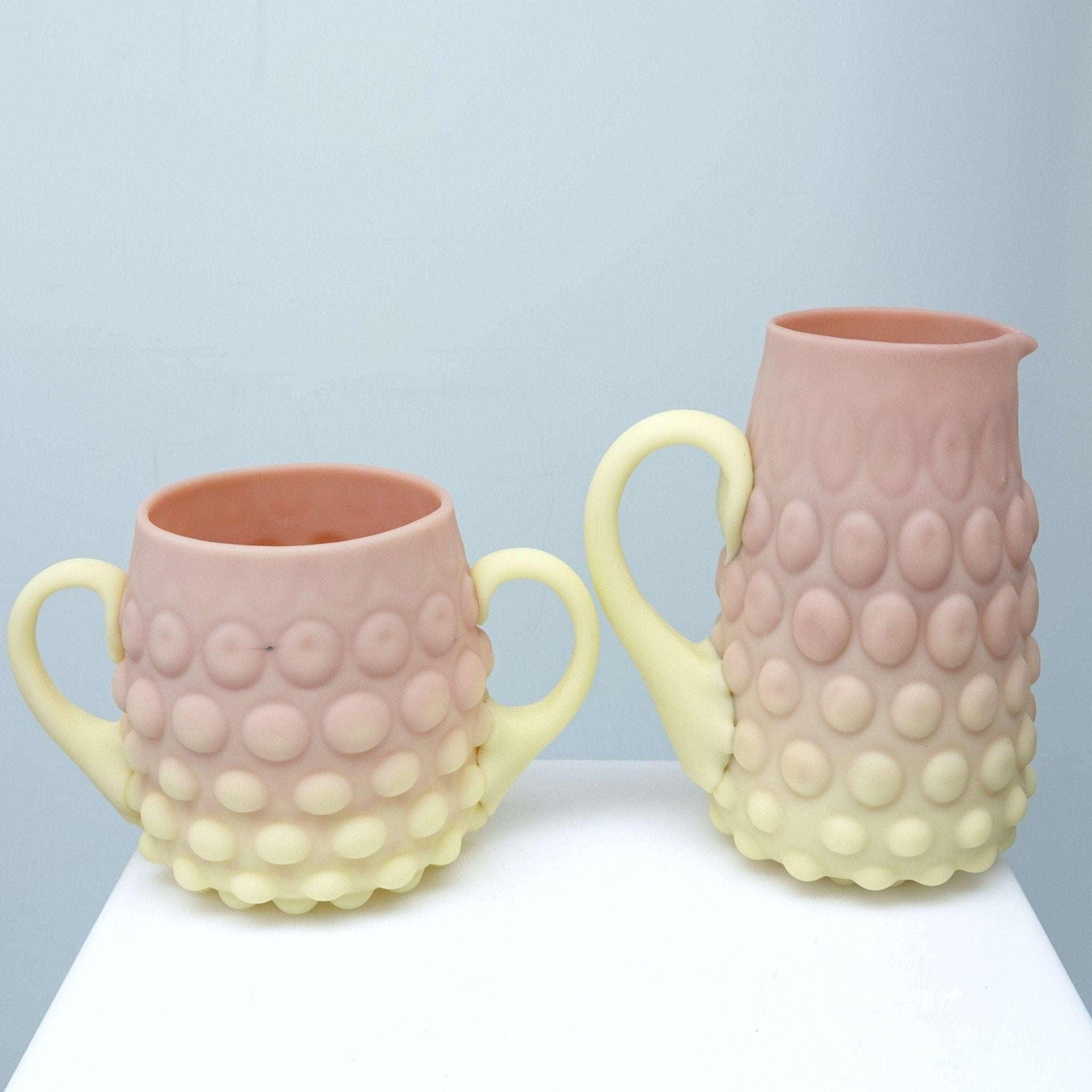 c1890 Mt Washington Burmese Hobnail Creamer and Sugar Selten und authentisch, garantiert etwa Ende des 19. Jahrhunderts. Verkaufe beides zum gleichen Preis. Der Milchkännchen ist 5,75" hoch x 5" breit mit Griff. Der Zucker ist 10,2 cm hoch und 15,8 cm lang. Ein paar kleinere produktionsbedingte Mängel, keine Risse, Chips oder Restaurierungen. Beide mit gemahlenen Pontils, Milchkännchen mit der Markierung Nr. 130, sie leuchten unter Schwarzlicht.