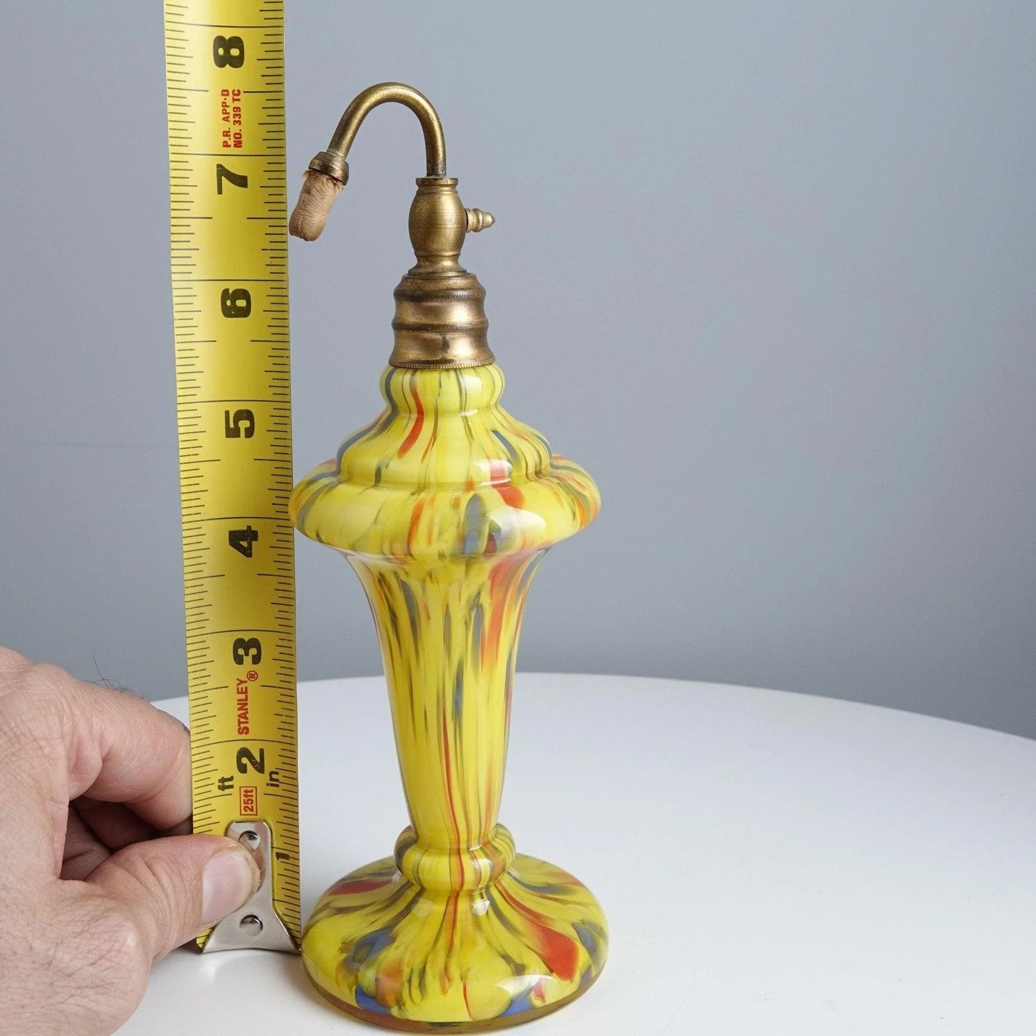 Tschechoslowakische Kunstglas-Zerstäuber-Parfümflasche aus den 1920er Jahren. Keine Schäden am Glas, es fehlt ein Zerstäuber, der ersetzt werden kann. Ich konnte keine Marke finden, aber es ist ein tschechisches Modell aus den 1920er- und 1930er-Jahren.
