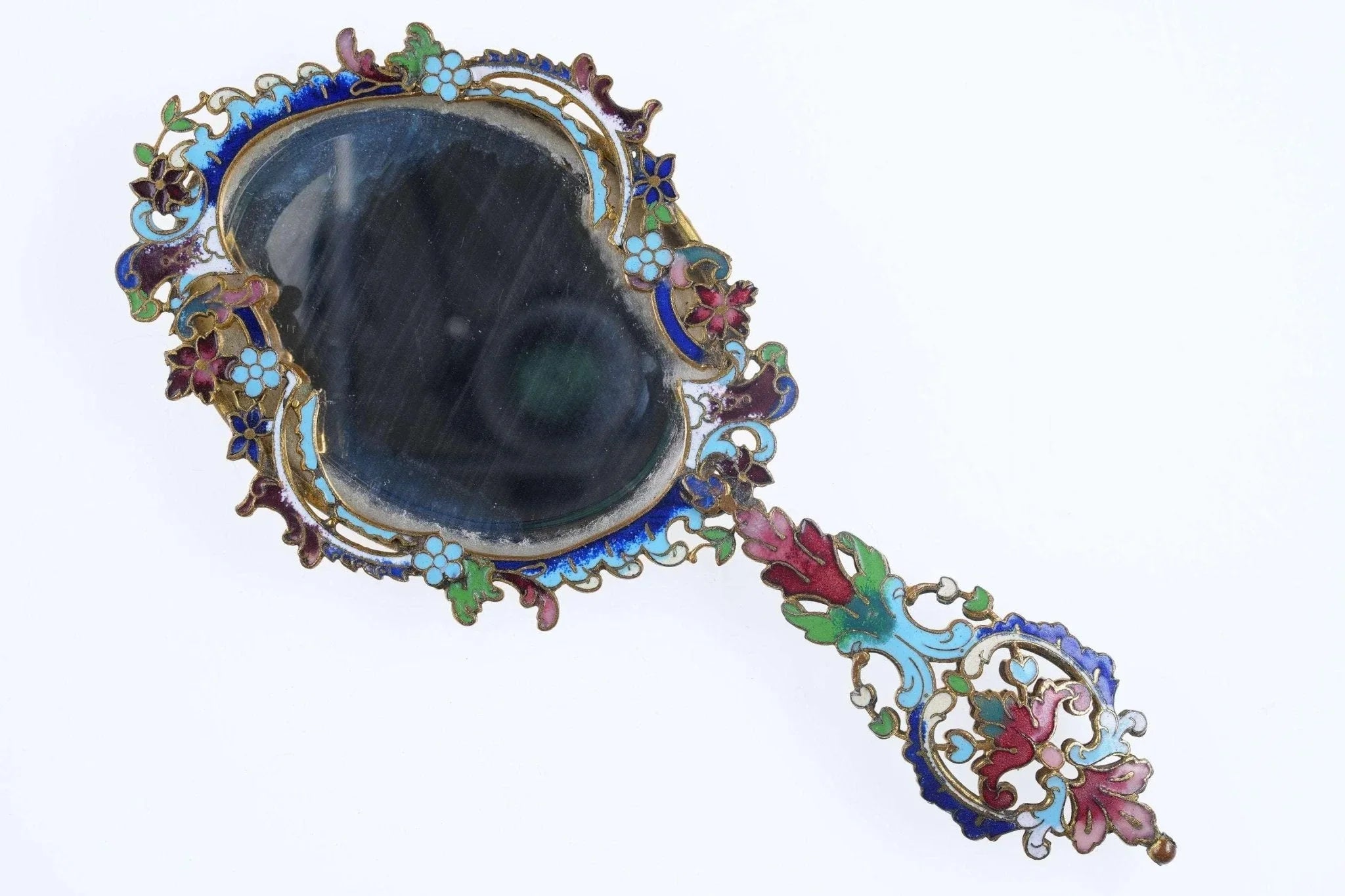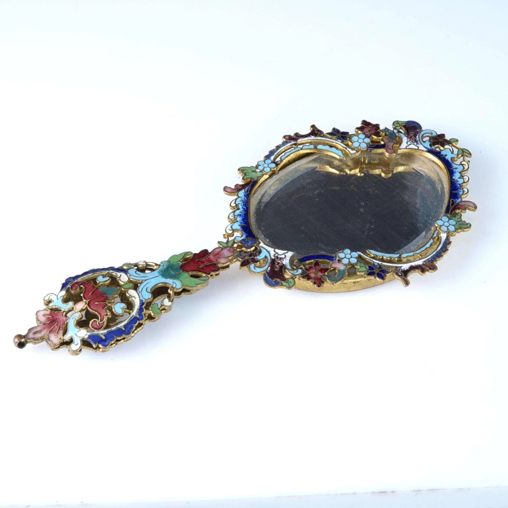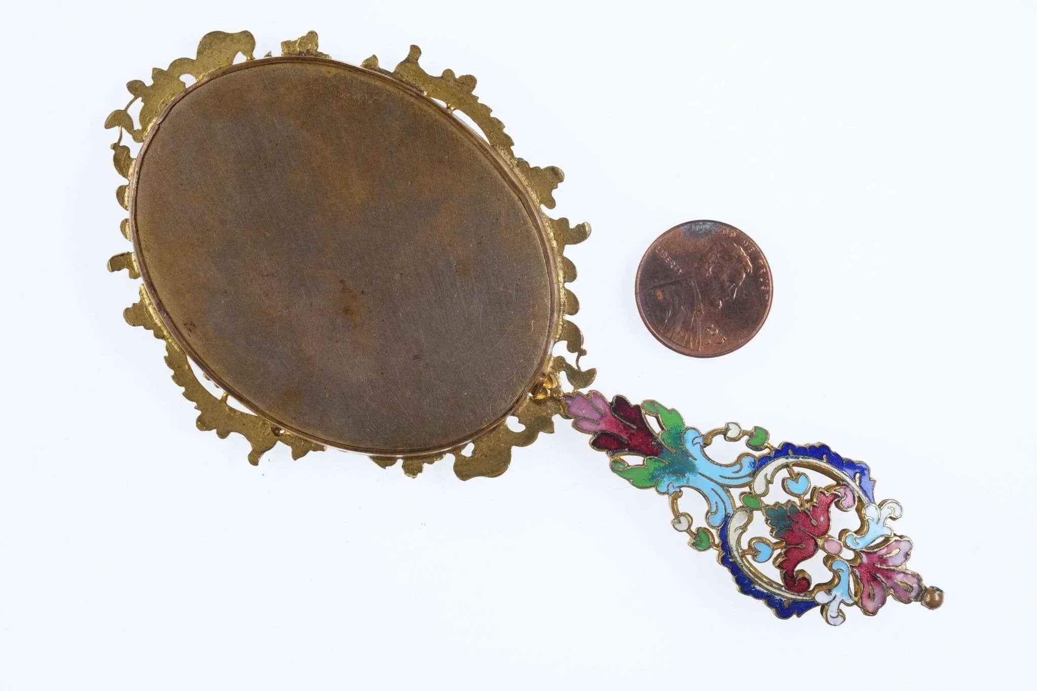 Um 1900 französischer Champleve-Diminutivspiegel für Anhänger oder Kind. Ende des 19. bis Anfang des 20. Jahrhunderts, tolles Stück. Hat eine Kugel am Ende, die man an einer Halskette tragen kann. Es ist sehr klein, 5 3/16" lang x 2 3/8" breit. Perfekter Zustand mit gutem originalen abgeschrägten Spiegel und ohne Verlust.