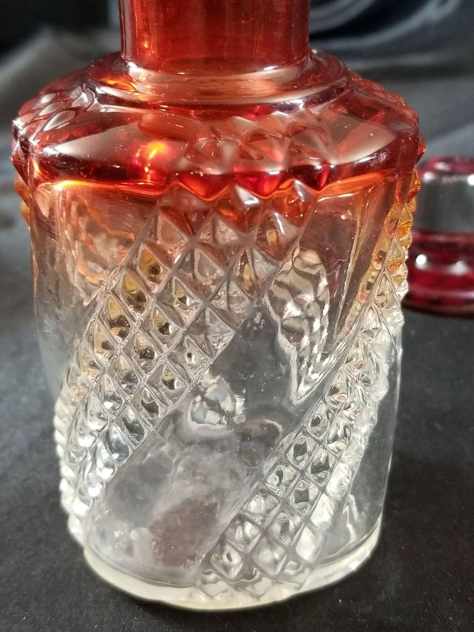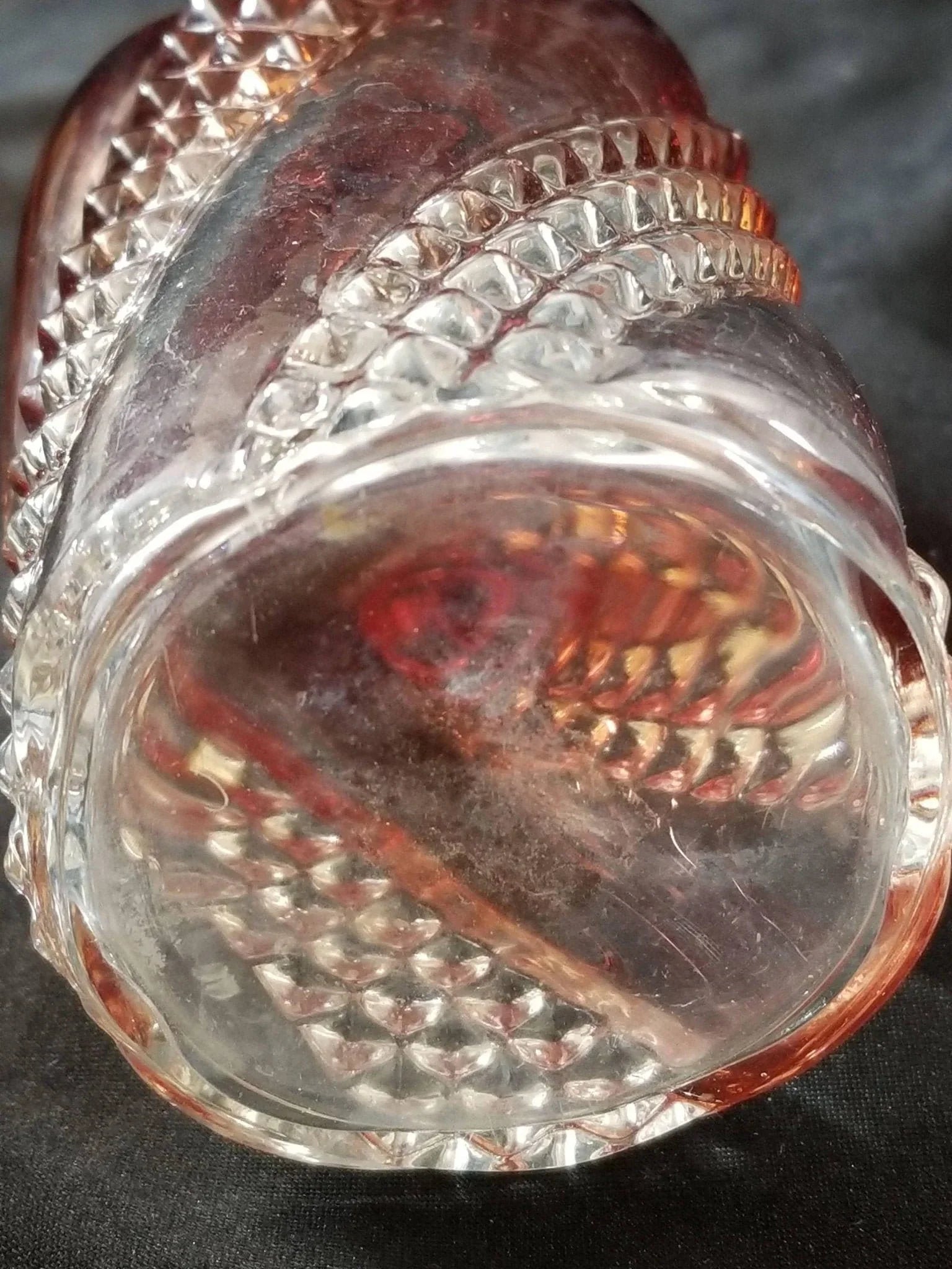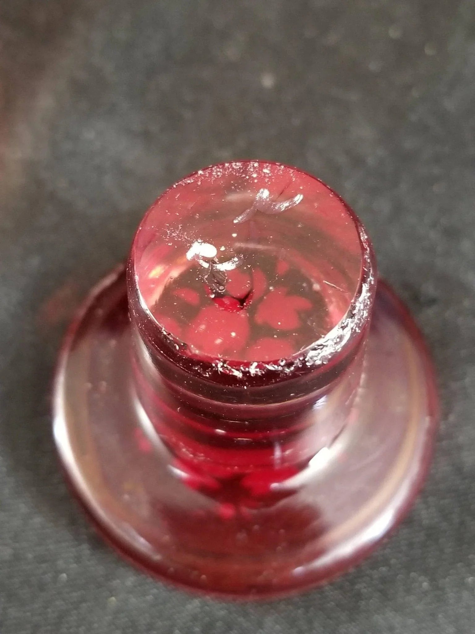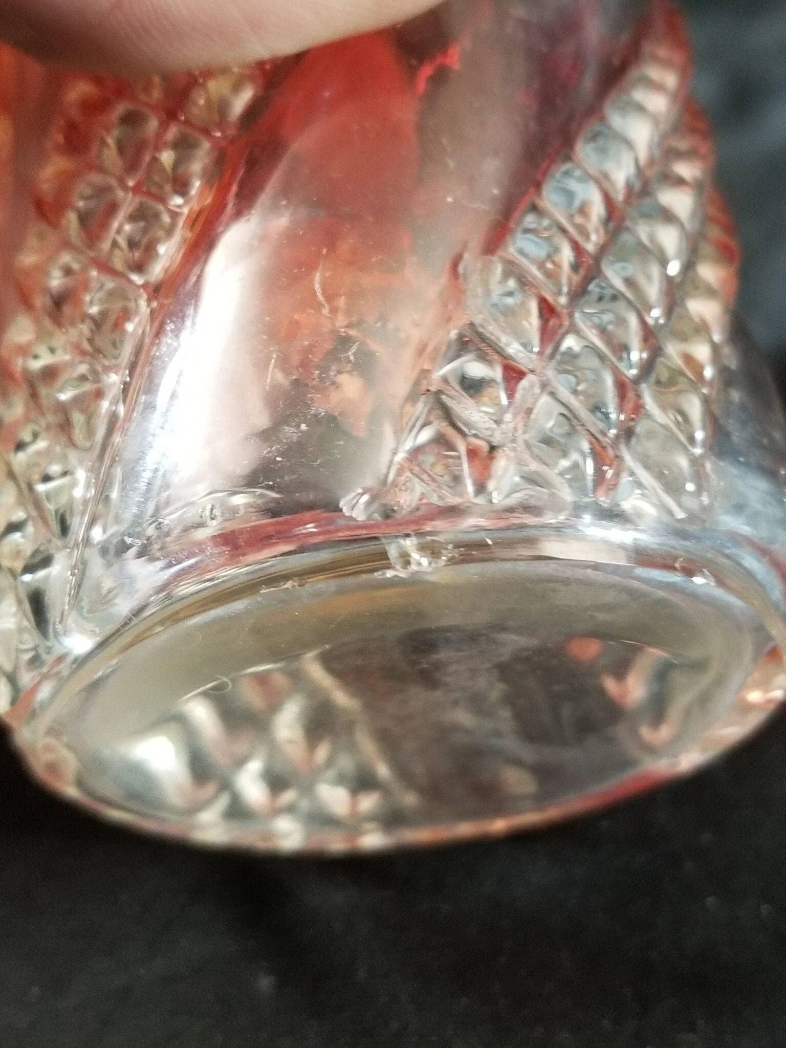 5,25" hoch. Schöne große Duftflasche ohne Markierungen, die ich finden konnte. Garantiert Baccarat aus der Jahrhundertwende. Leichte Trübung und winzige Kerben am Boden, wie im letzten Bild zu sehen. Ungewöhnlich mit diesem Deckel. Deckel passt wie angegossen, beides dampf- und flüssigkeitsdicht.