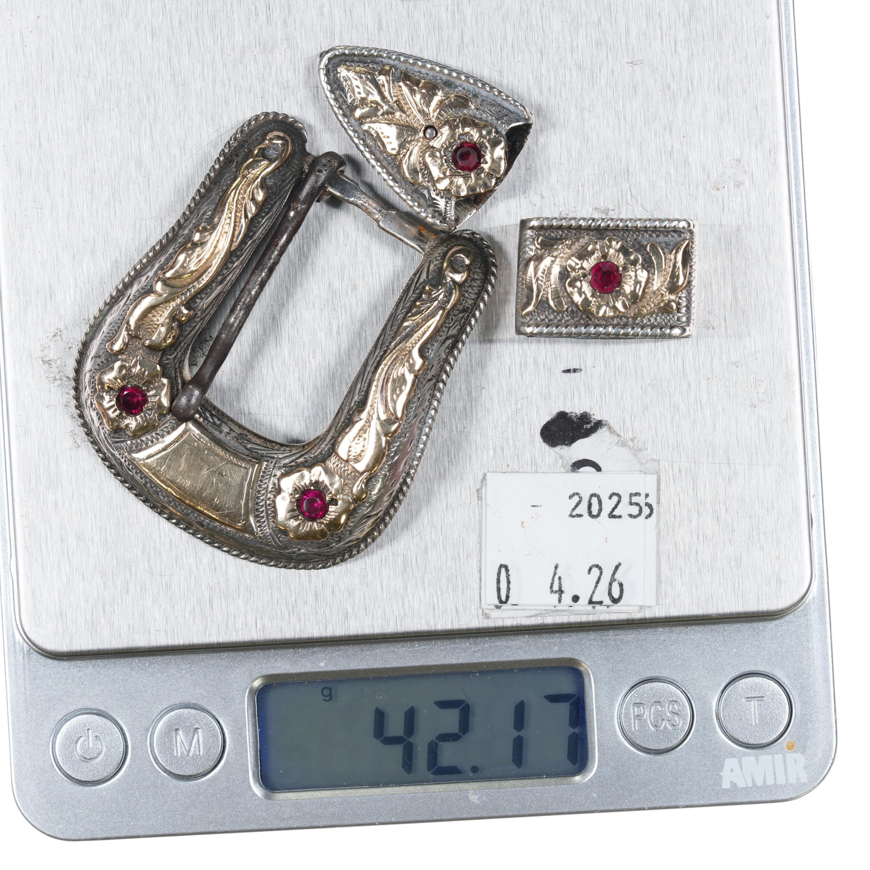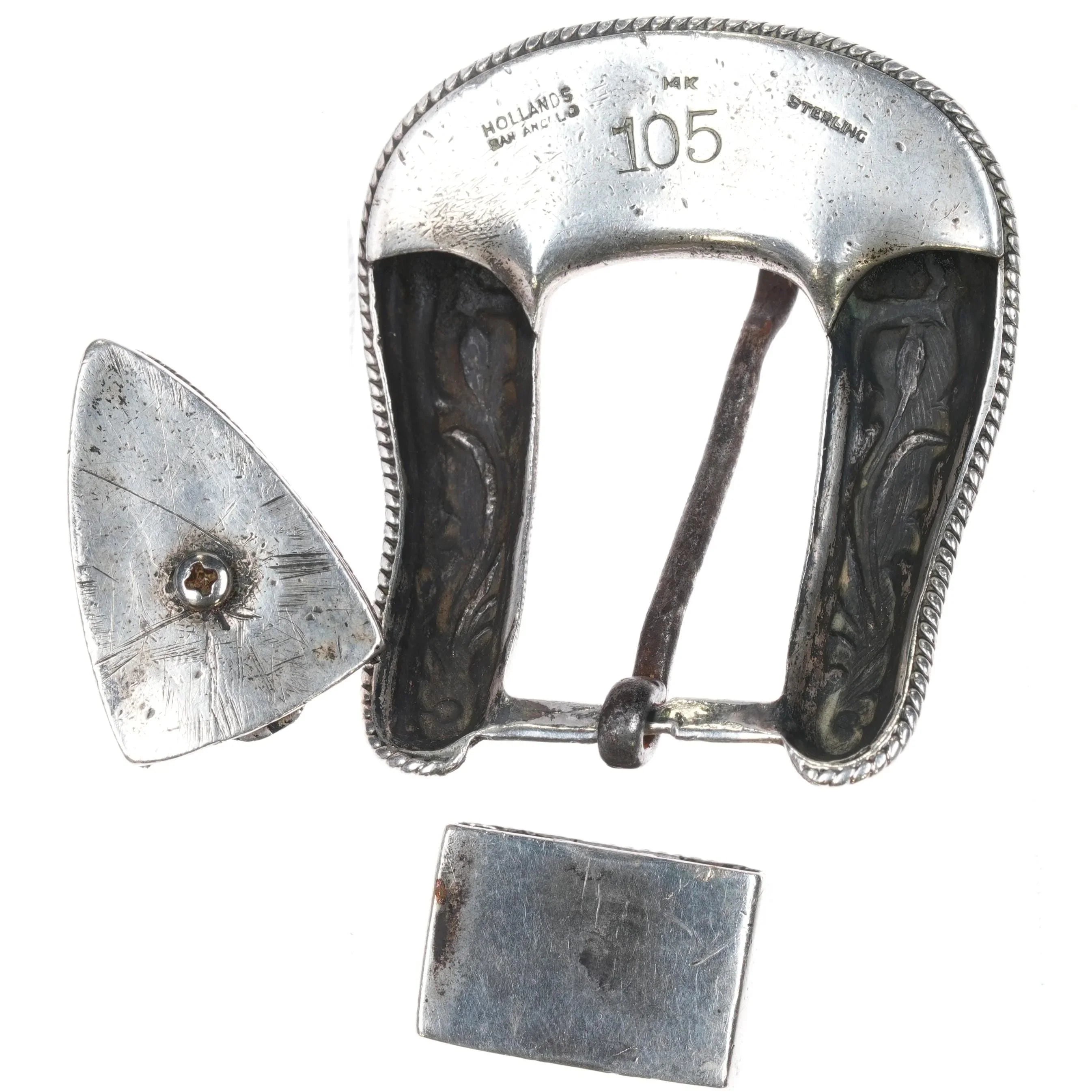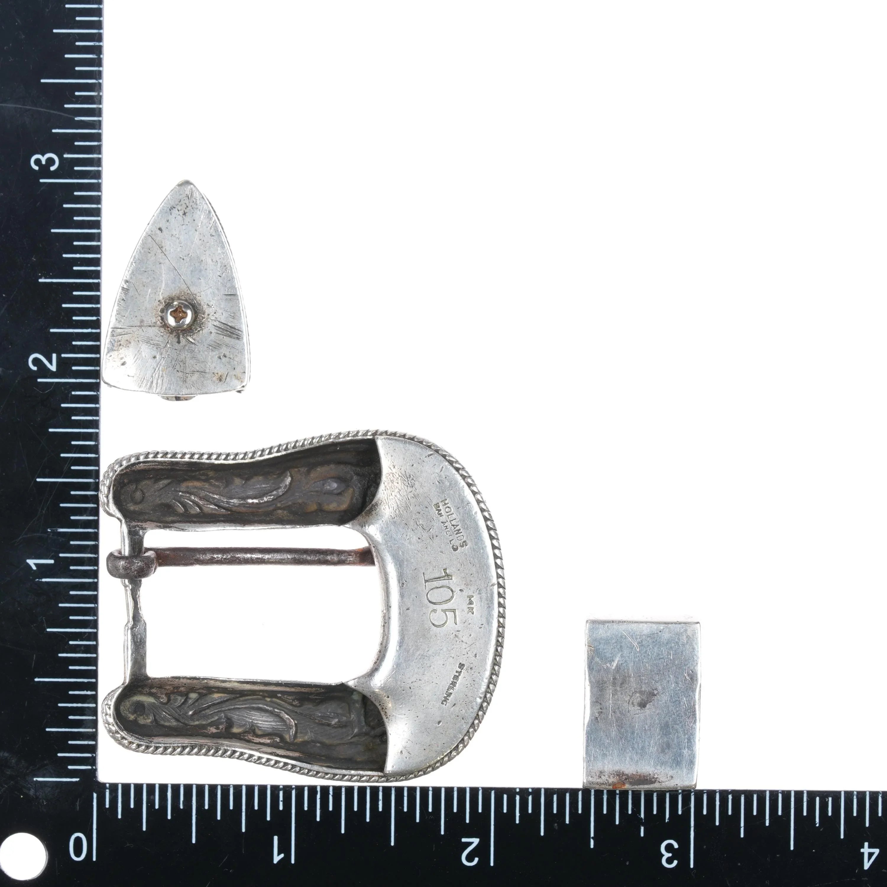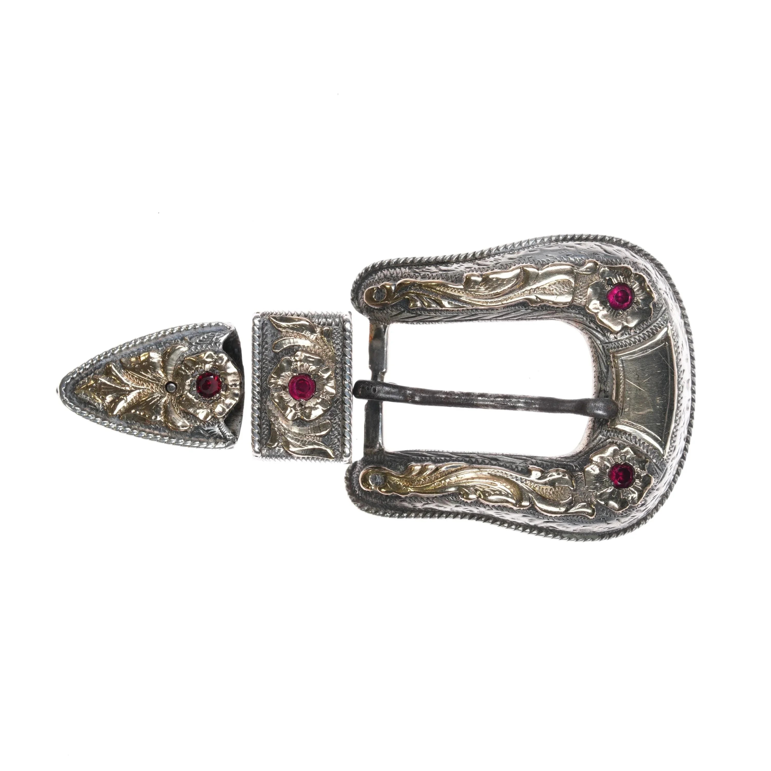 Hollands San Angelo #105 14k gold sterling silver rubies ranger belt buckle set. Solid 14k gold accents on hand engraved sterling silver with factory rubies. Vintage set with some expected wear but no significant issues. Fits up to 3/4" belt.