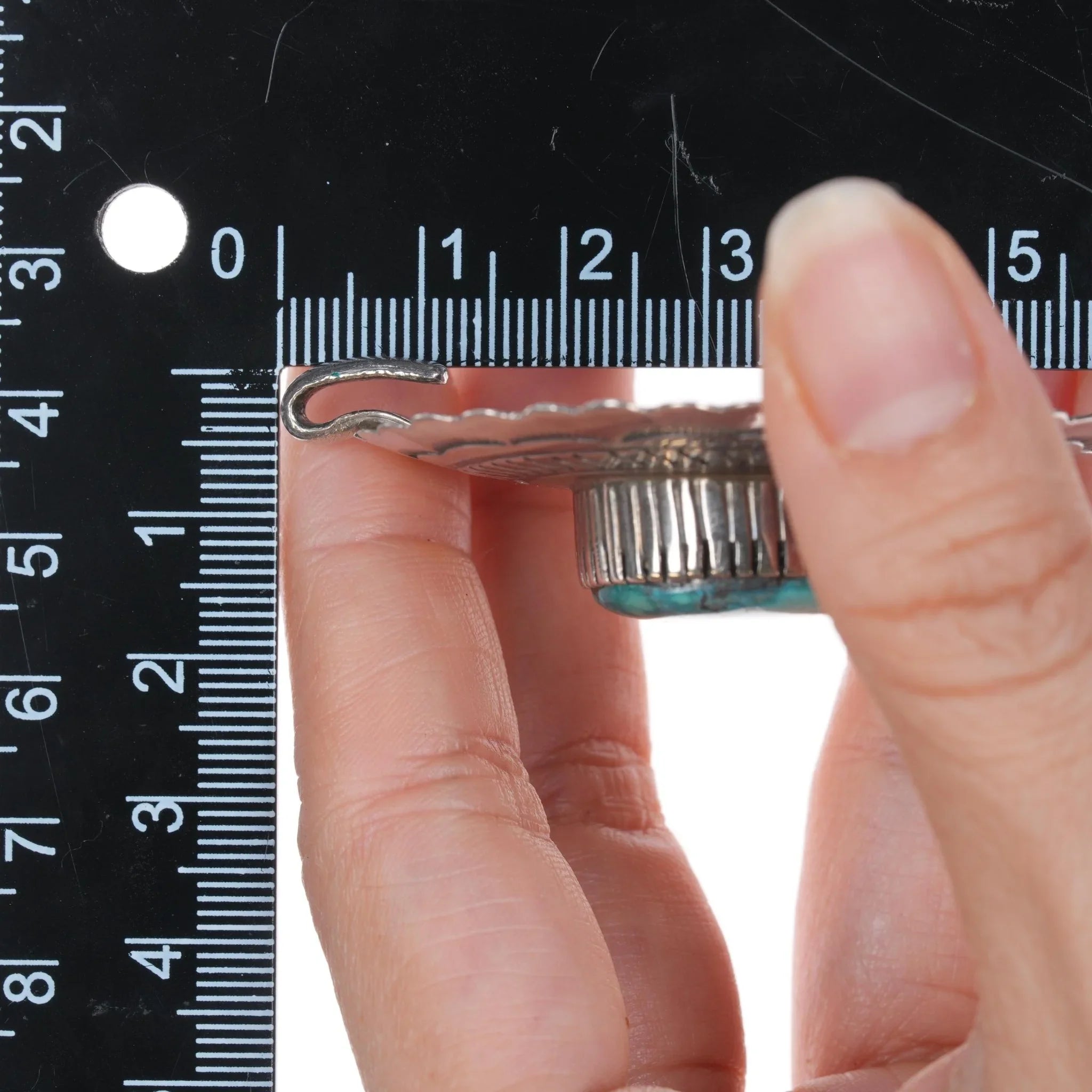 Jim Calladitto Navajo Sterling high grade turquoise pendant. No issues, weight and measurements in pics. Has a hook on top to hang on a beaded necklace, and a loop at the bottom to dangle something from it. May have been a buckle in a previous life.