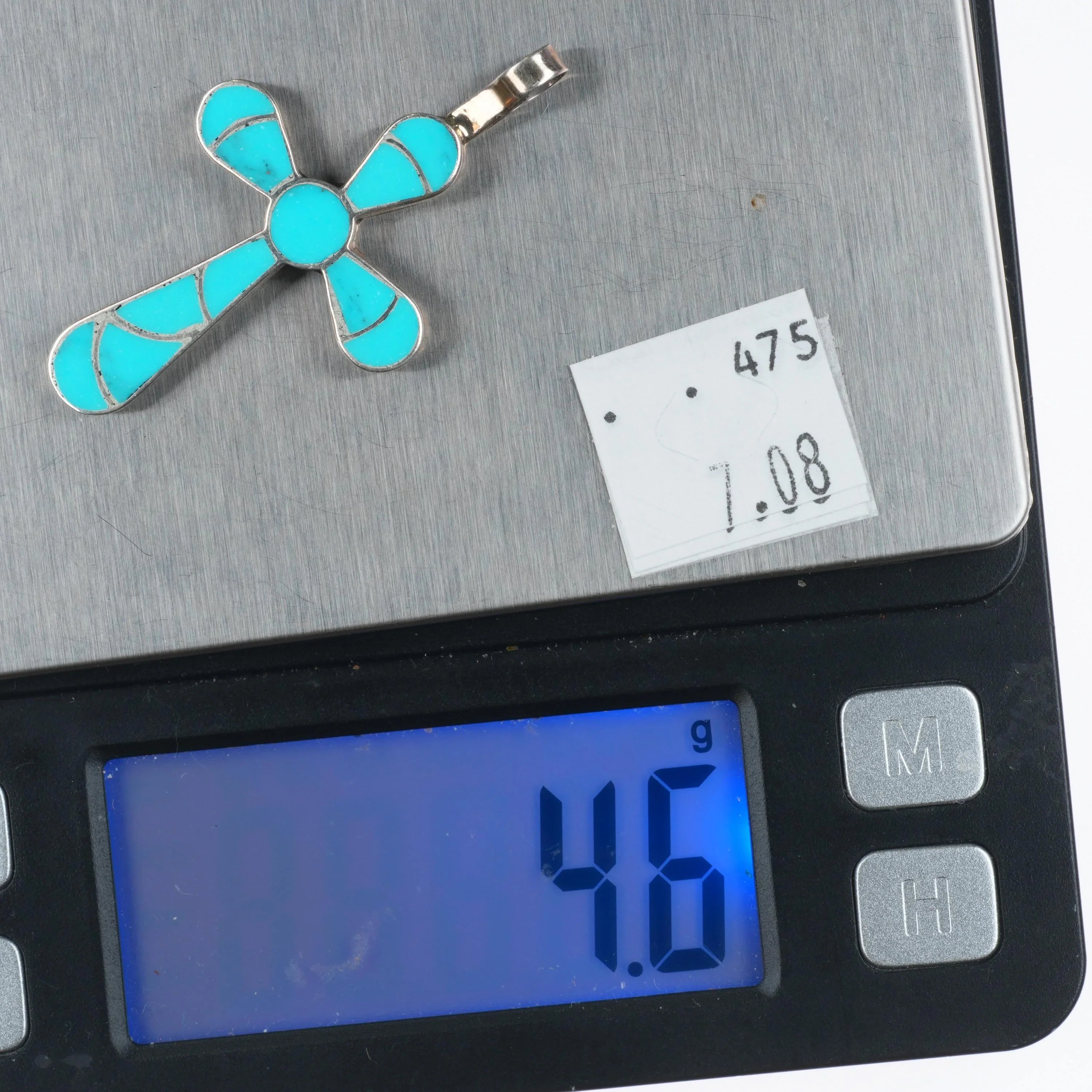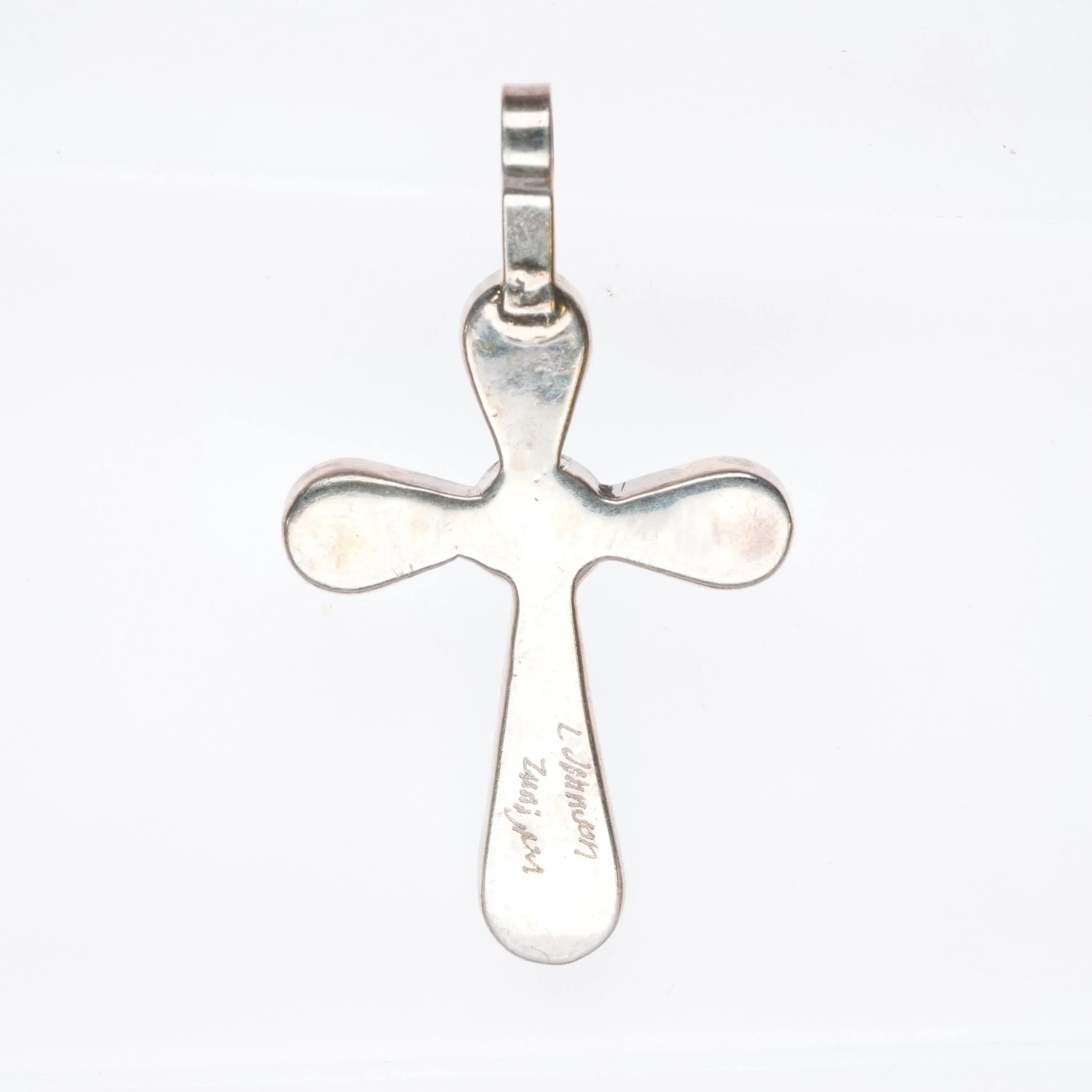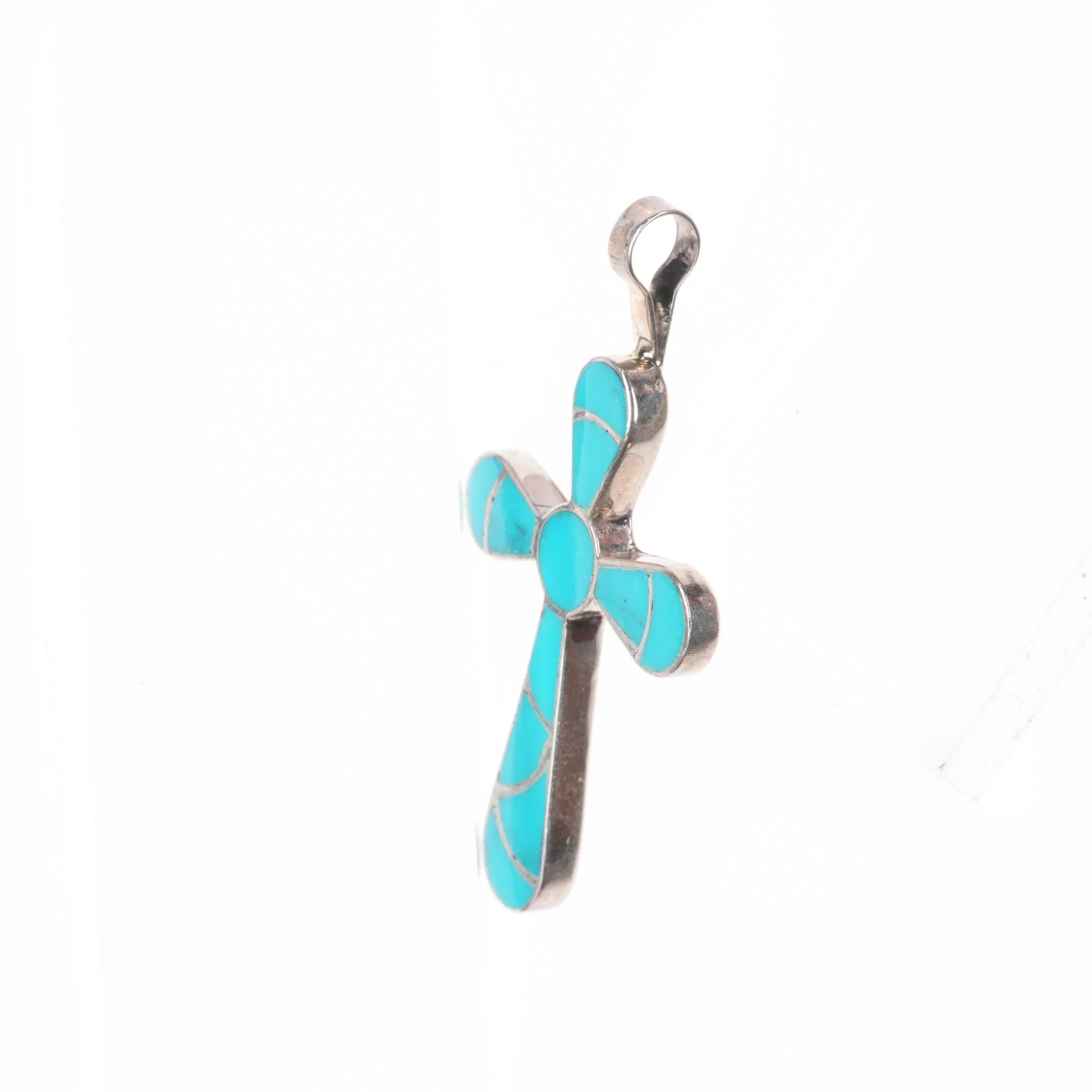 Johnson Zuni sterling silver channel inlay turquoise cross pendant. Solid sterling silver tested and guaranteed with the markings shown, weight and measurements in the pictures. No issues, circa last quarter of the 20th century or newer..