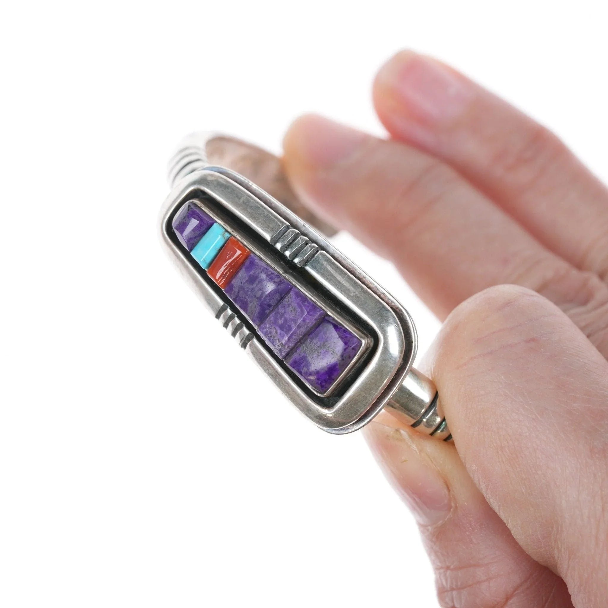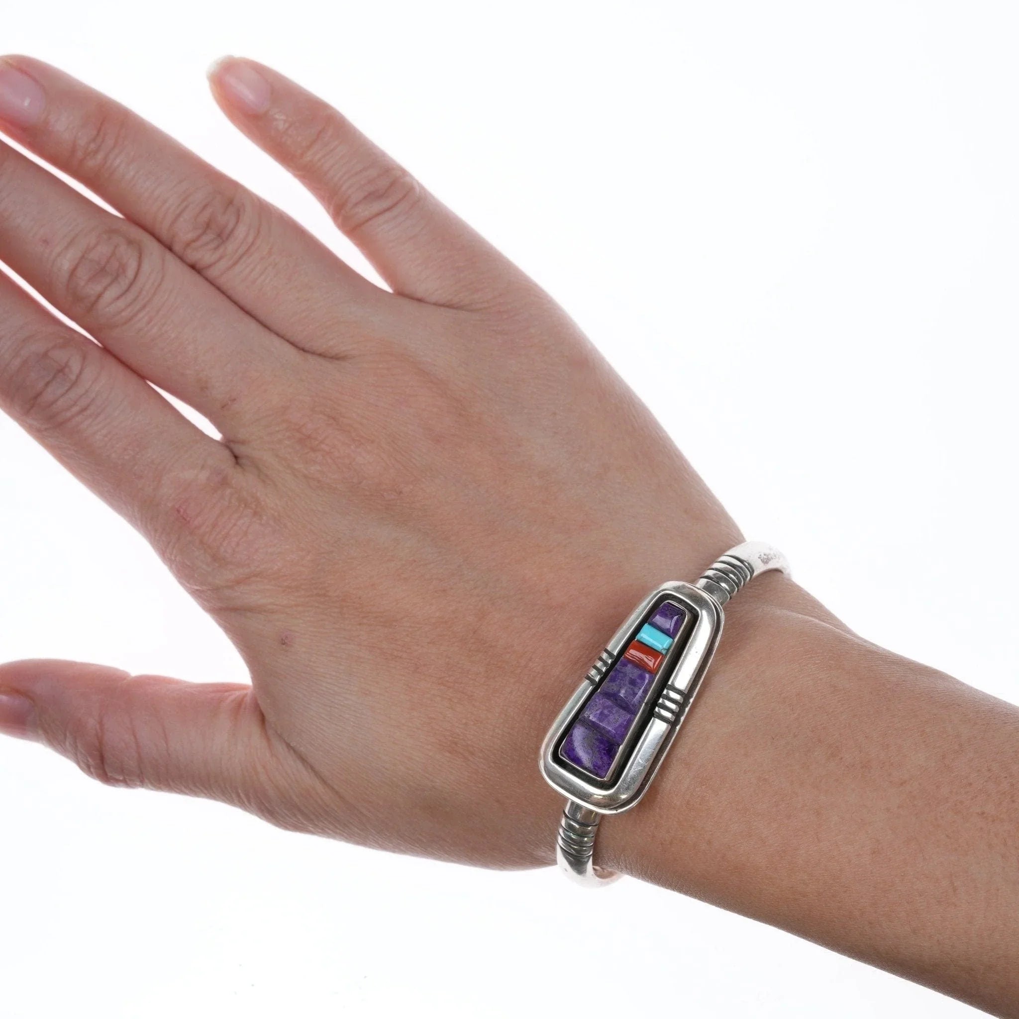 6 1/8" Leroy Begay Navajo Sterling Multi-Cobblestone-Armband, 20 mm breit an der breitesten Stelle, 39,4 Gramm. Charoit, Türkis und Koralle.