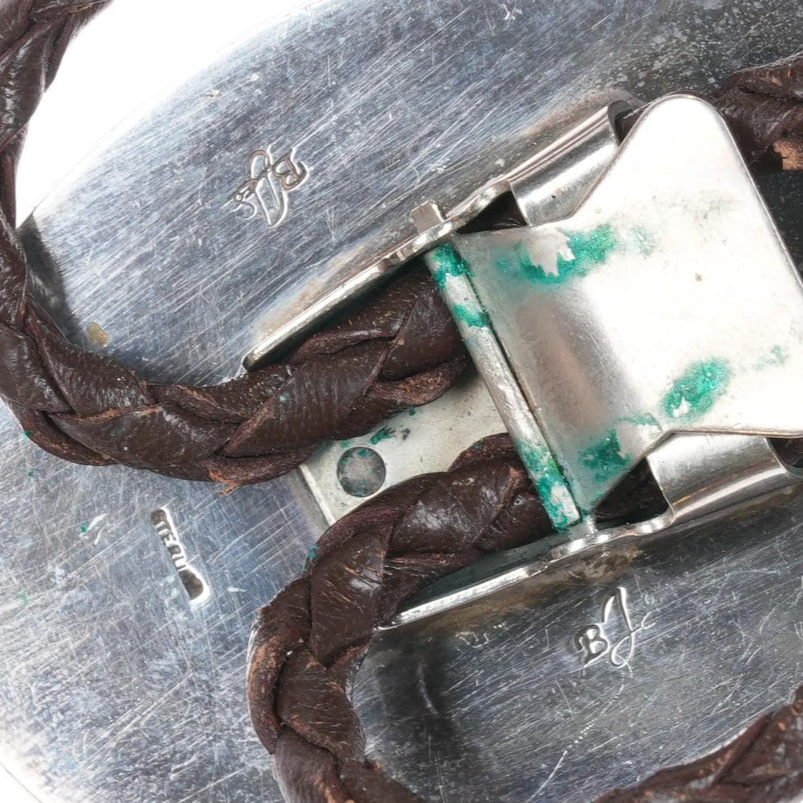Large 1970‘s BJS Sterling silver and jasper southwestern bolo tie. Solid sterling silver slide and tips. Weight and measurements in pics. 39" long. Expected wear with no apparent damage. Weight shown is just the entire bolo, if there is a tray pictured it will be tared out of course.