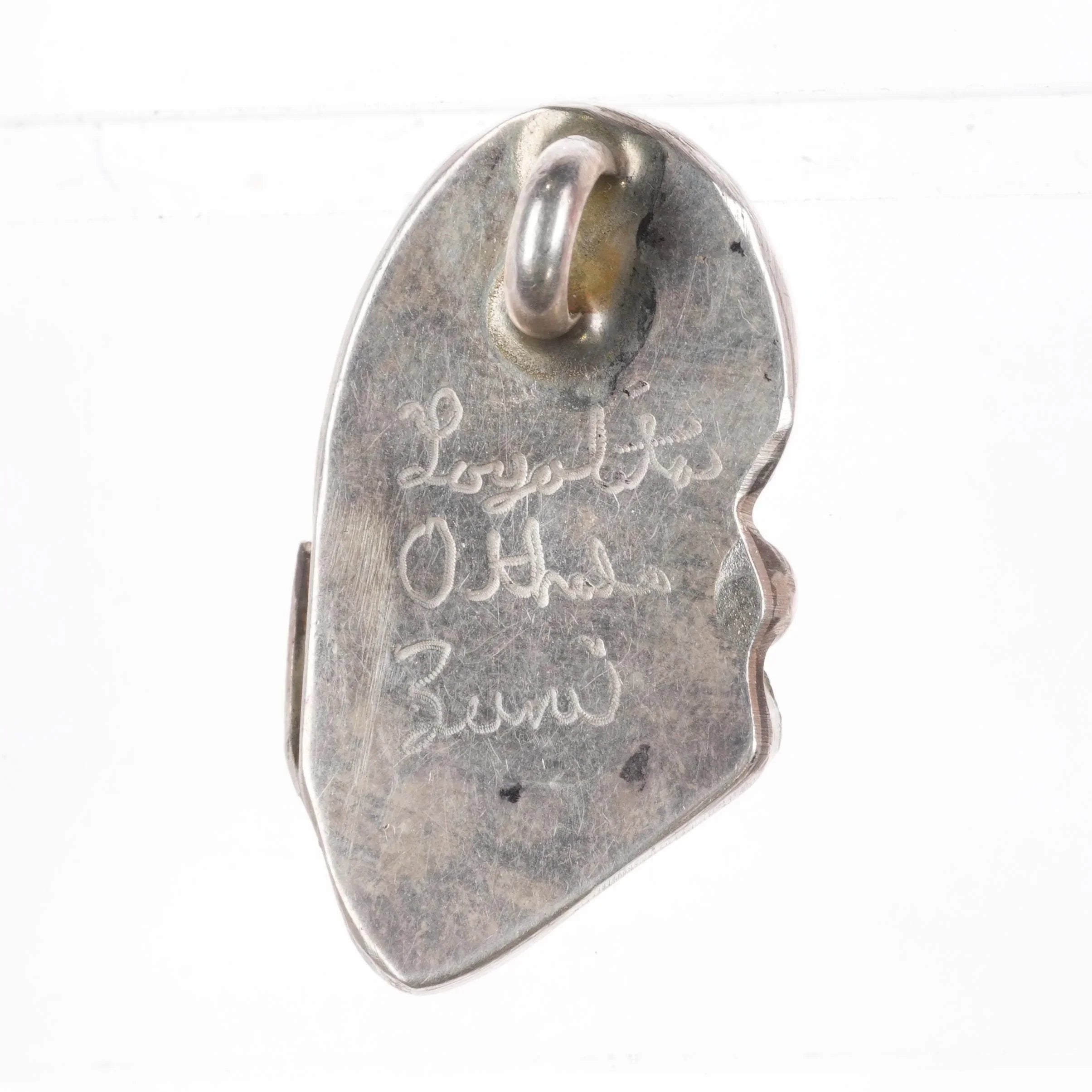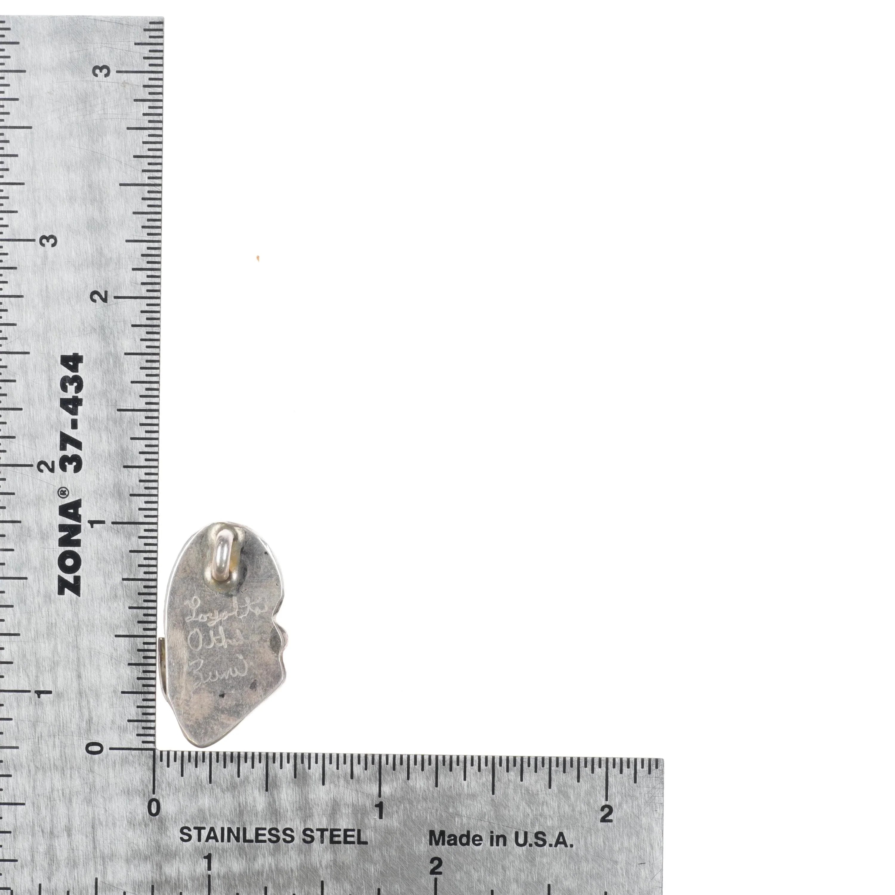Loyolita Tsatte Zuni sterling silver carved turquoise/coral small pendant. Tested and guaranteed solid sterling silver with weight and measurements in the pictures. No detectable issues. Any markings detected will be shown in the pictures. Great piece from large collection of Native American jewelry purchased in the last quarter of the 20th century and never worn for the most part.