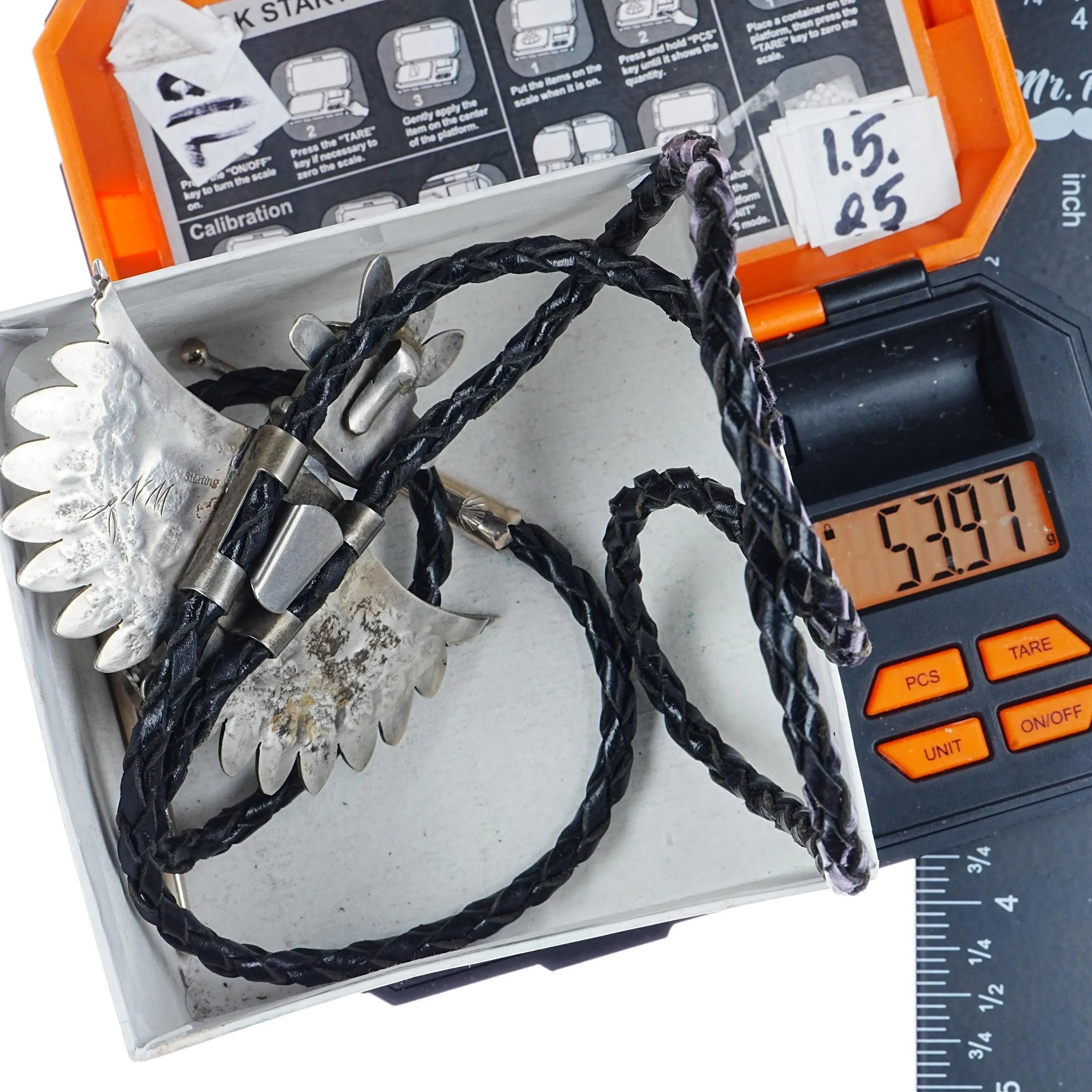 Nelson Morgan Navajo sterling and turquoise kachina bolo tie. Solid sterling silver, weight and measurements in pics (scale tared out with containter, weight shown is just the bolo). Fully functional with overall attractive appearance. 39" total length. Sterling slide and tips.