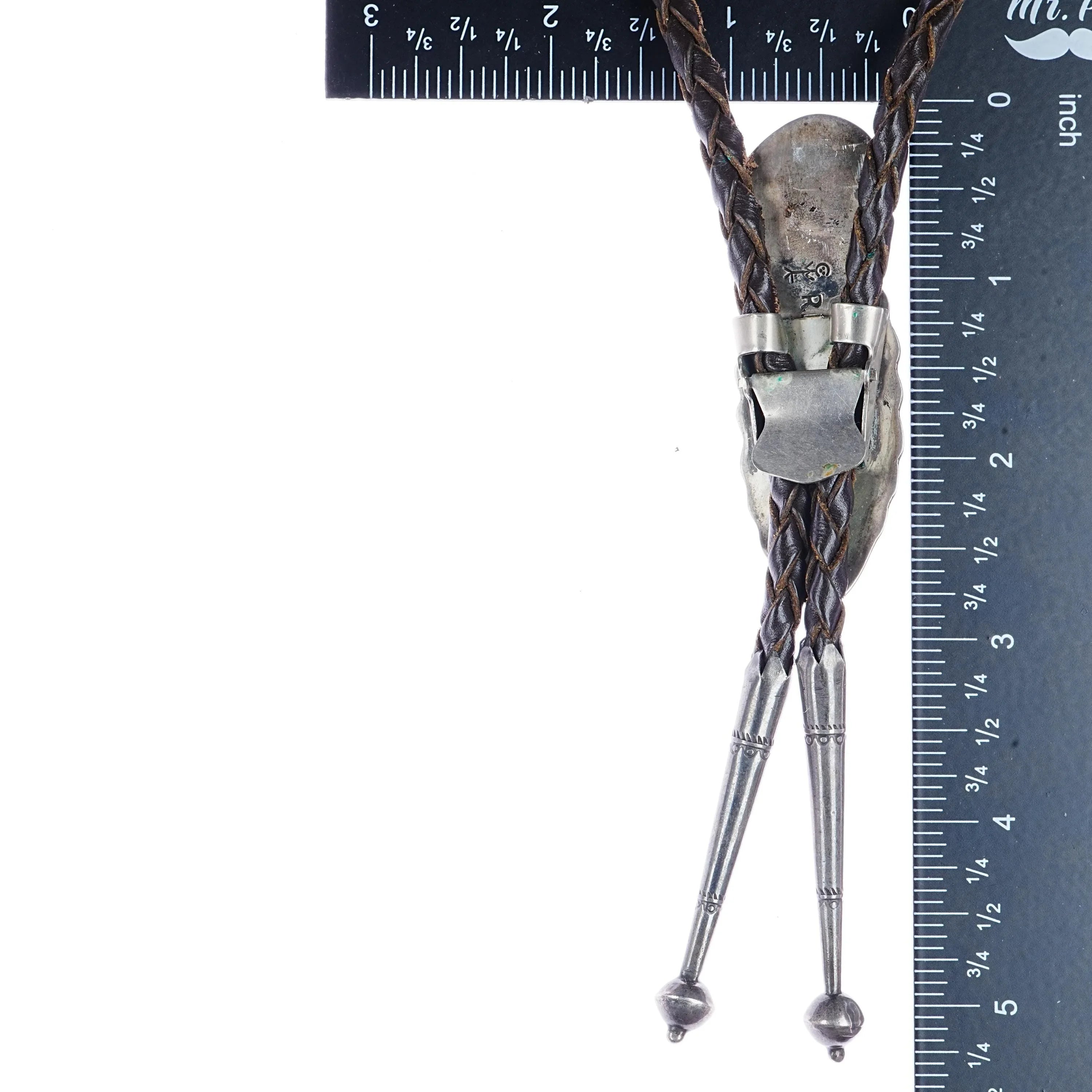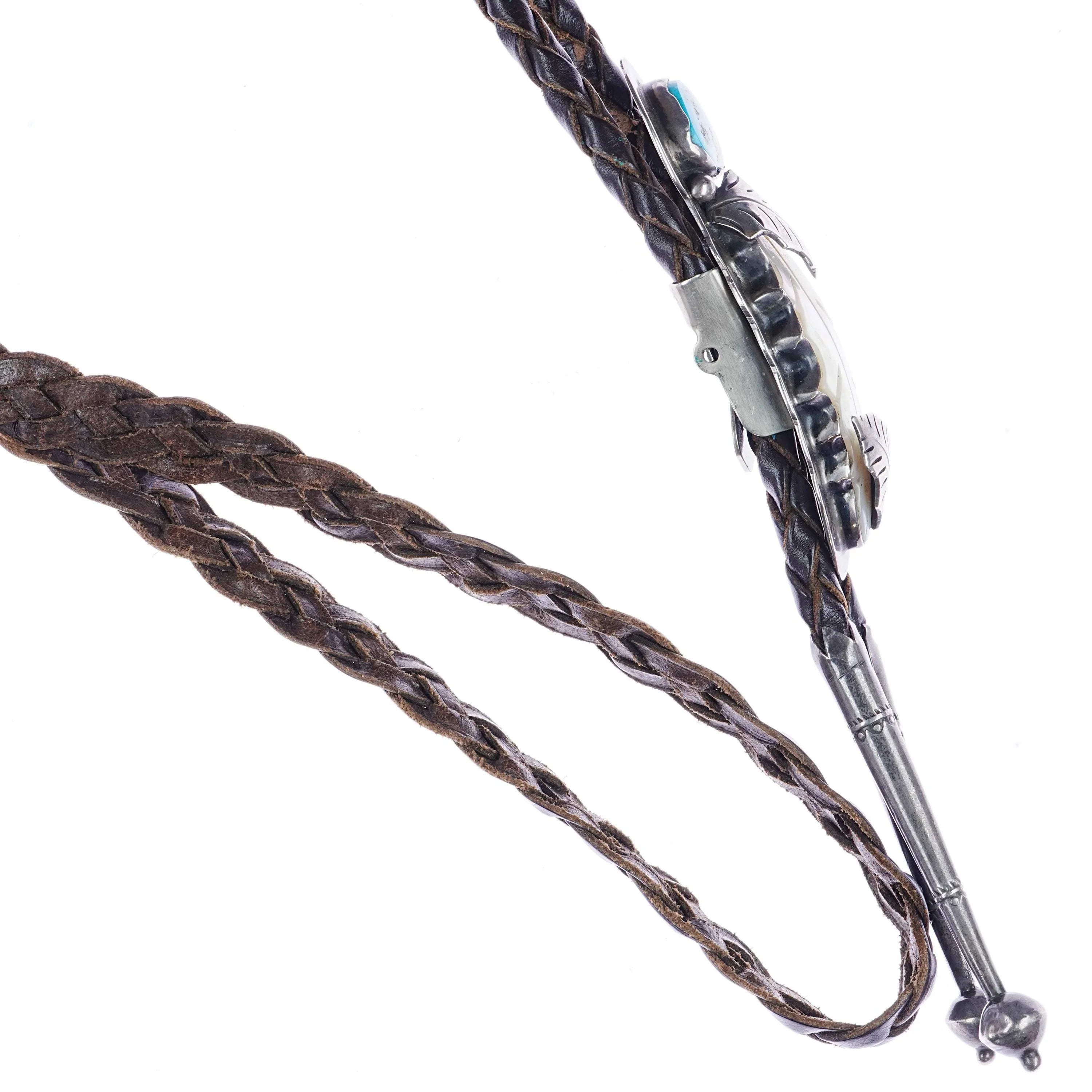 Ramone Platero - Carl Luthey sterling carved mother of pearl turquoise bolo tie. Solid sterling silver, weight and measurements in pics (scale tared out with containter, weight shown is just the bolo). Fully functional with overall attractive appearance. 42" total length. Sterling slide and tips. High quality vintage cord. The Mother of pear is rainbowy when subjected to light as it should be, it‘s just difficult to photograph and time is limited.