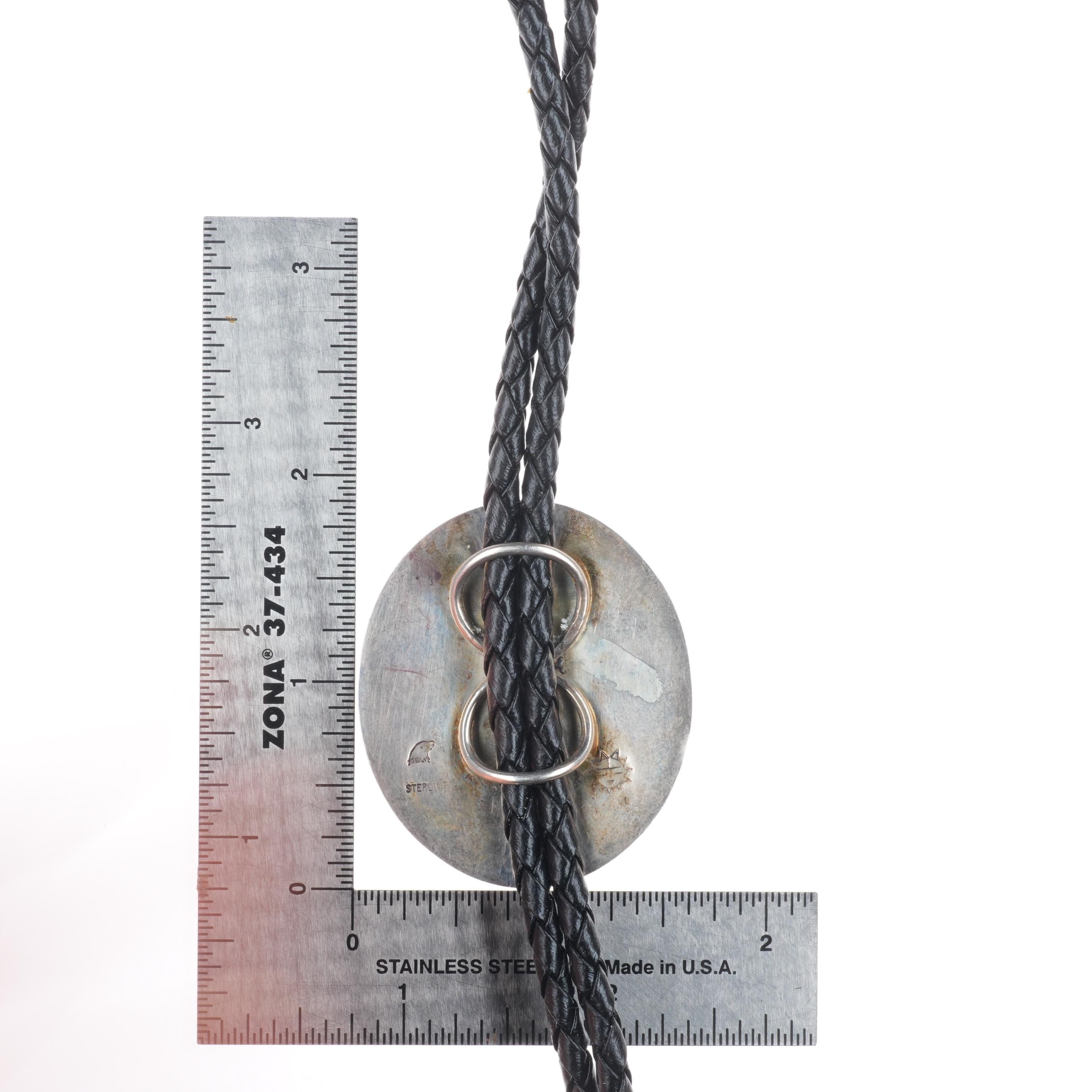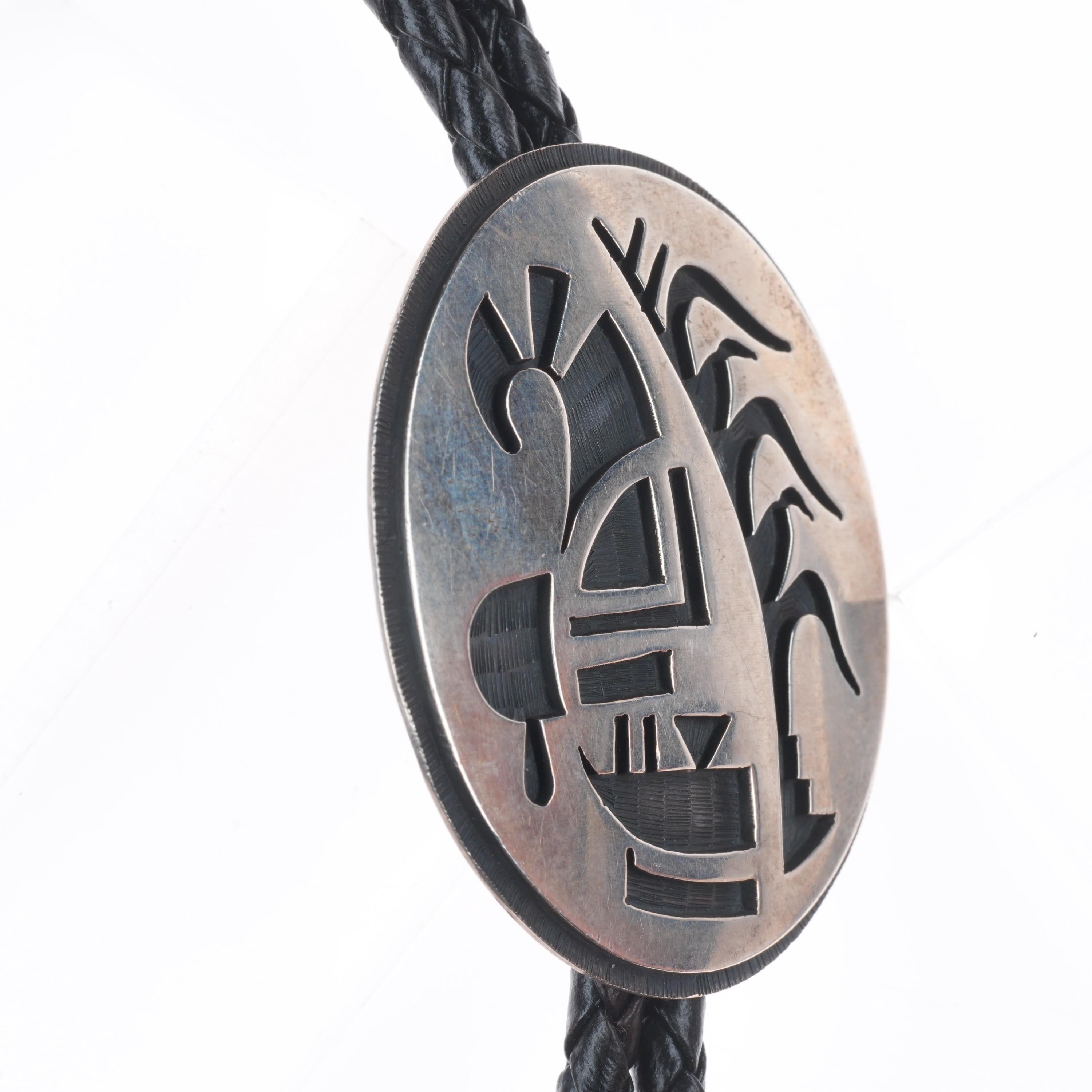 Roger Selina Hopi sterling silver bolo tie corn plant/kachina overlay. Tested and guaranteed solid sterling silver. Weight and measurements in pictures. Great bolo, 37" long with no issues. Weight shown is the entire bolo.