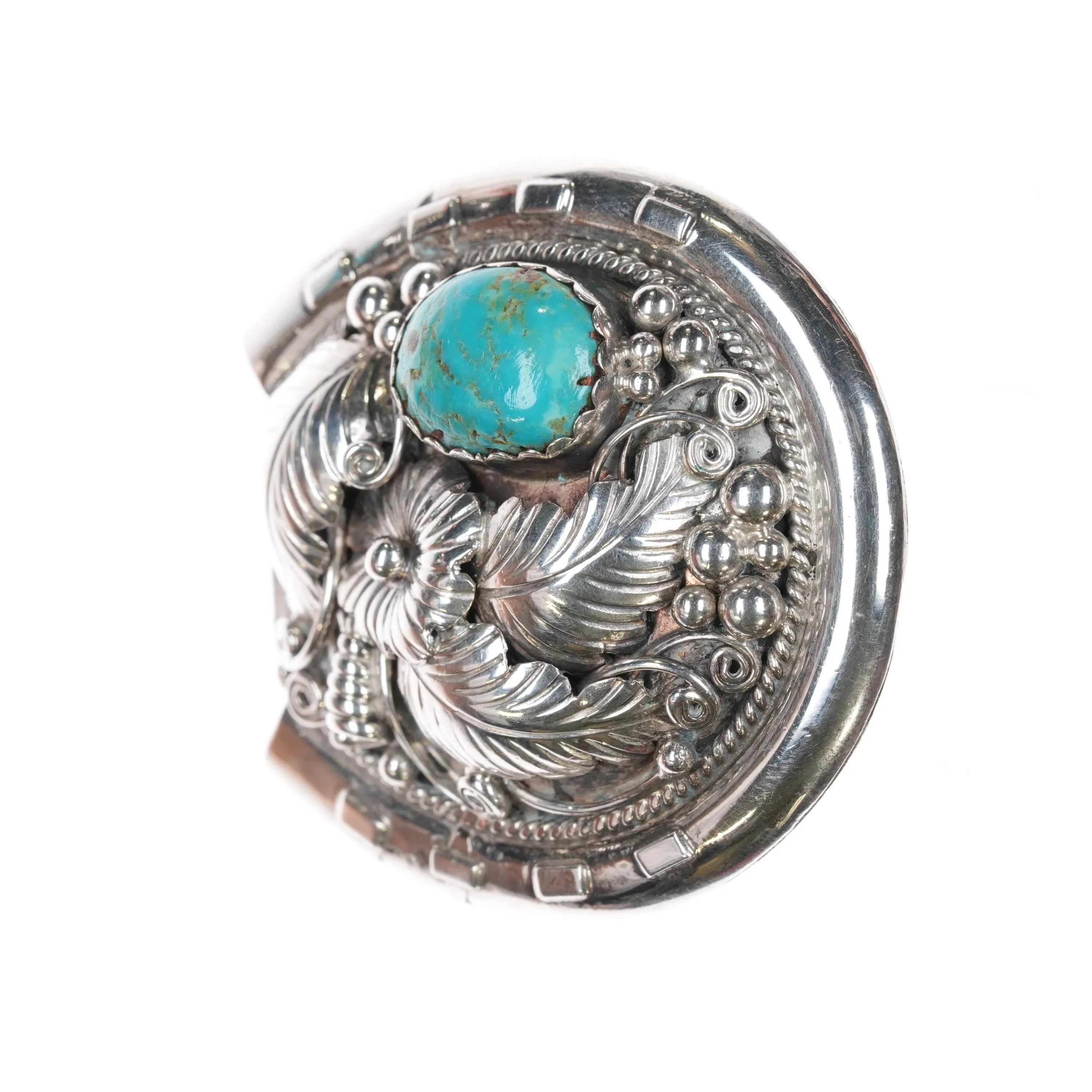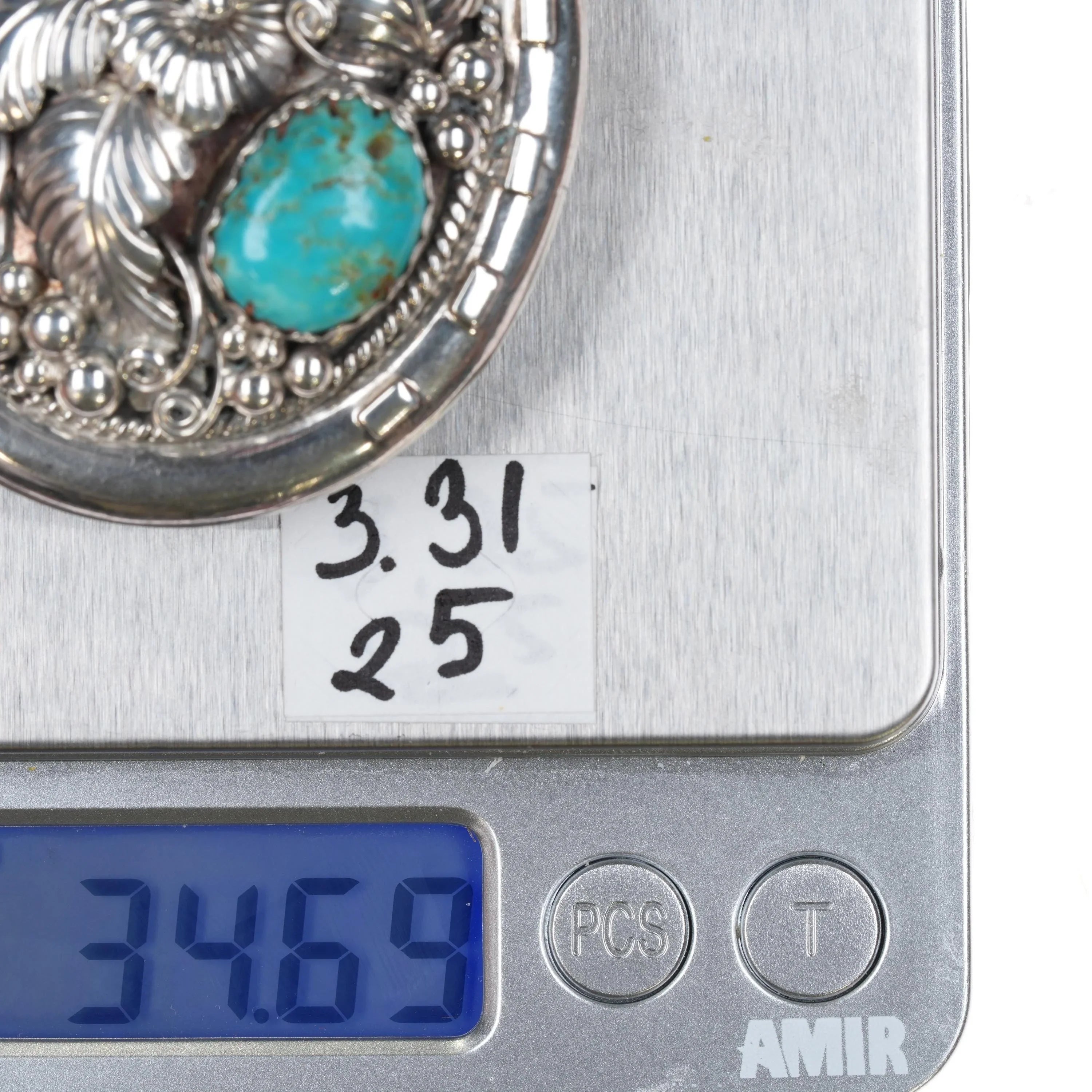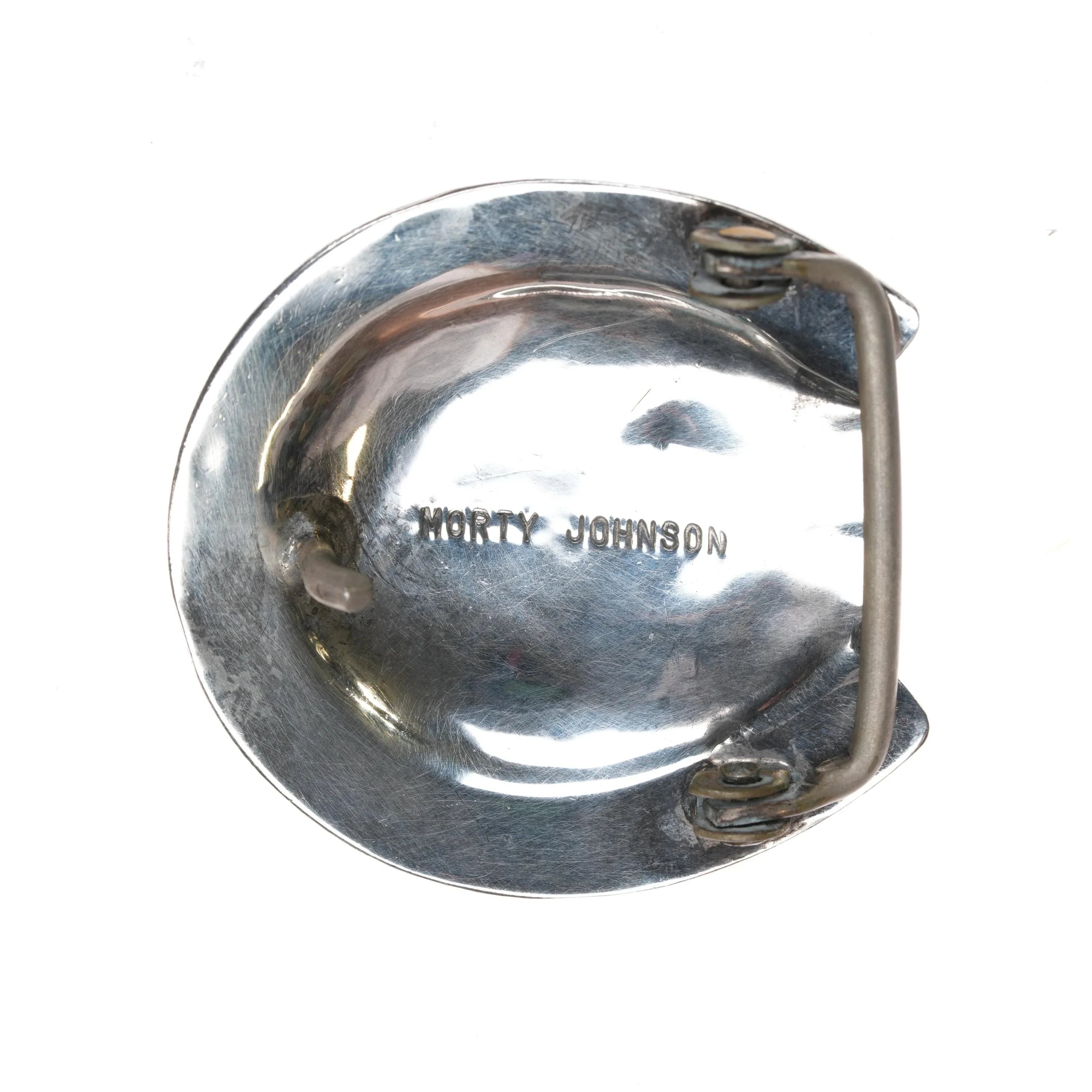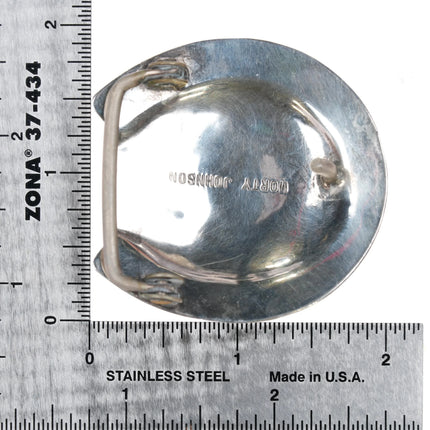 Small Vintage Morty Johnson Navajo silver and turquoise belt buckle. Solid sterling silver with weight and other measurements in the pictures. Fully functional vintage condition with minimal wear.