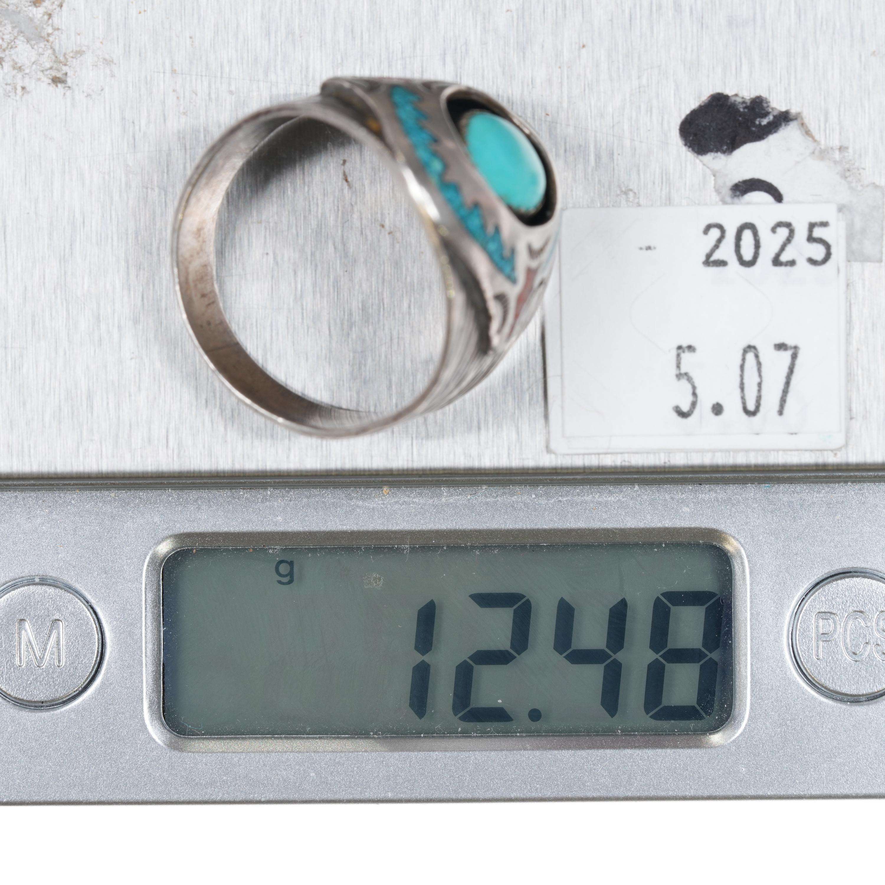 sz13 Circle JW Navajo sterling silver chip inlay ring with center turquoise.. Weight and measurements in pictures. Tested and guaranteed solid sterling silver, marked as shown. 70‘s-80‘s.