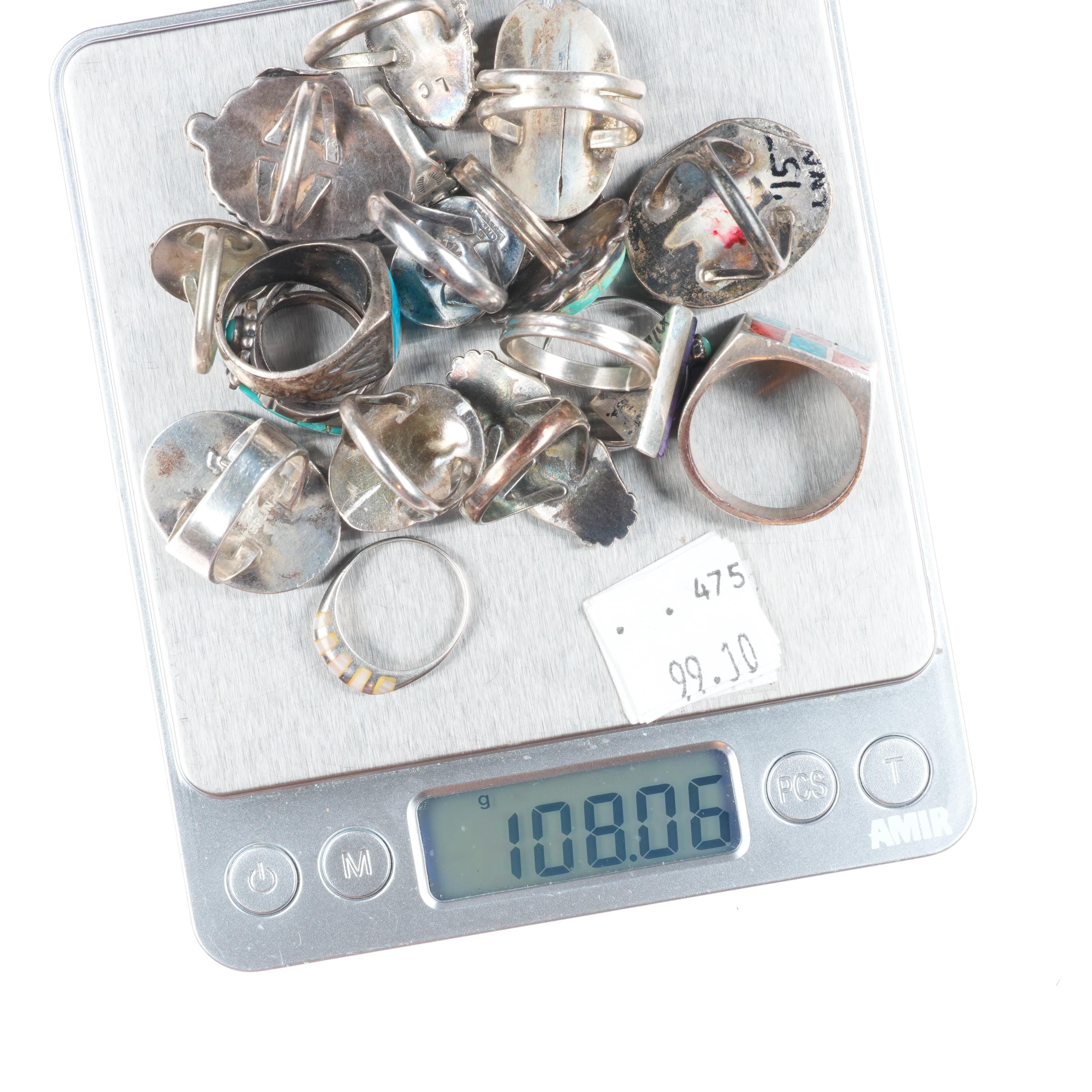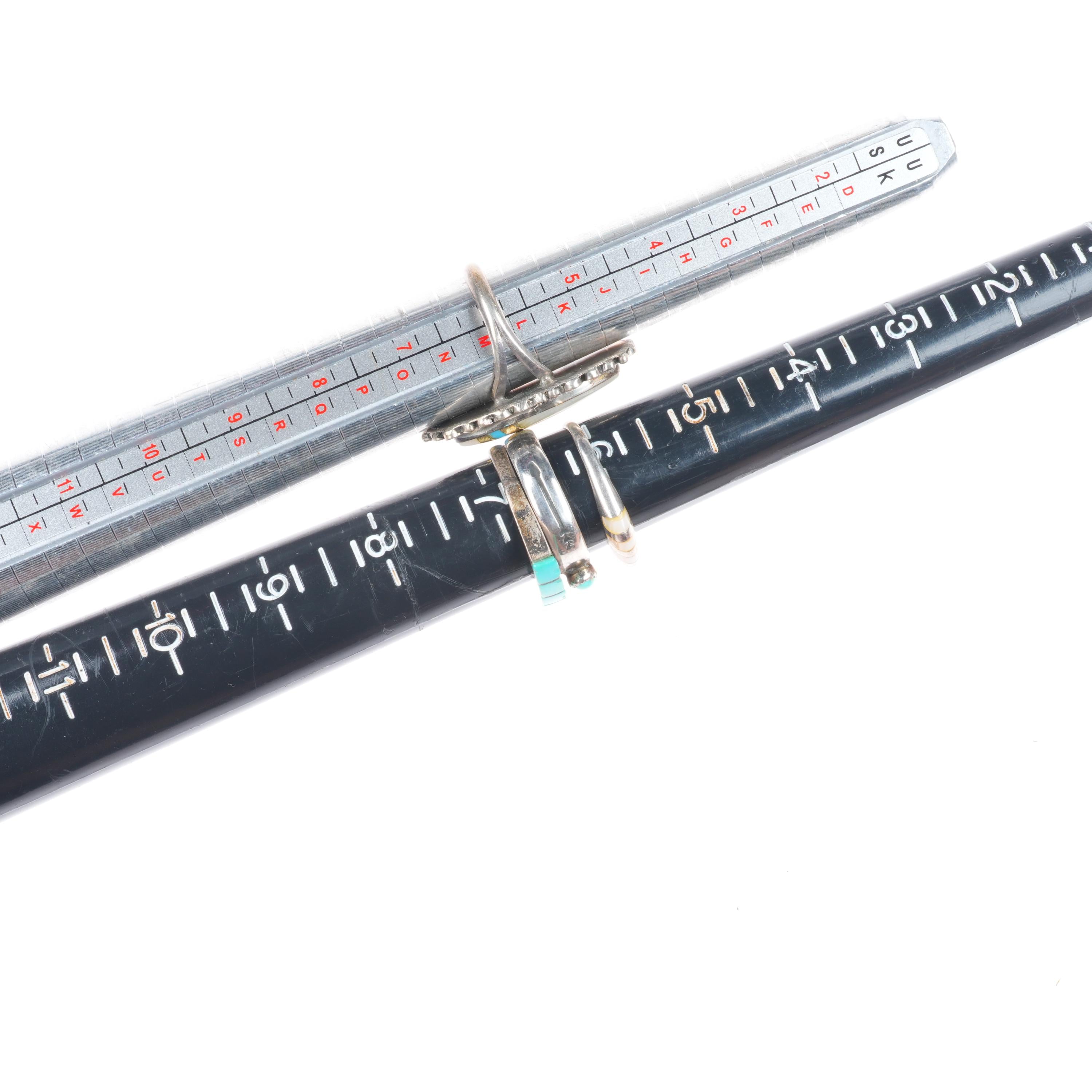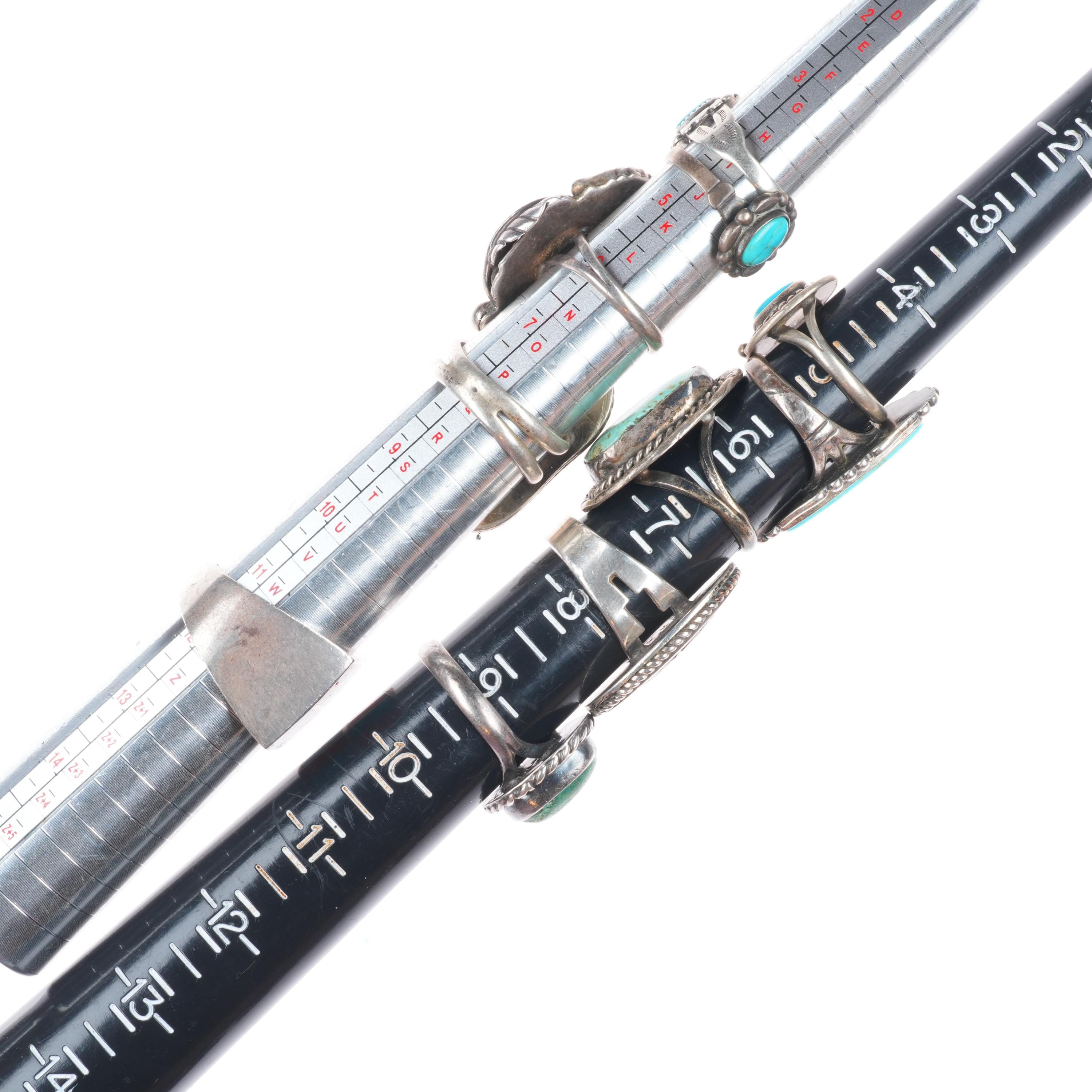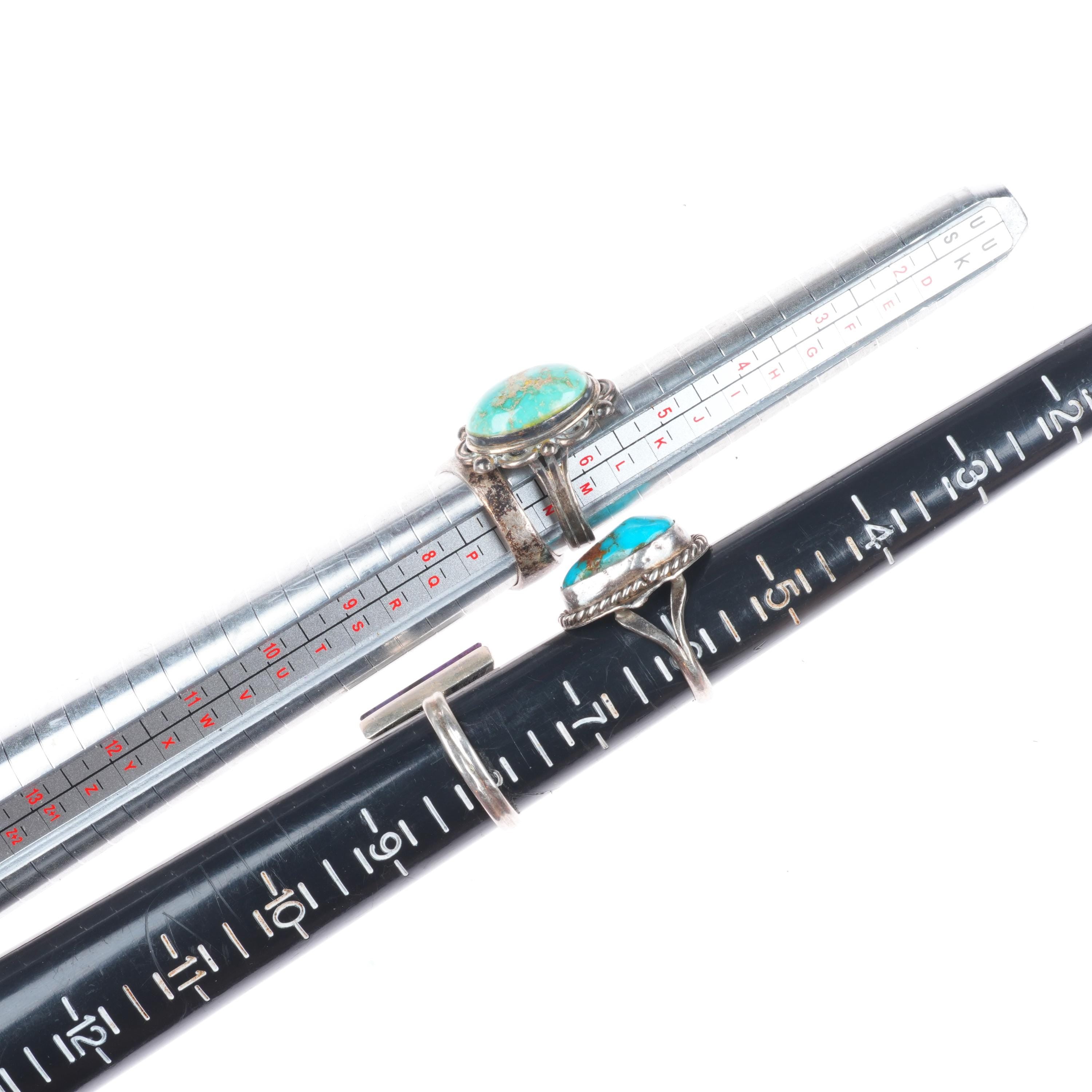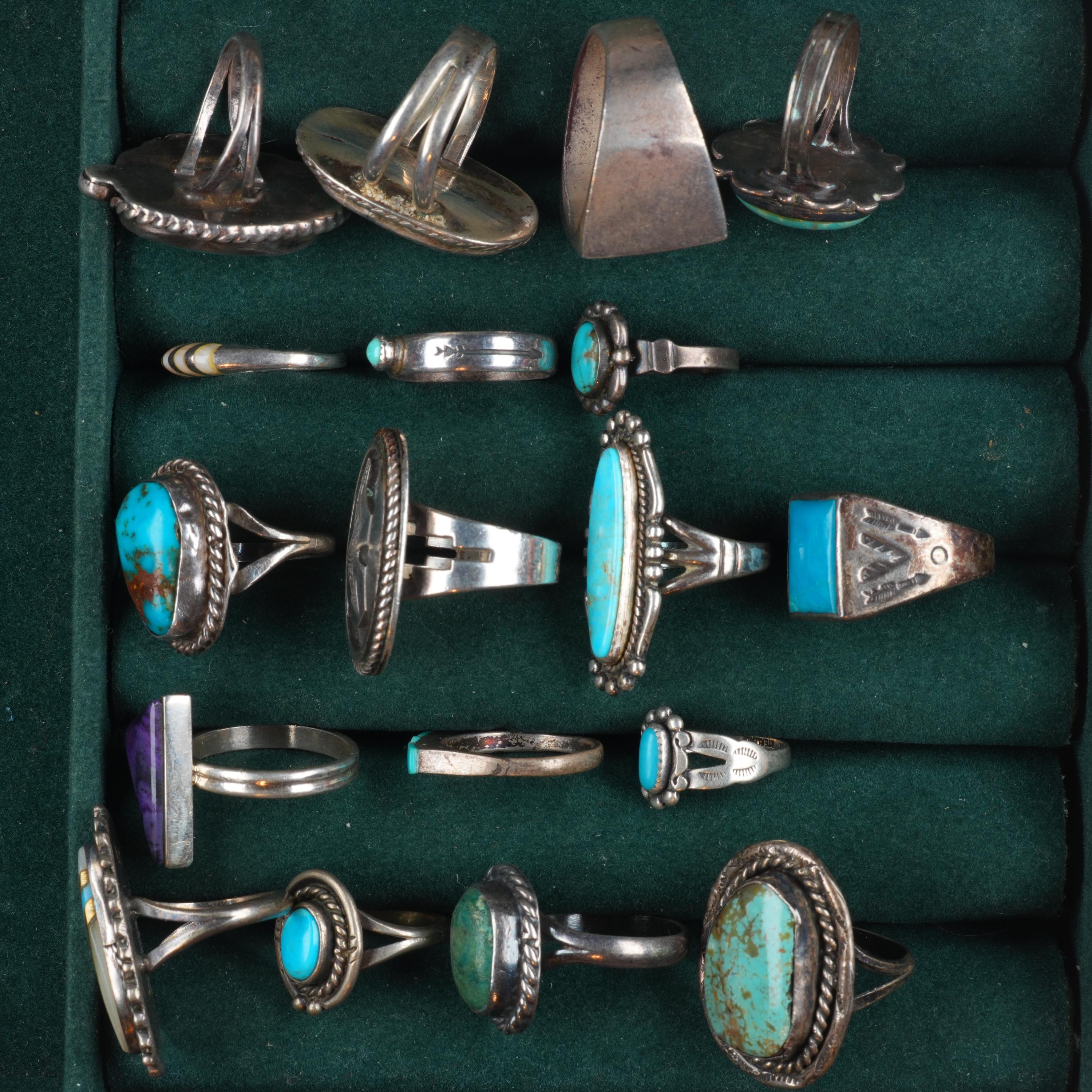 sz4-12 Navajo/Zuni/Southwestern sterling silver turquoise/sugilite rings lot. Tested and guaranteed solid sterling silver. Selling the 18 rings shown with weight and measurements in pictures, shown on sizers. Age appropriate wear. Some marked, some not marked. I am making lots of these lots with my wife photographing and me listing. We are listing in lots due to time limitations, so we are not heavily scrutinizing each ring. Most are going to be Native American made, but there will likely be some southwestern style rings mixed in each lot. Or one two totally unrelated but still sterling. My wife who is making the lots doesn‘t know the difference as she‘s Vietnamese. Please look at the pictures and make up your own mind for condition, etc. There may be dents, cracked stones, etc. I tried to weed out any junk before I gave them to her, but we are in a hurry. Time is the number one consideration when making these lots so there will be some surprises, hopefully more good than bad :)