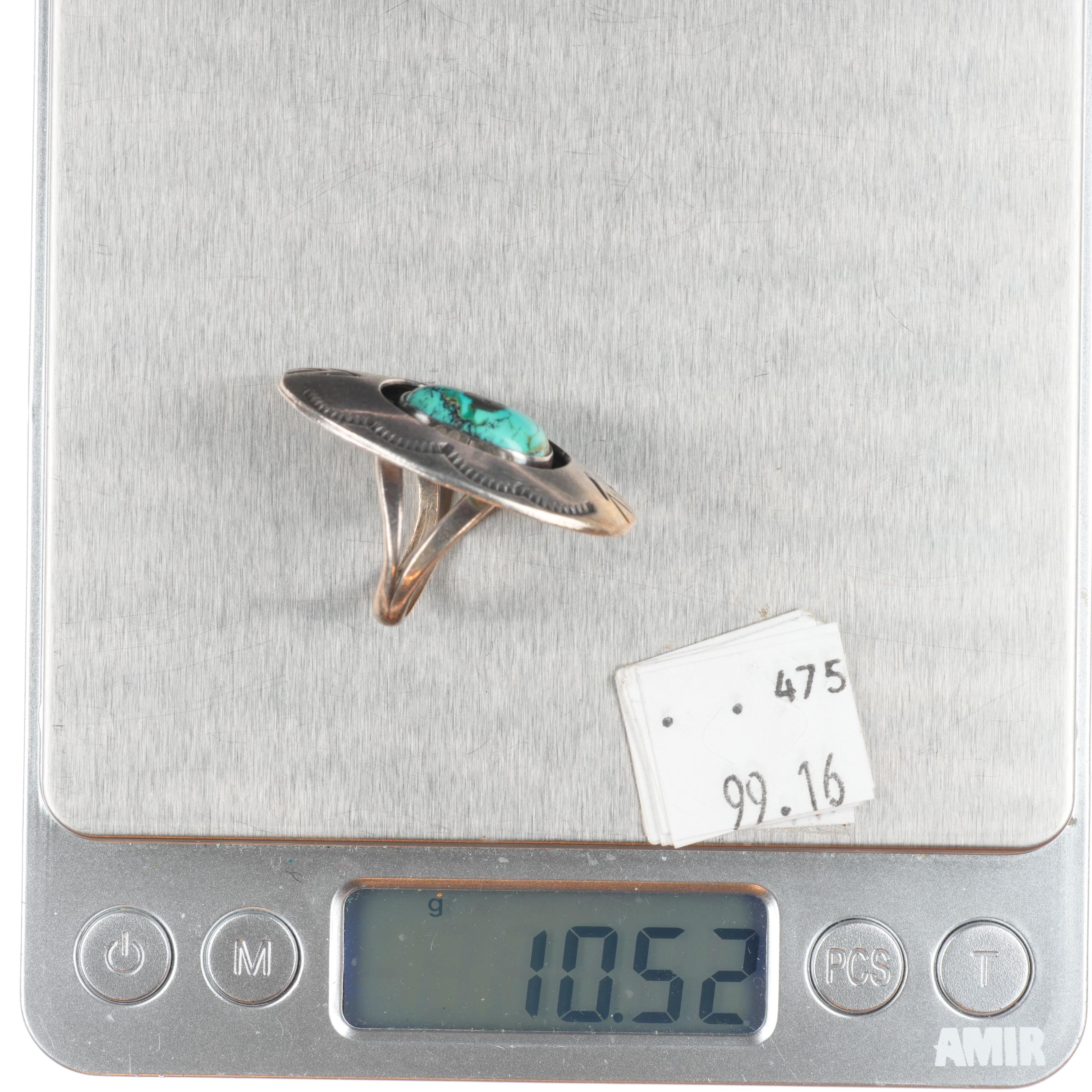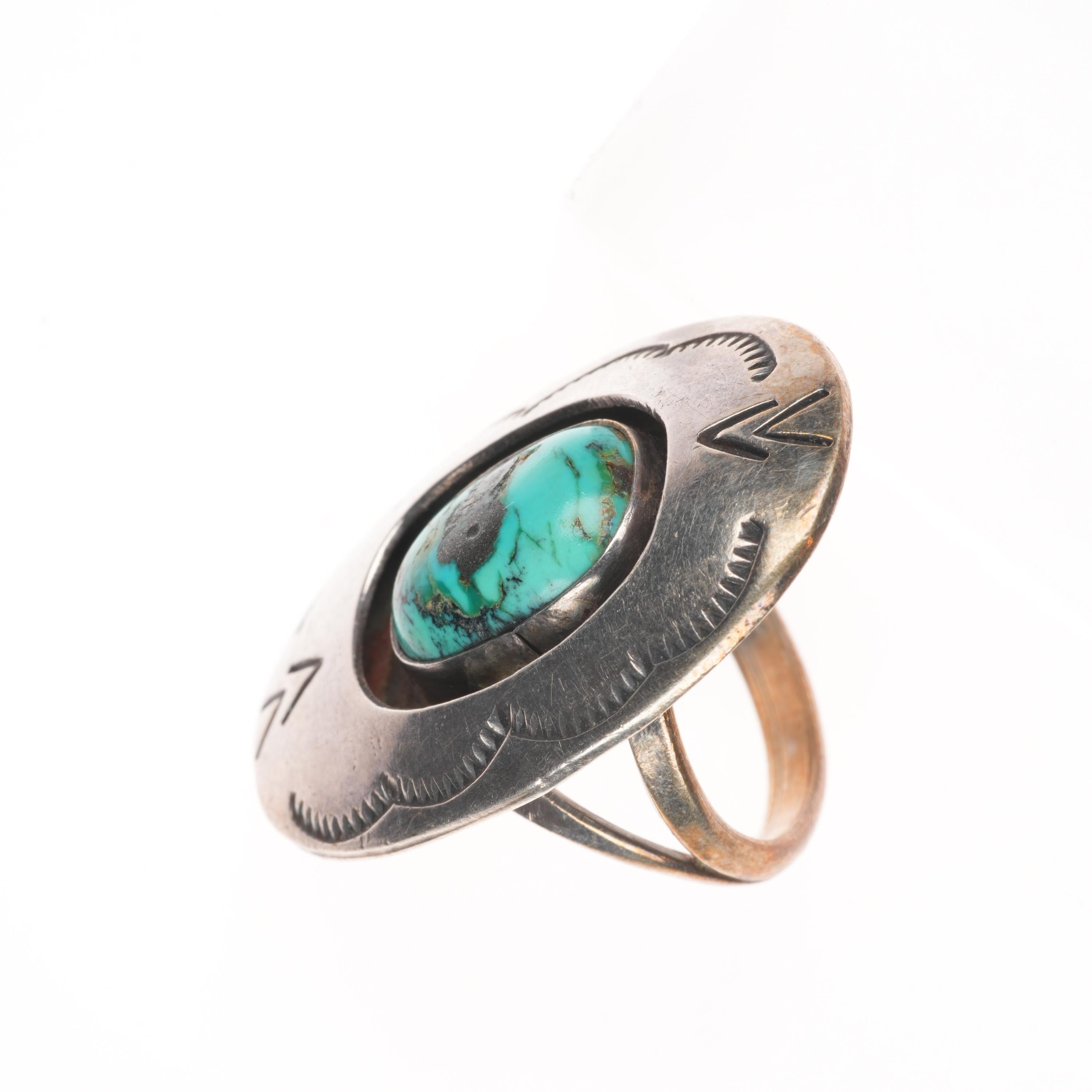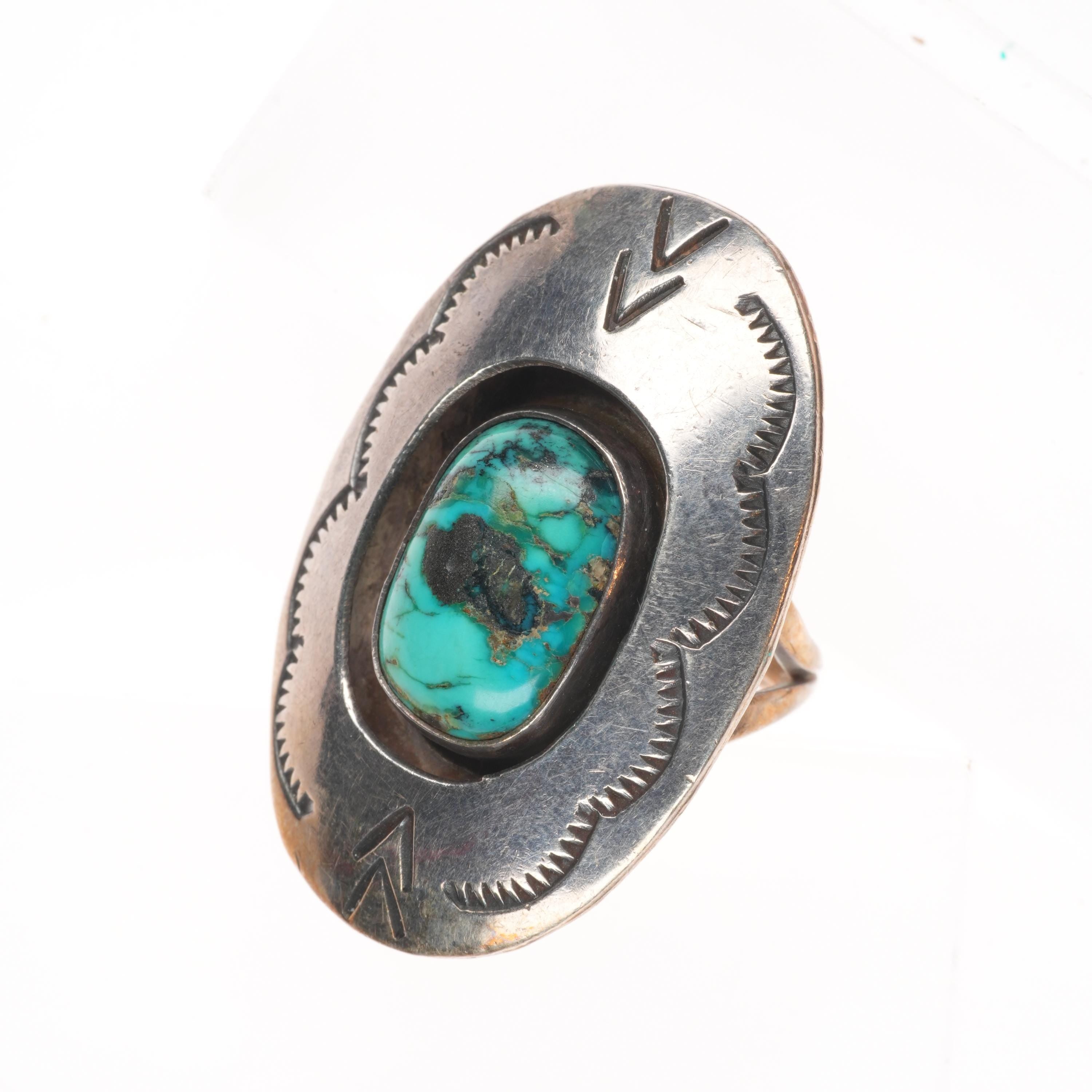 sz6.5 Vintage Navajo sterling silver shadowbox ring with turquoise. Tested and guaranteed solid sterling silver. Nice ring from the third quarter of the 20th century.