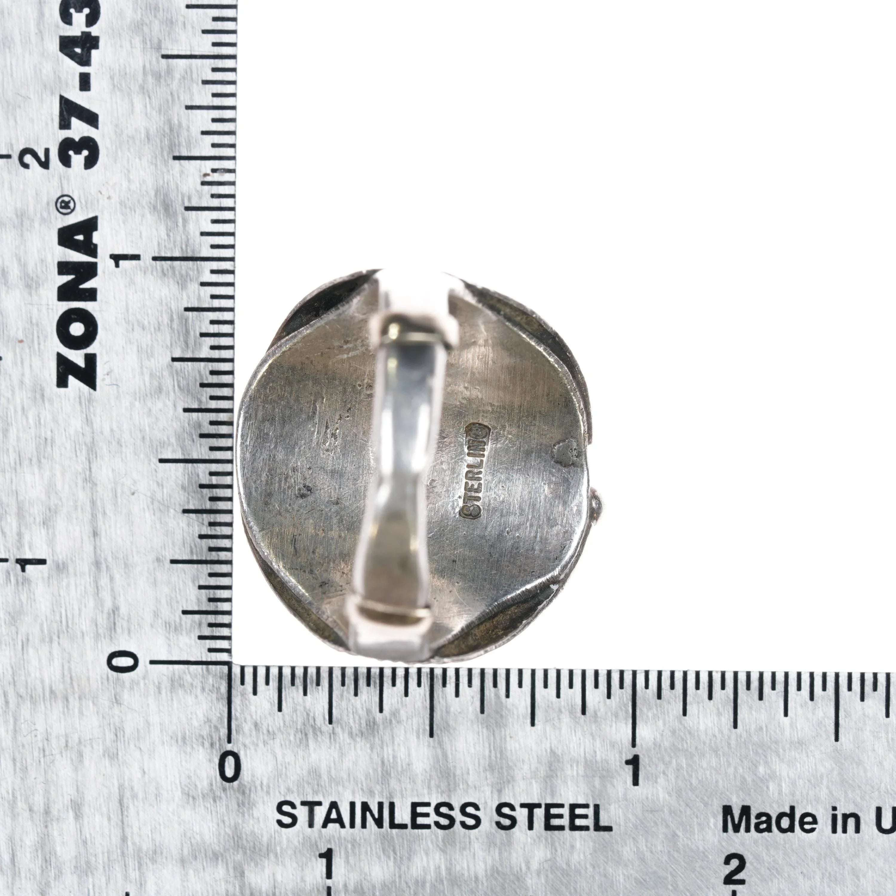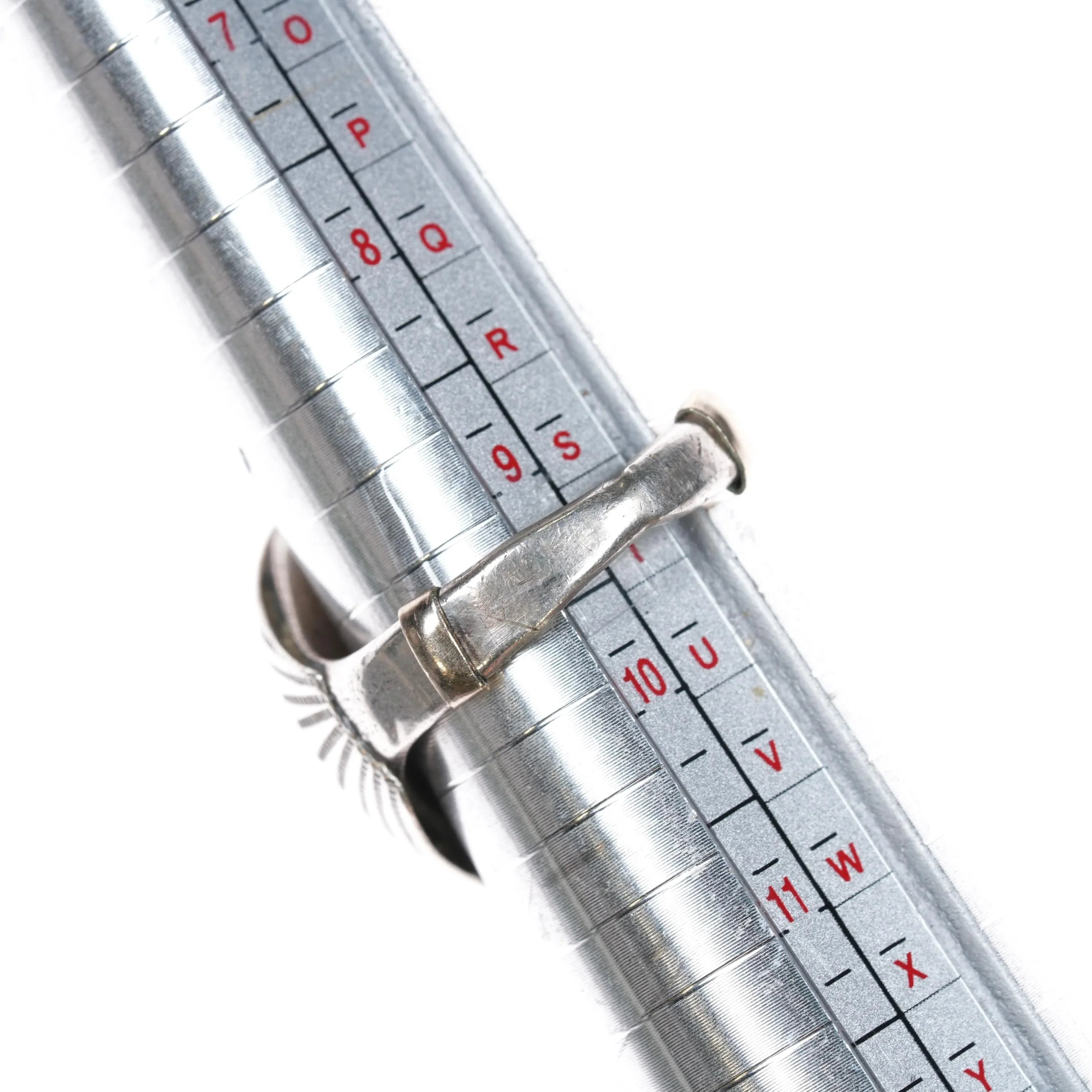 sz9.5 1970‘s Navajo sterling silver, turquoise, coral ornate feather ring. Weight and measurements in pictures. No issues, has a sizer so with that removed it will likely be size 10.