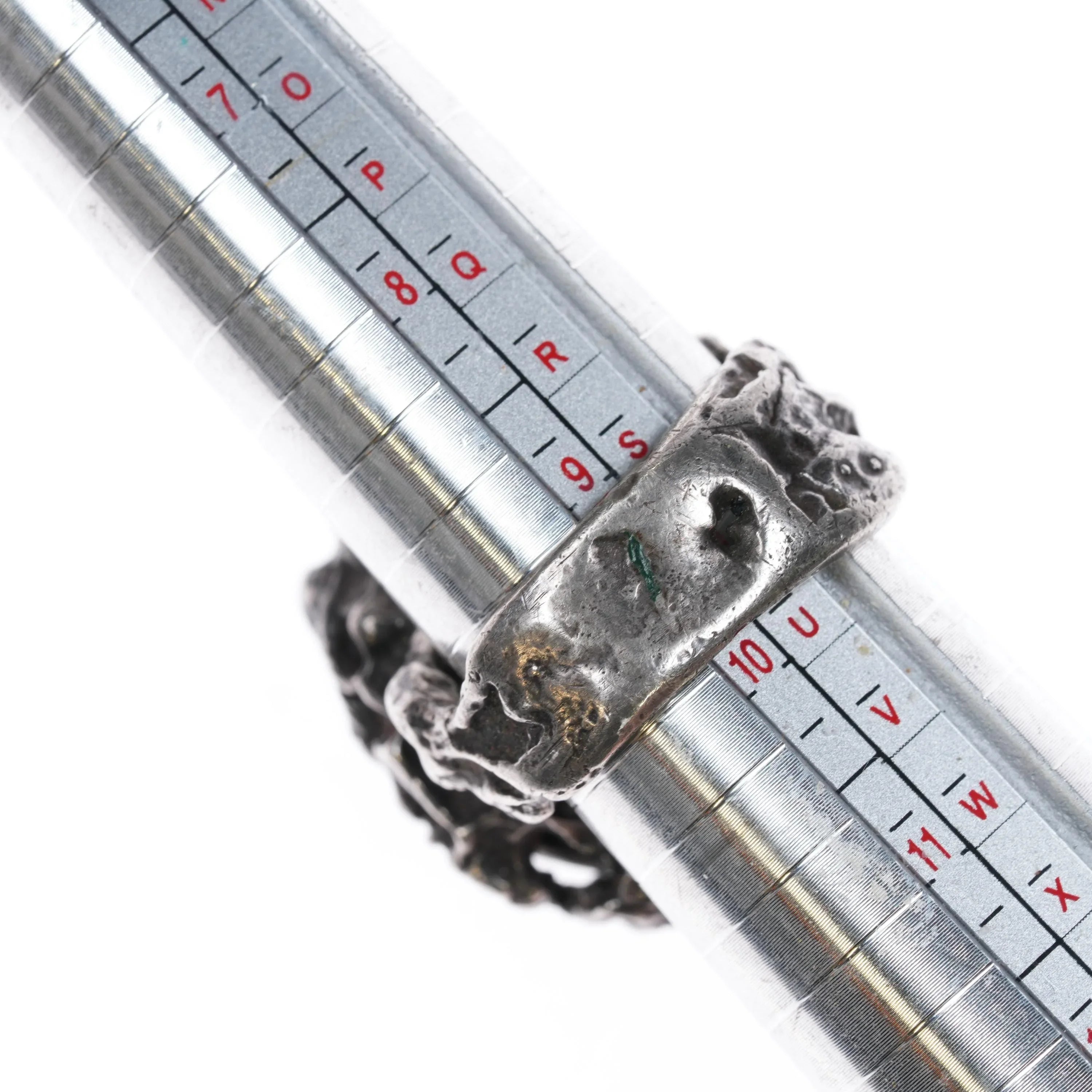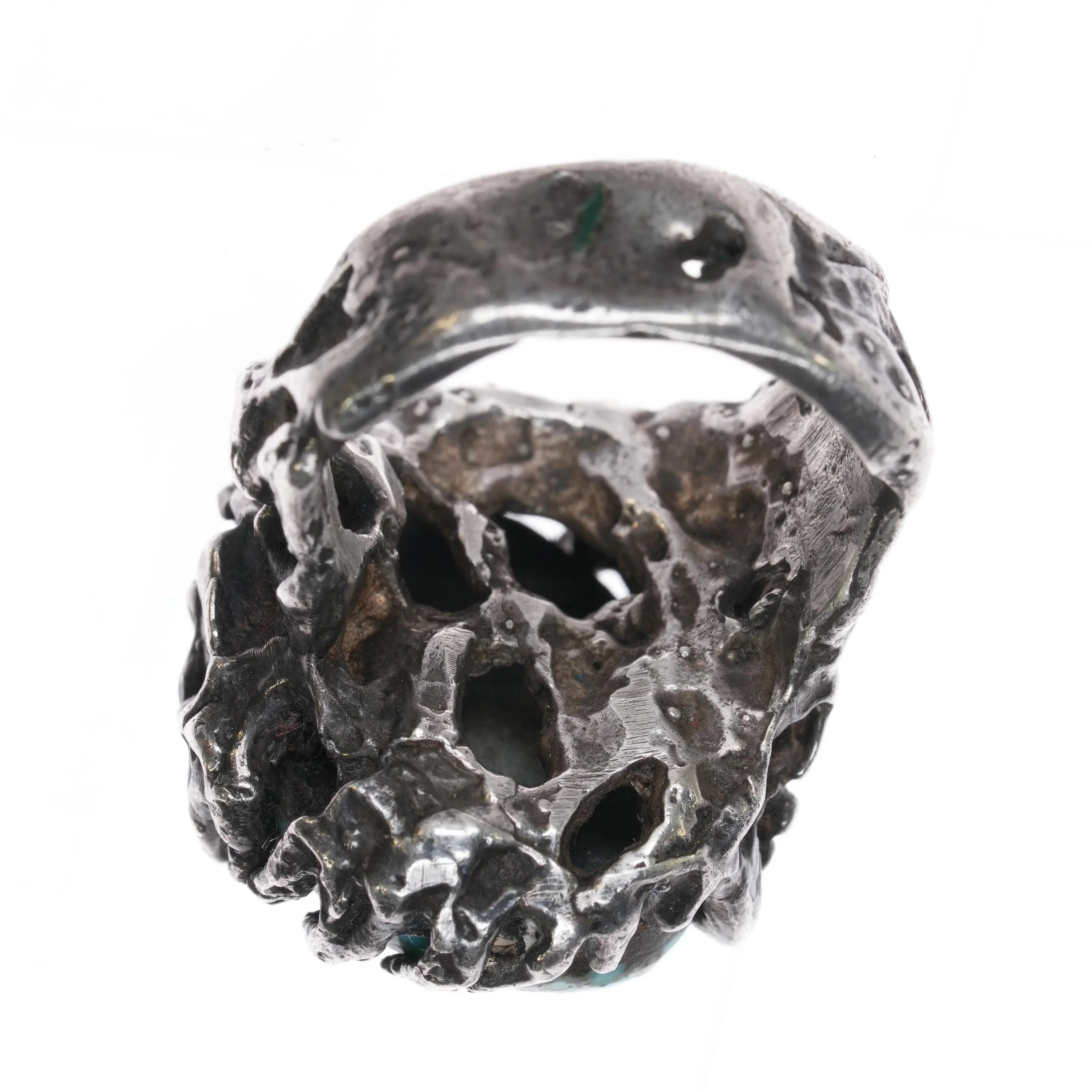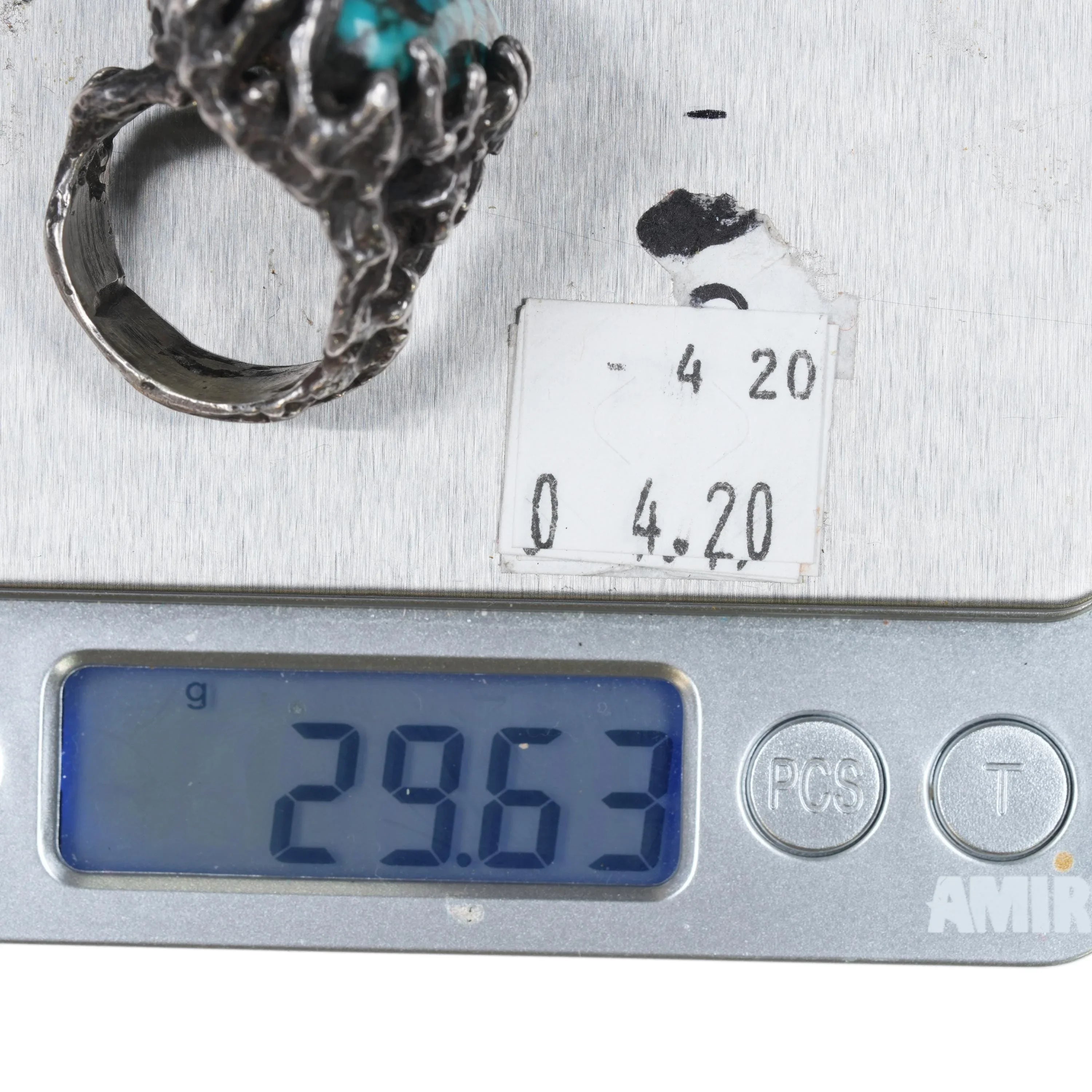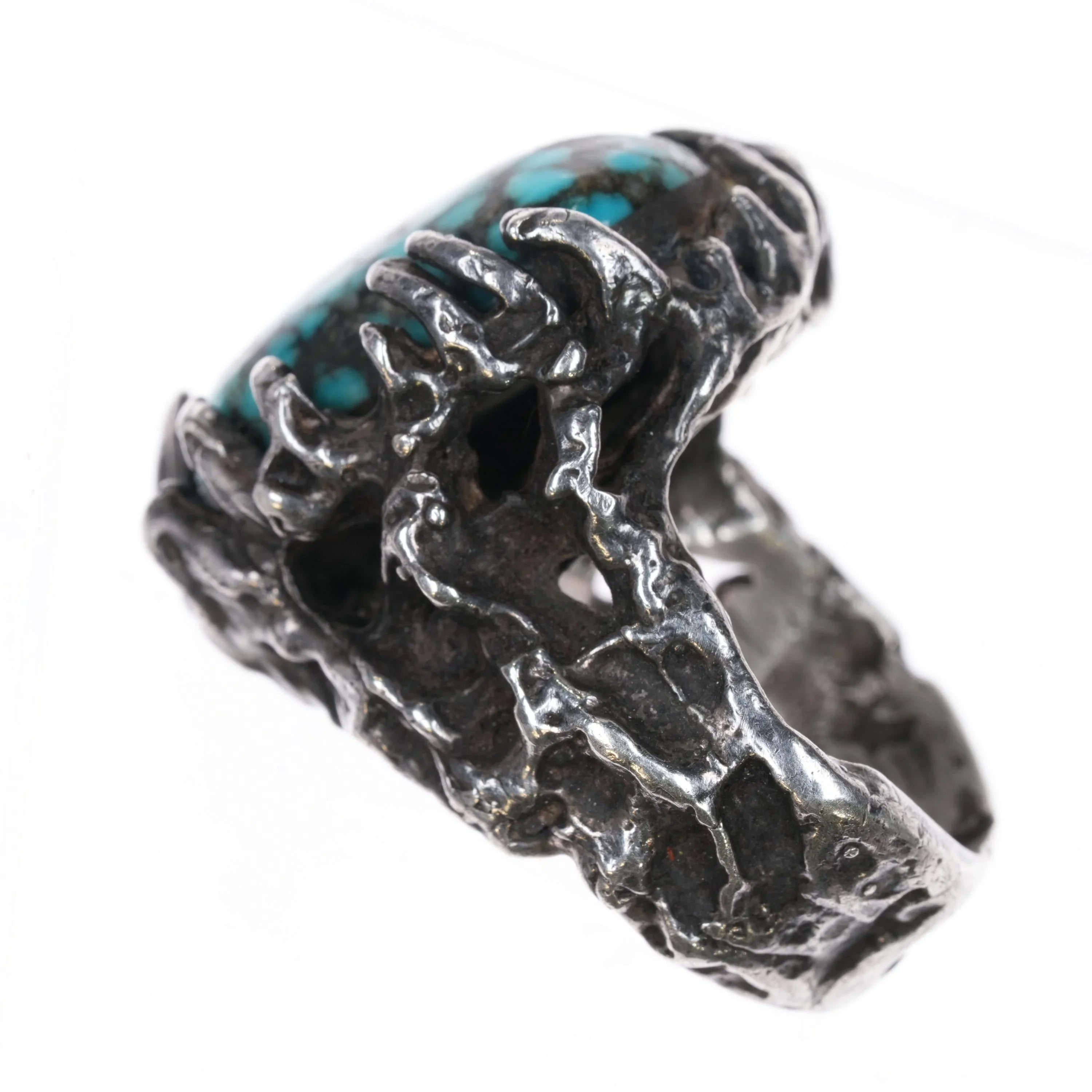sz9.75 Huge Black Web Kingman turquoise brutalist sterling silver ring. Weight and measurements in pictures. Solid sterling silver with no apparent markings. Very well made vintage ring from the third quarter of the 20th century.