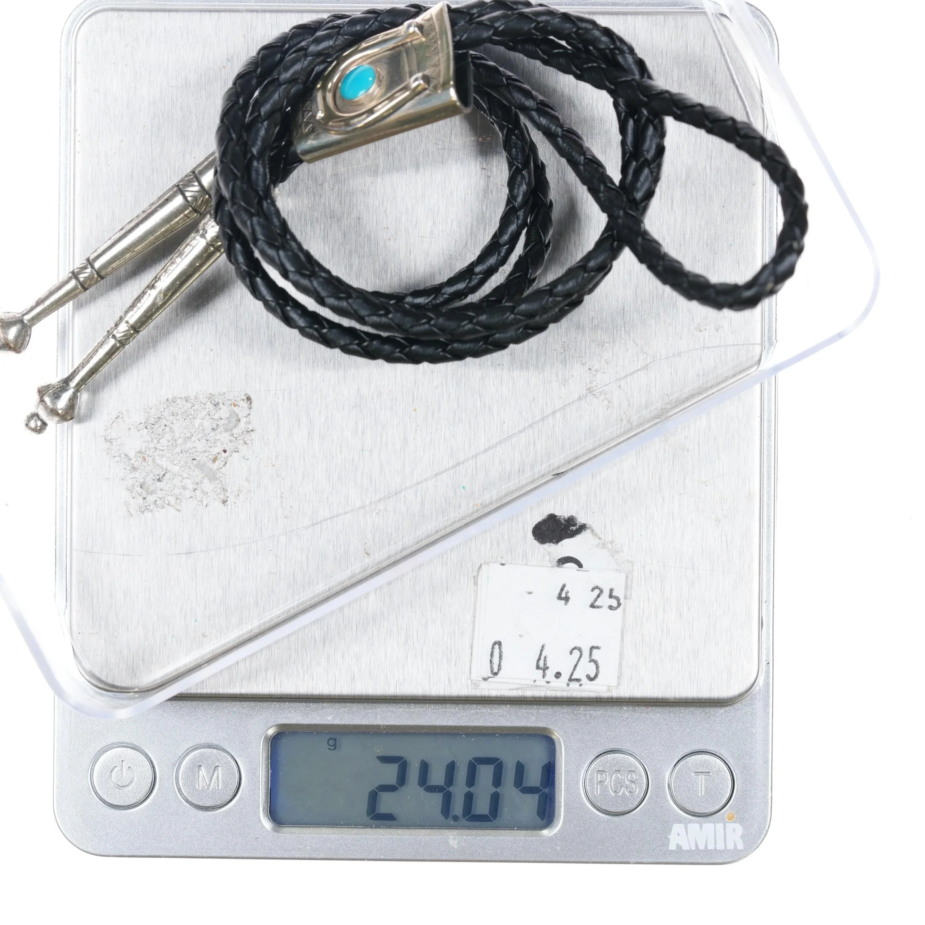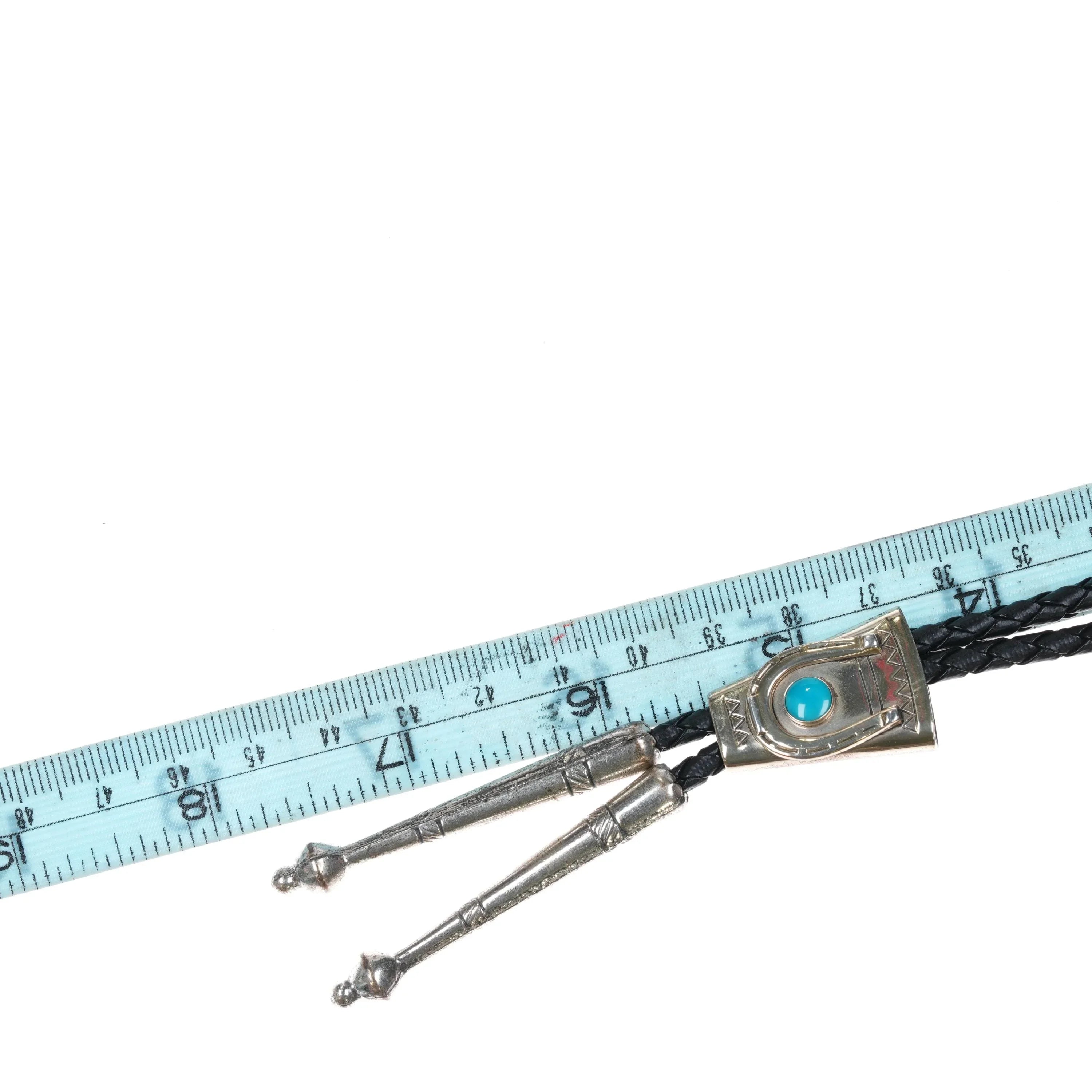 vintage Bell Trading Post sterling silver turquoise horseshoe bolo tie. Solid sterling silver slide and tips. Weight and measurements in pics. 36" long. Expected wear with no apparent damage. Weight shown is just the entire bolo, if there is a tray pictured it will be tared out of course.