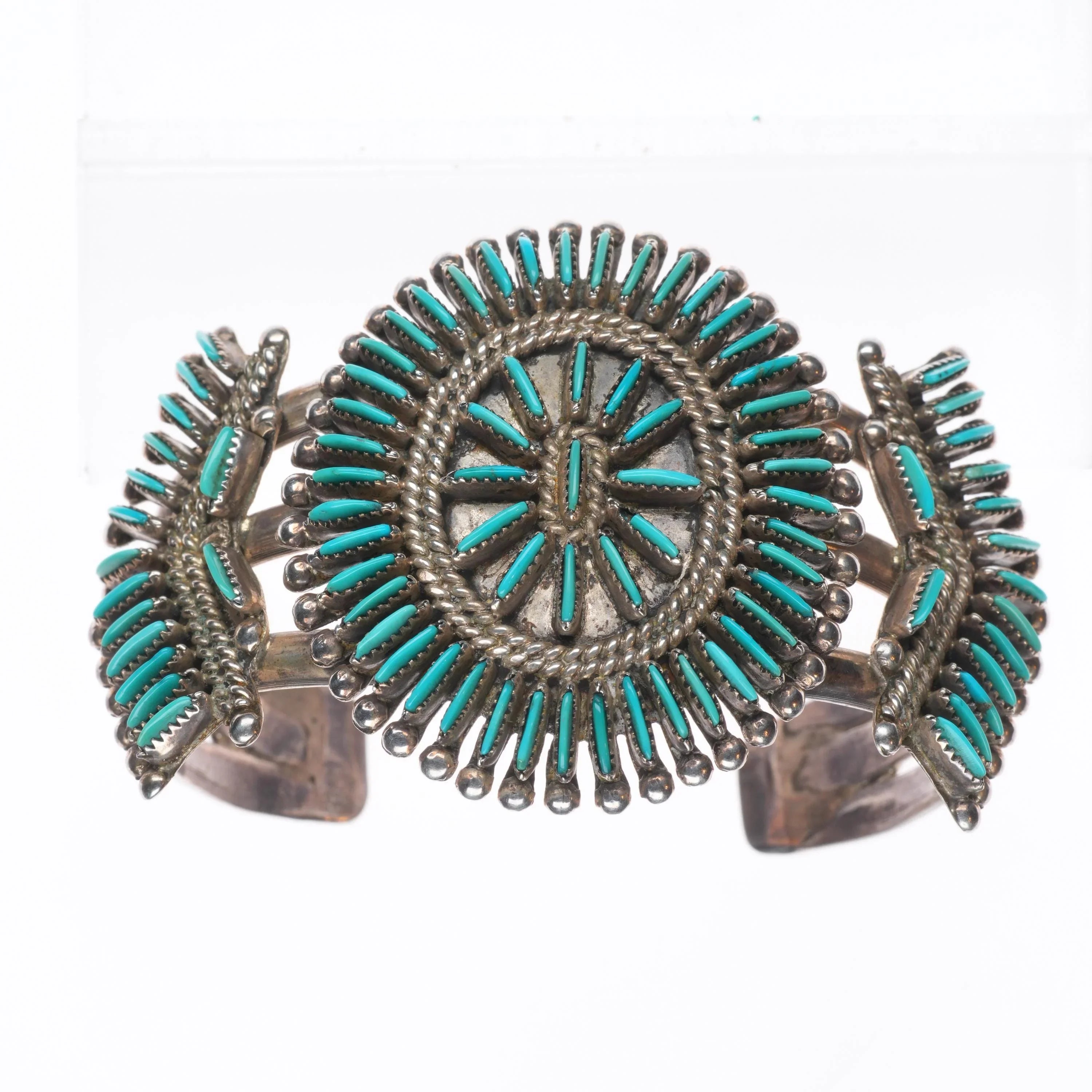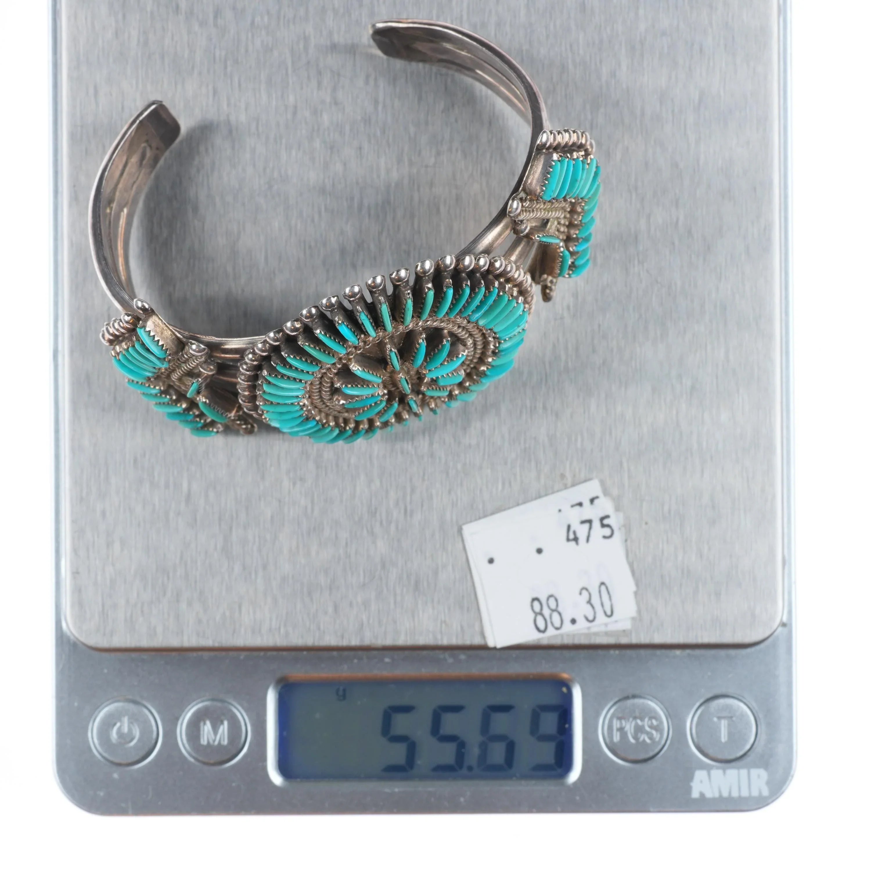 6.5" Vintage Bellson Zuni sterling silver needlepoint turquoise cuff bracelet