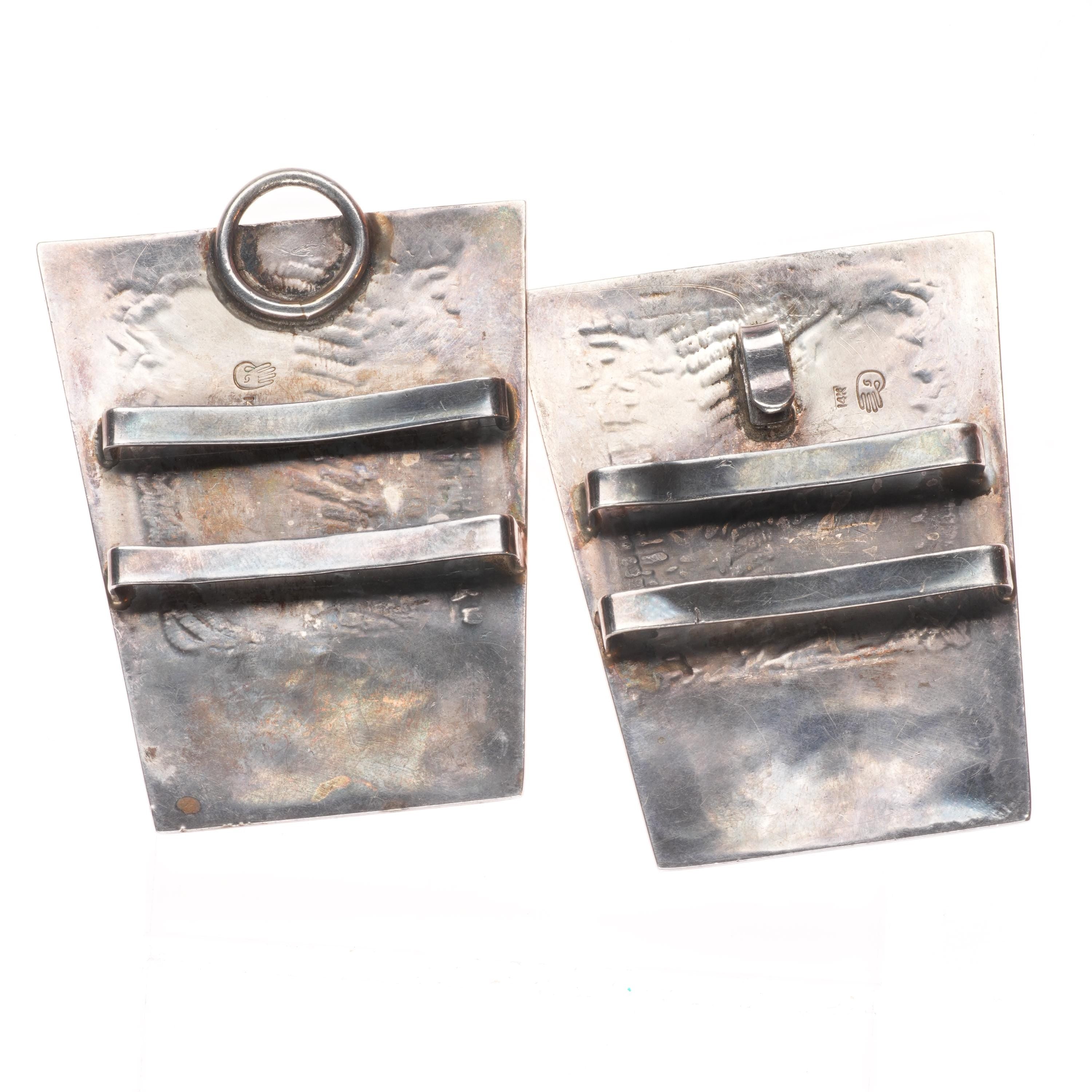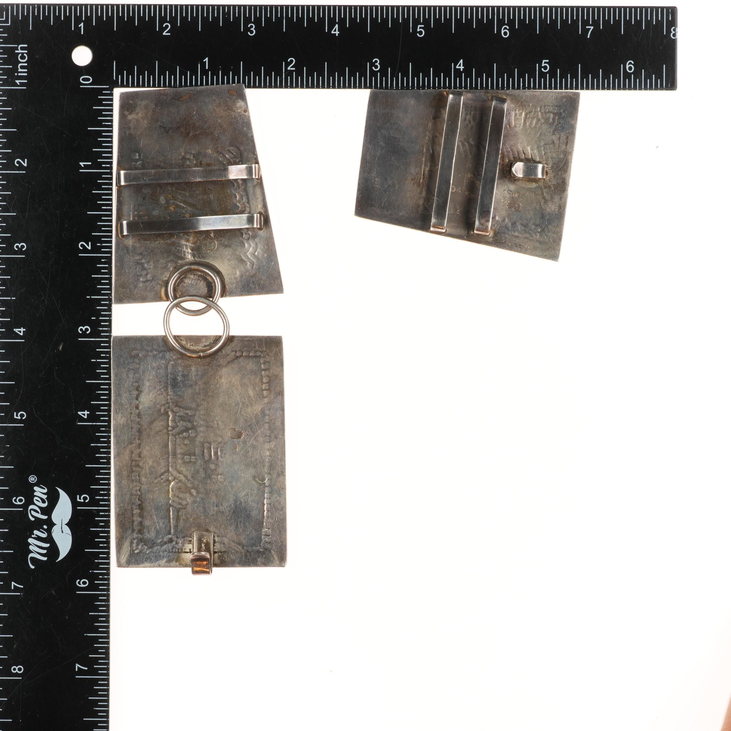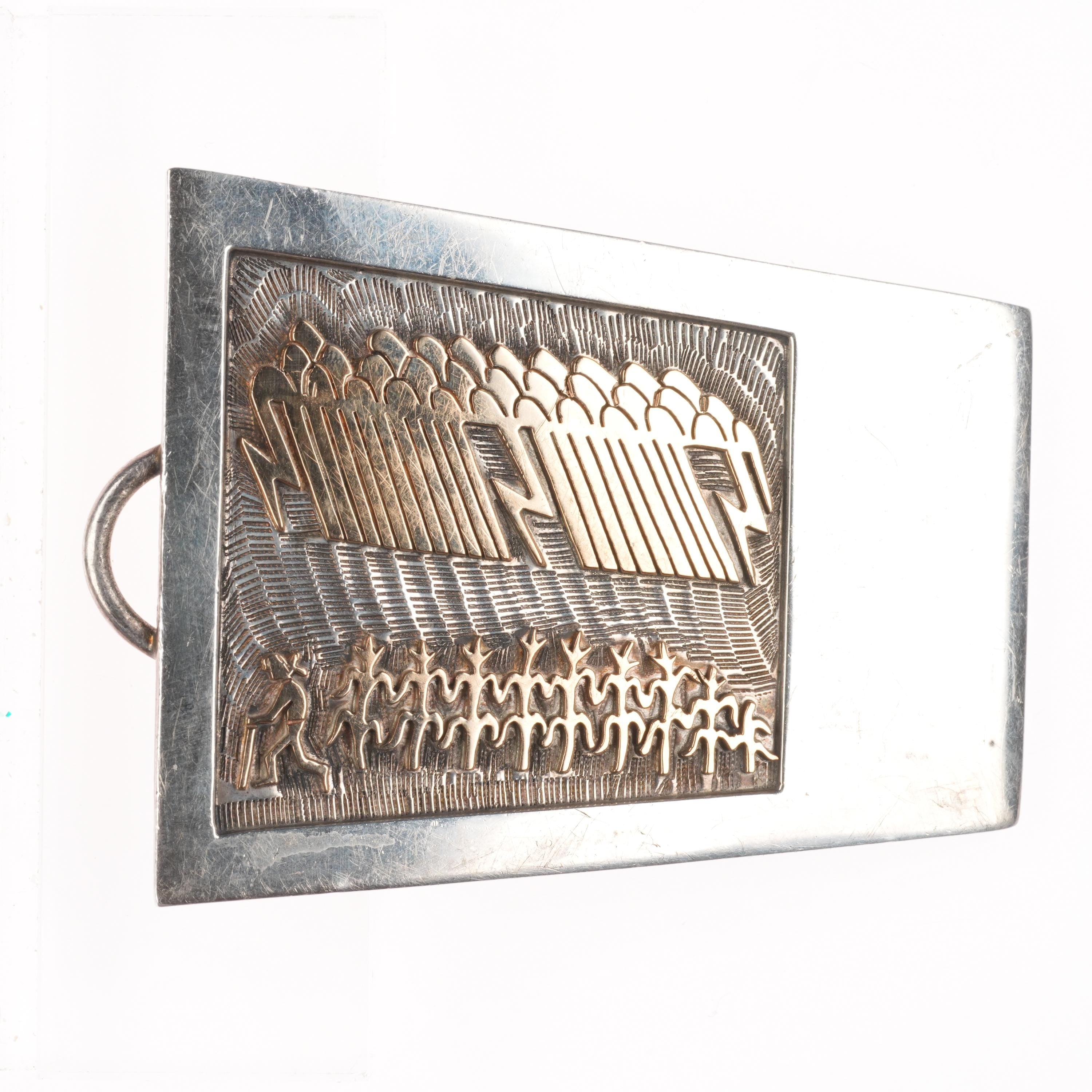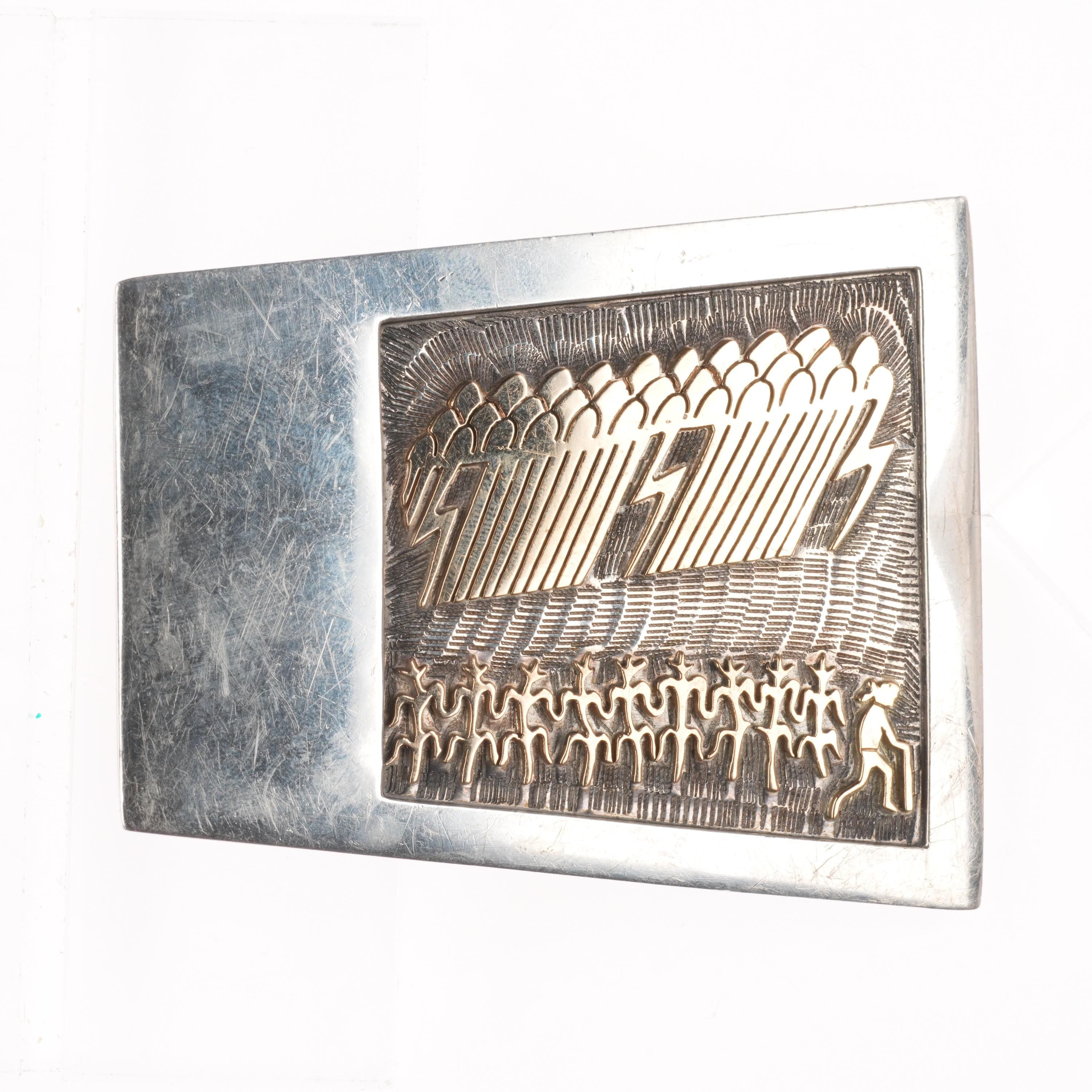 Watson Honanie Hopi 14k gold overlay on sterling silver 3pc belt buckle set. Tested and guaranteed solid sterling silver. Weight and measurements in pictures, circa third quarter of the 20th century. Fits a 1.5" belt. No apparent damage, some expected wear. Much better in person, we have a hard time photographing these types of items properly.