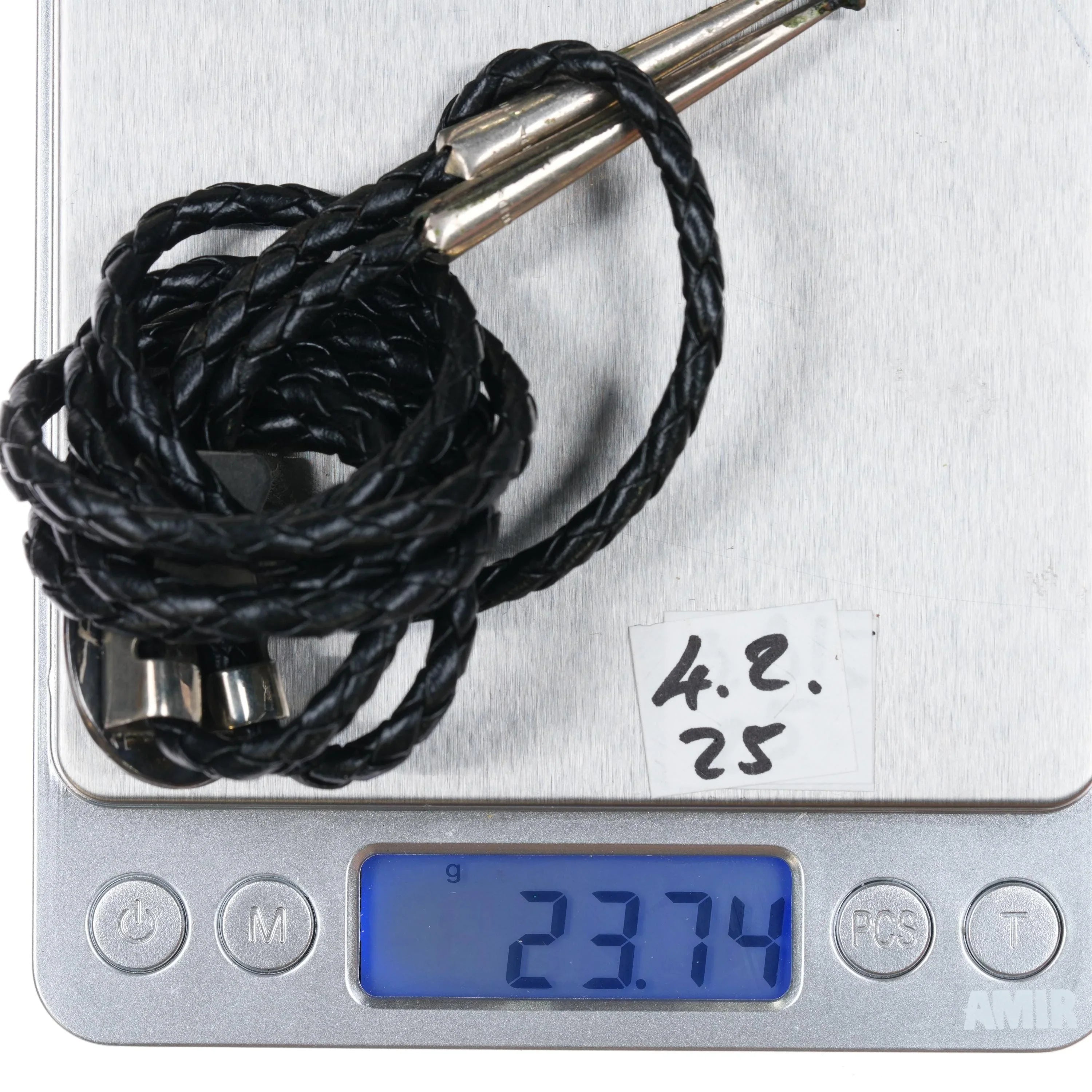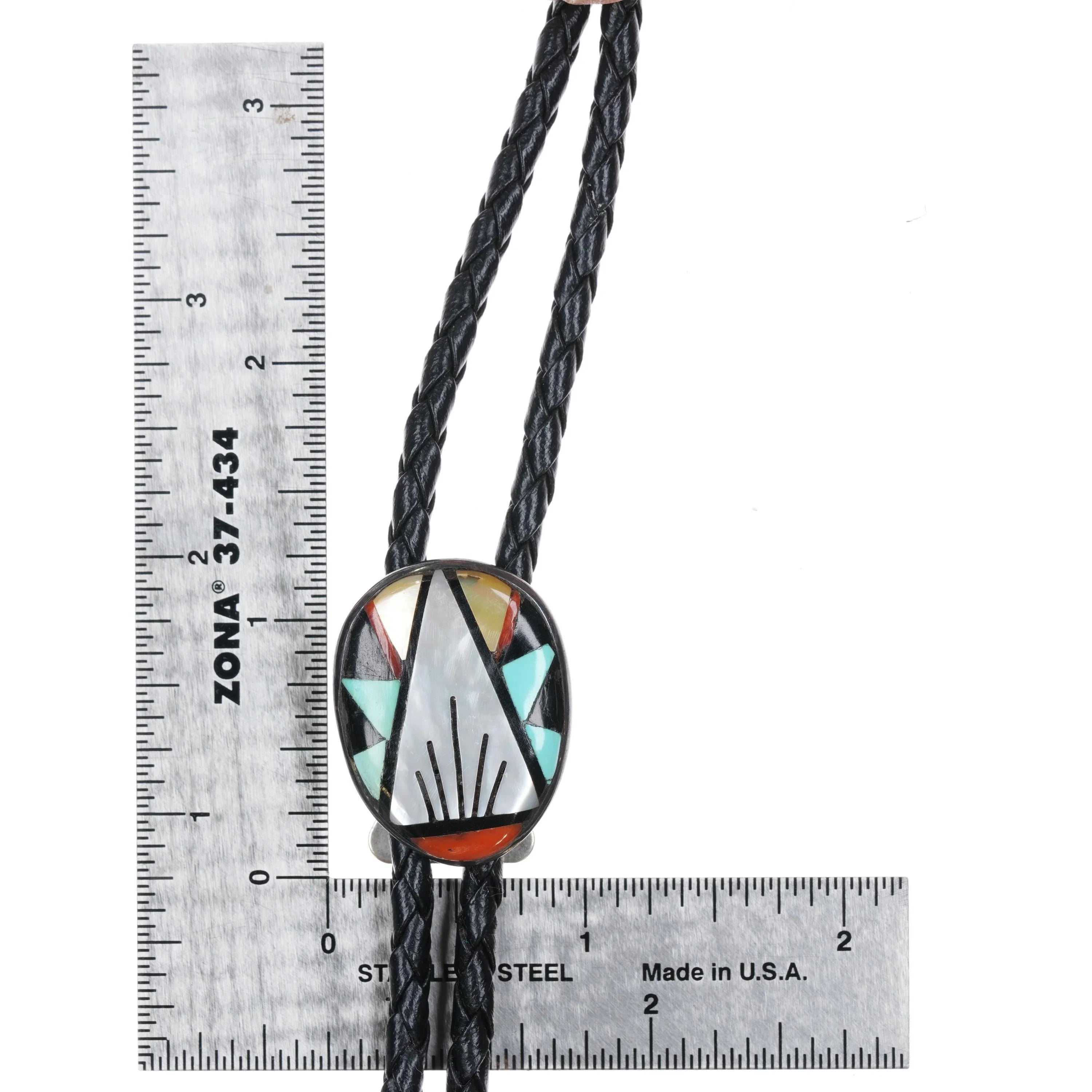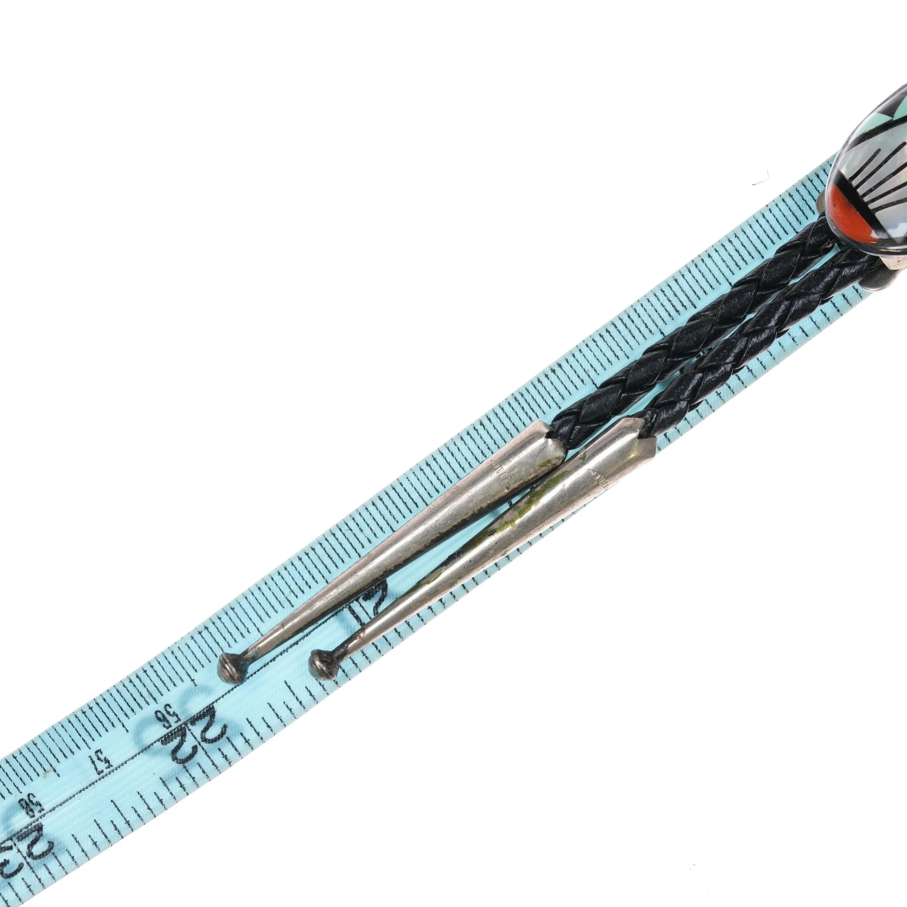 Zuni sterling intarsia inlay bolo tie. Solid sterling silver slide and tips. Weight and measurements in pics. 43" long.. Looks to be signed JOB or JDB.