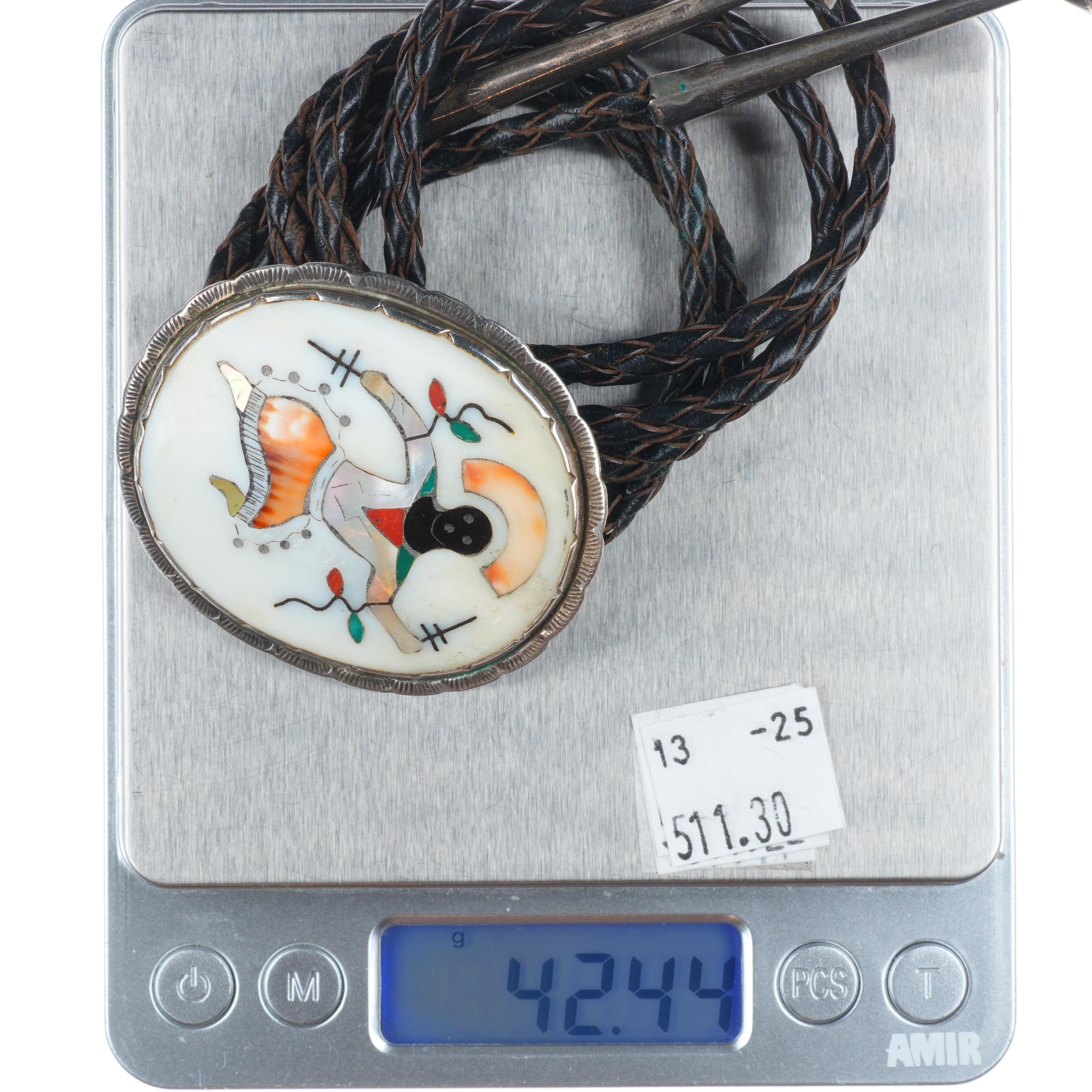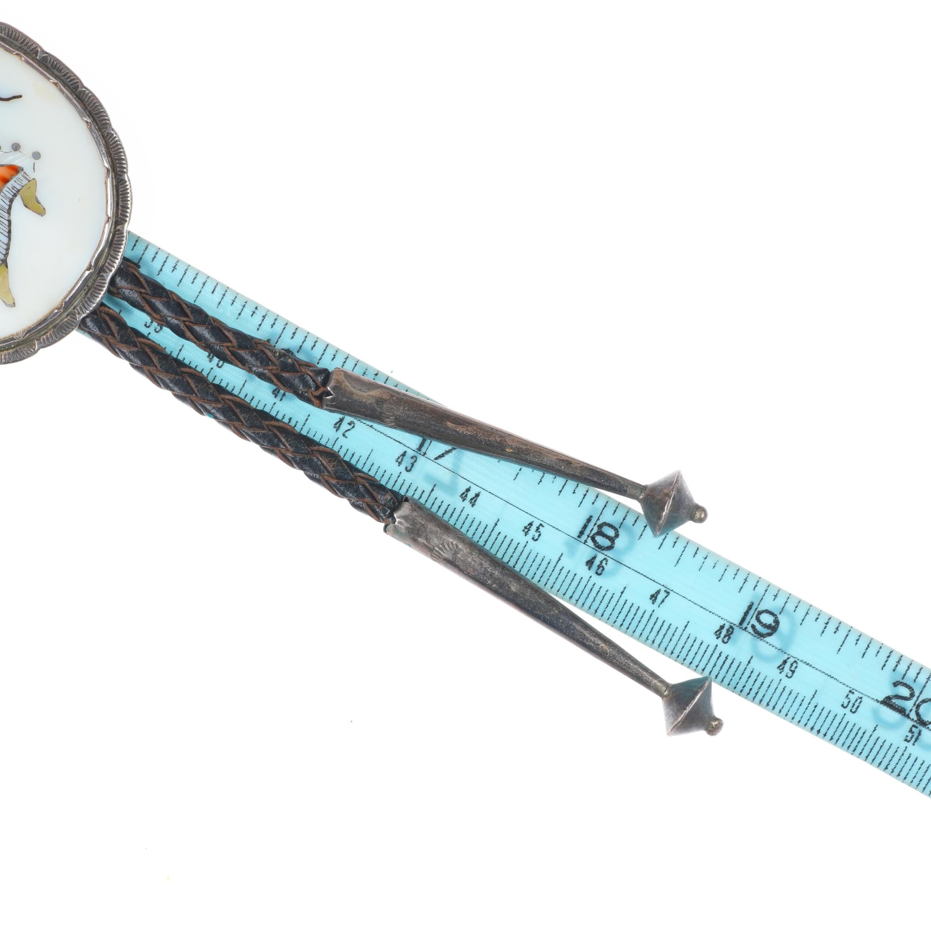1960 c-31 Elliott Qualo Zuni sterling silver intarsia inlay Ghan dancer bolo tie. Tested and guaranteed solid sterling silver slide and tips. Weight and measurements in pictures. Circa third quarter of the 20th century. Unmarked.